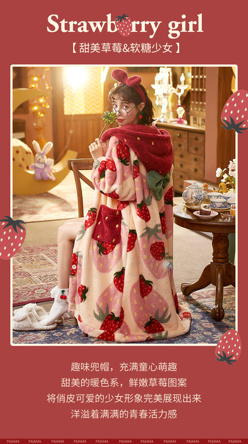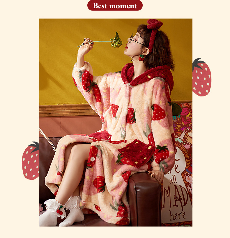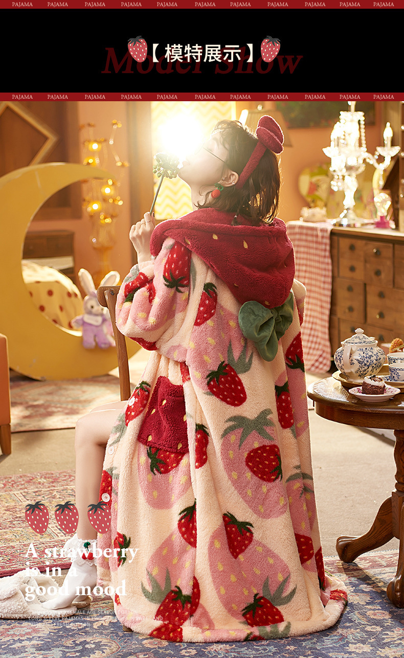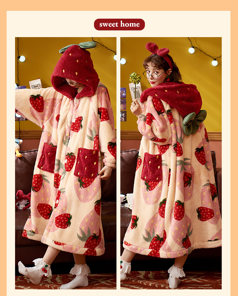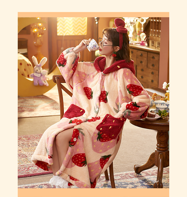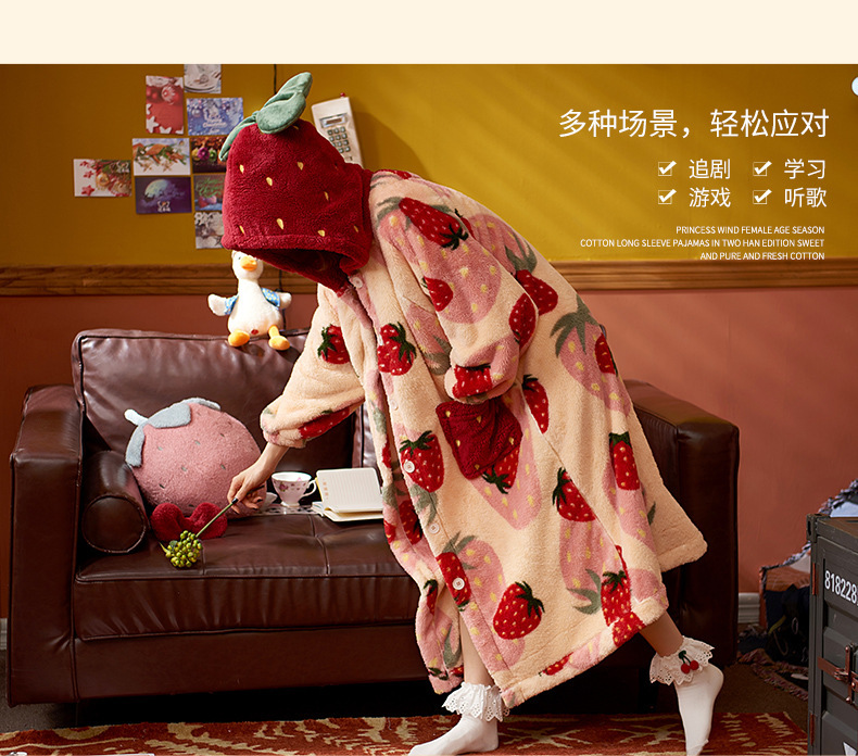 숙녀 플란넬 잠옷 가을과 겨울 패딩 카디건 후드 로브 귀여운 밀짚 베리 코트 공장 도매스토어 가기