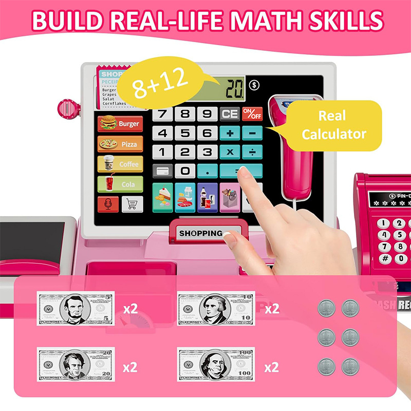 수출 시뮬레이션 핑크 금전 등록기 POS 세트 계산기 어린이 롤 플레잉 하우스 장난감