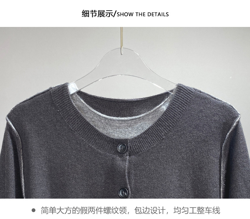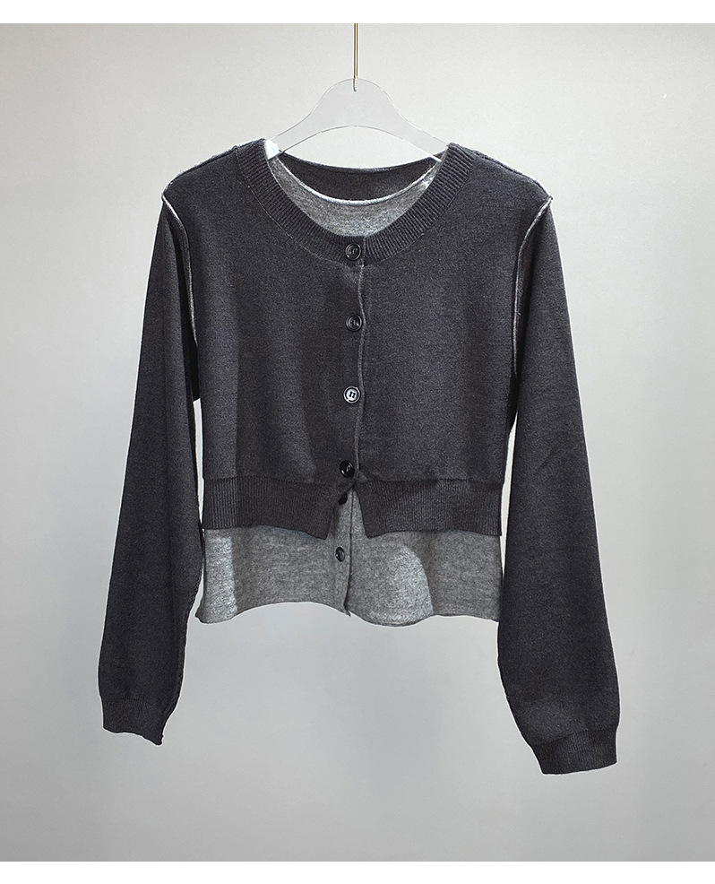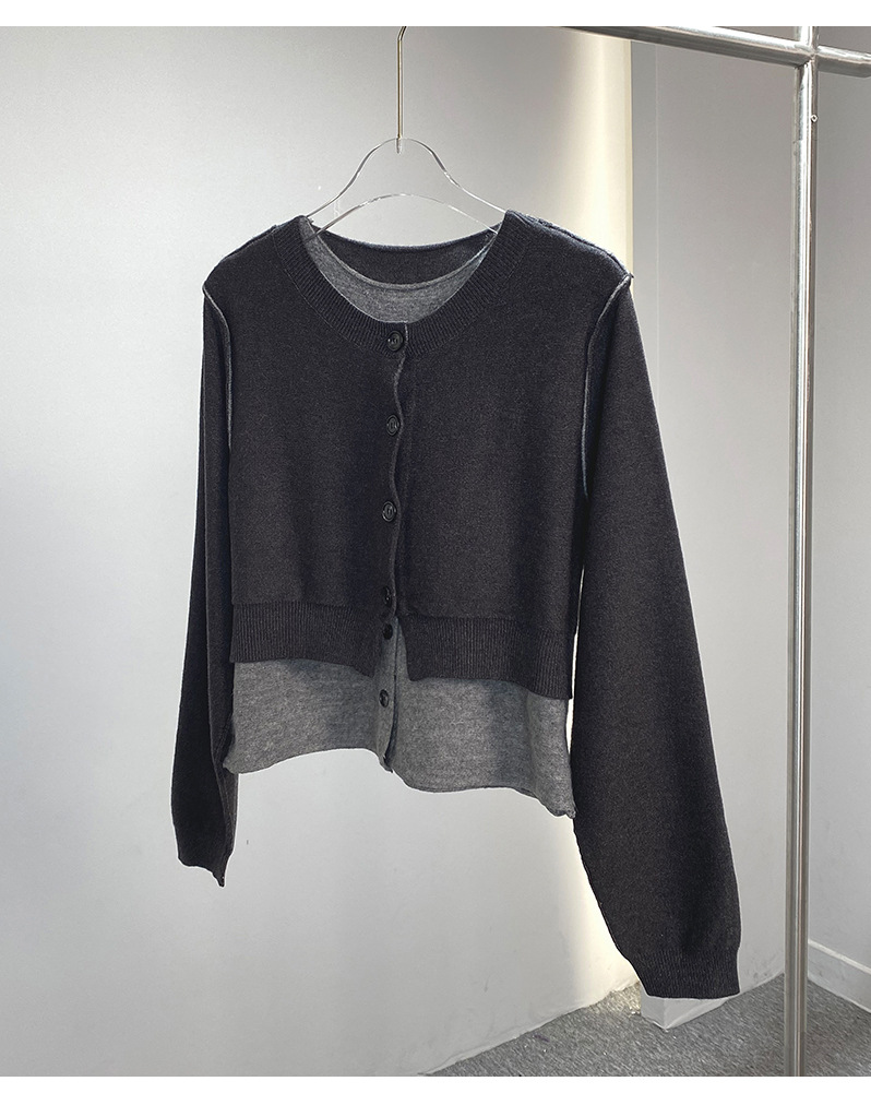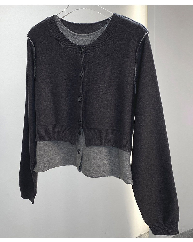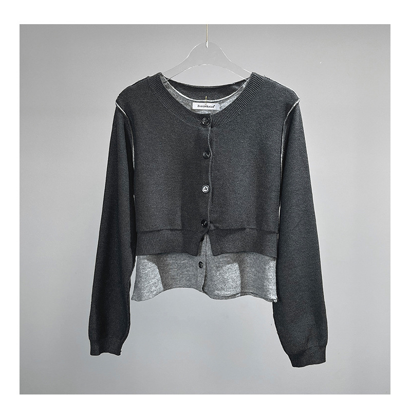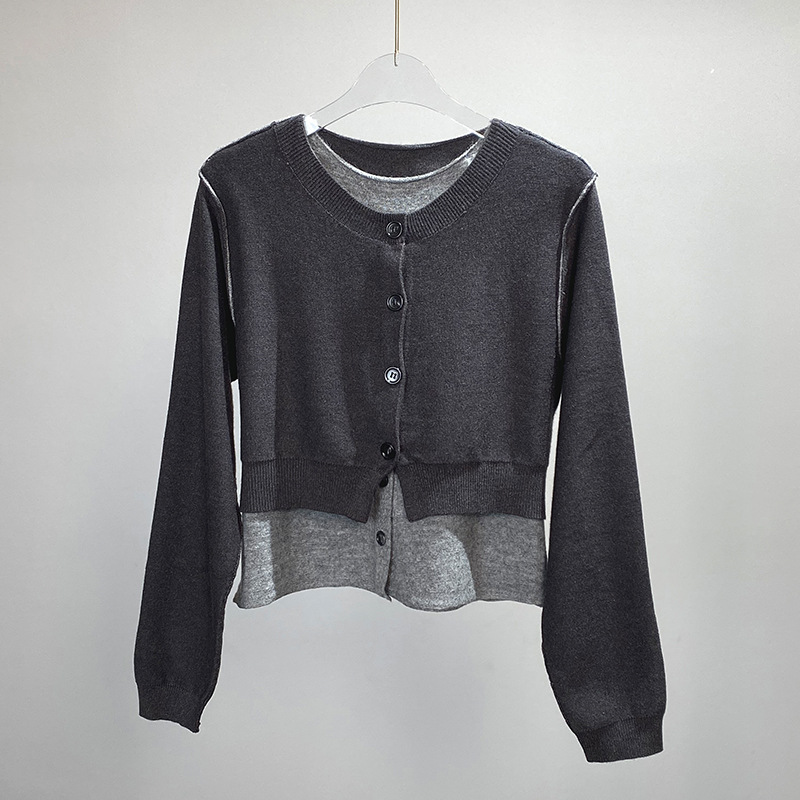 Xiaozhong 2024 가을과 겨울 새로운 디자인 센스 페이크 2 피스 니트 카디건 더블 레이어 짧은 스웨터 라운드 넥 탑