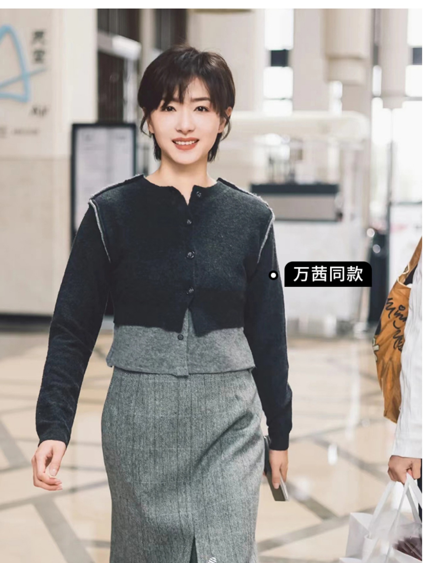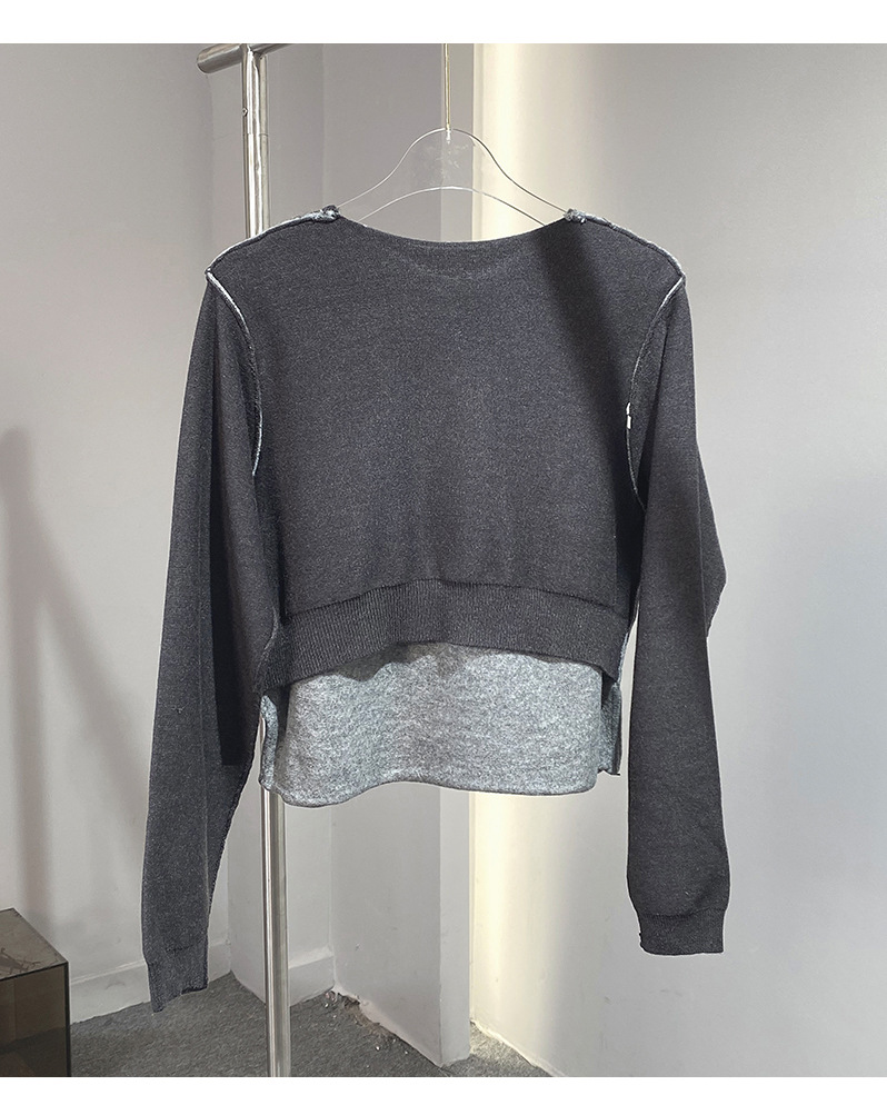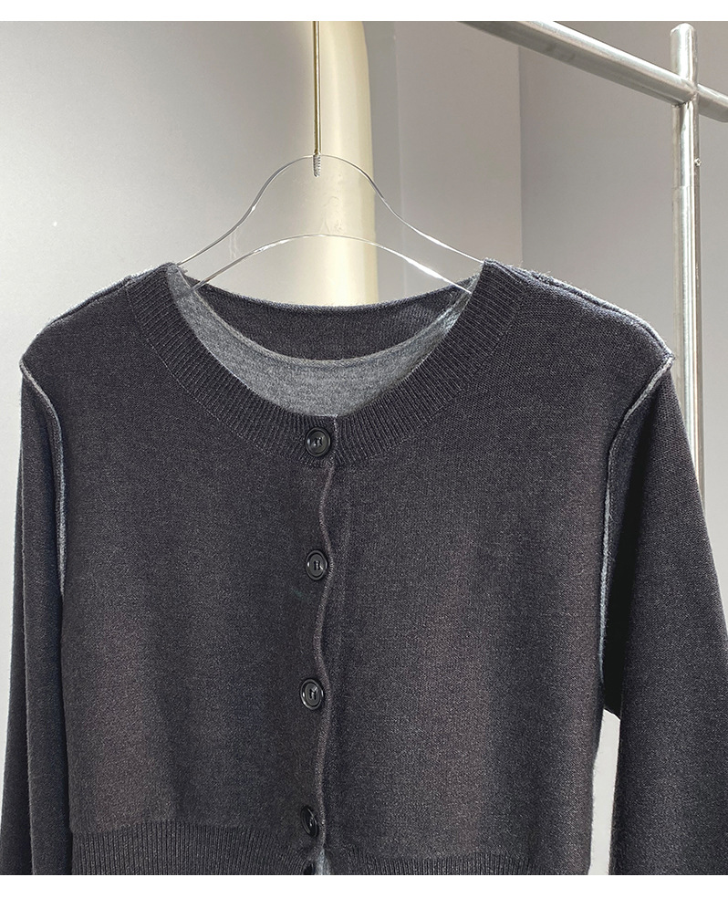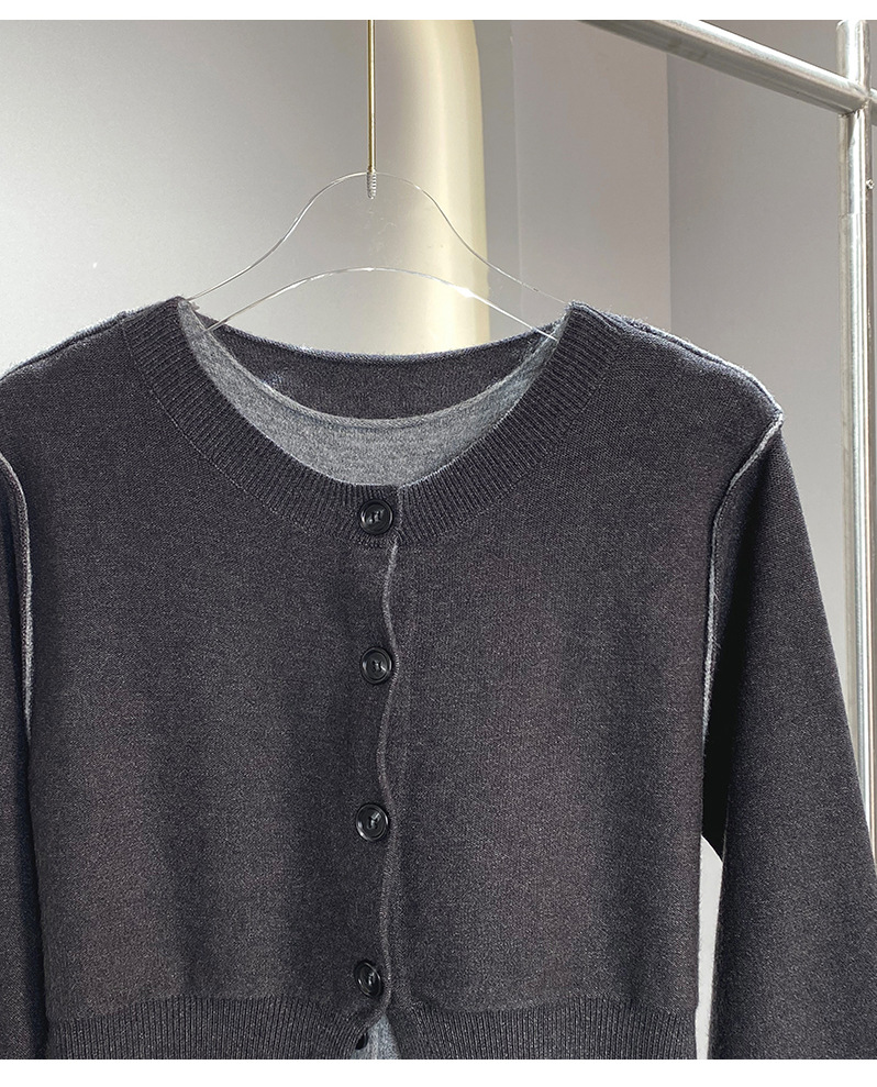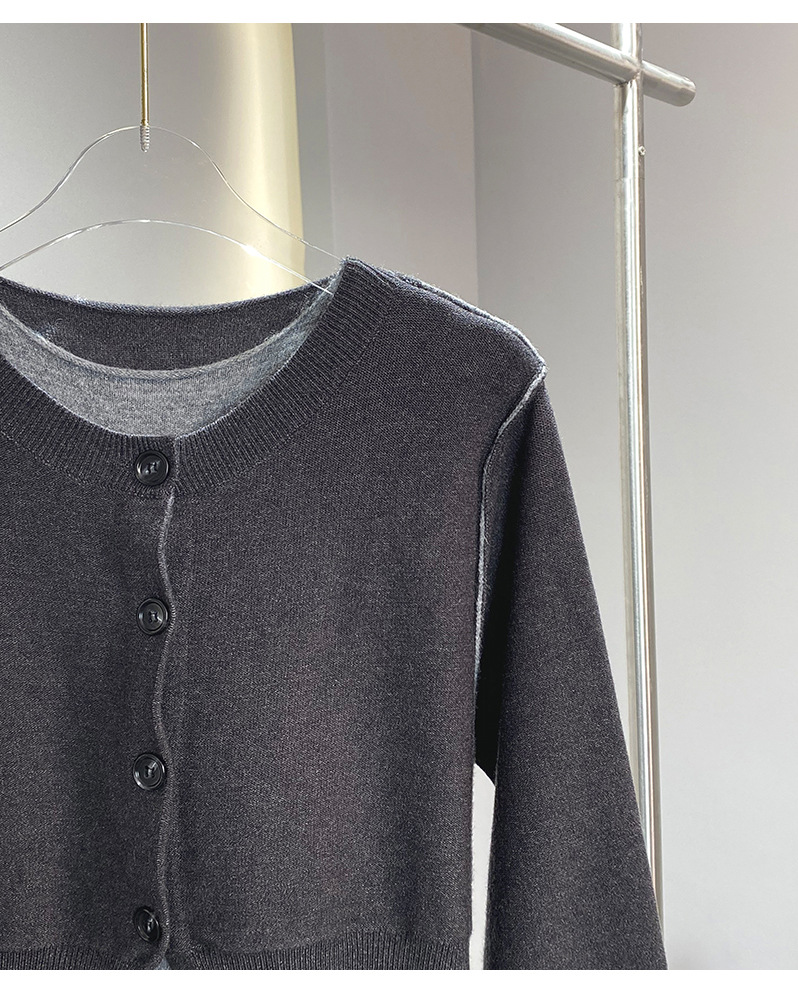 Xiaozhong 2024 가을과 겨울 새로운 디자인 센스 페이크 2 피스 니트 카디건 더블 레이어 짧은 스웨터 라운드 넥 탑