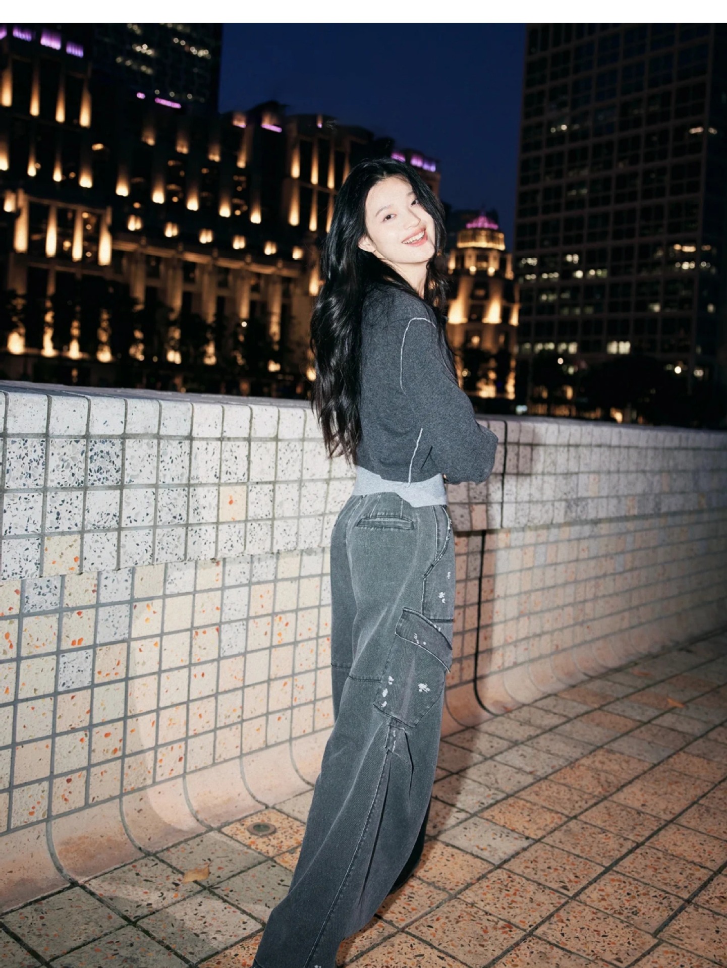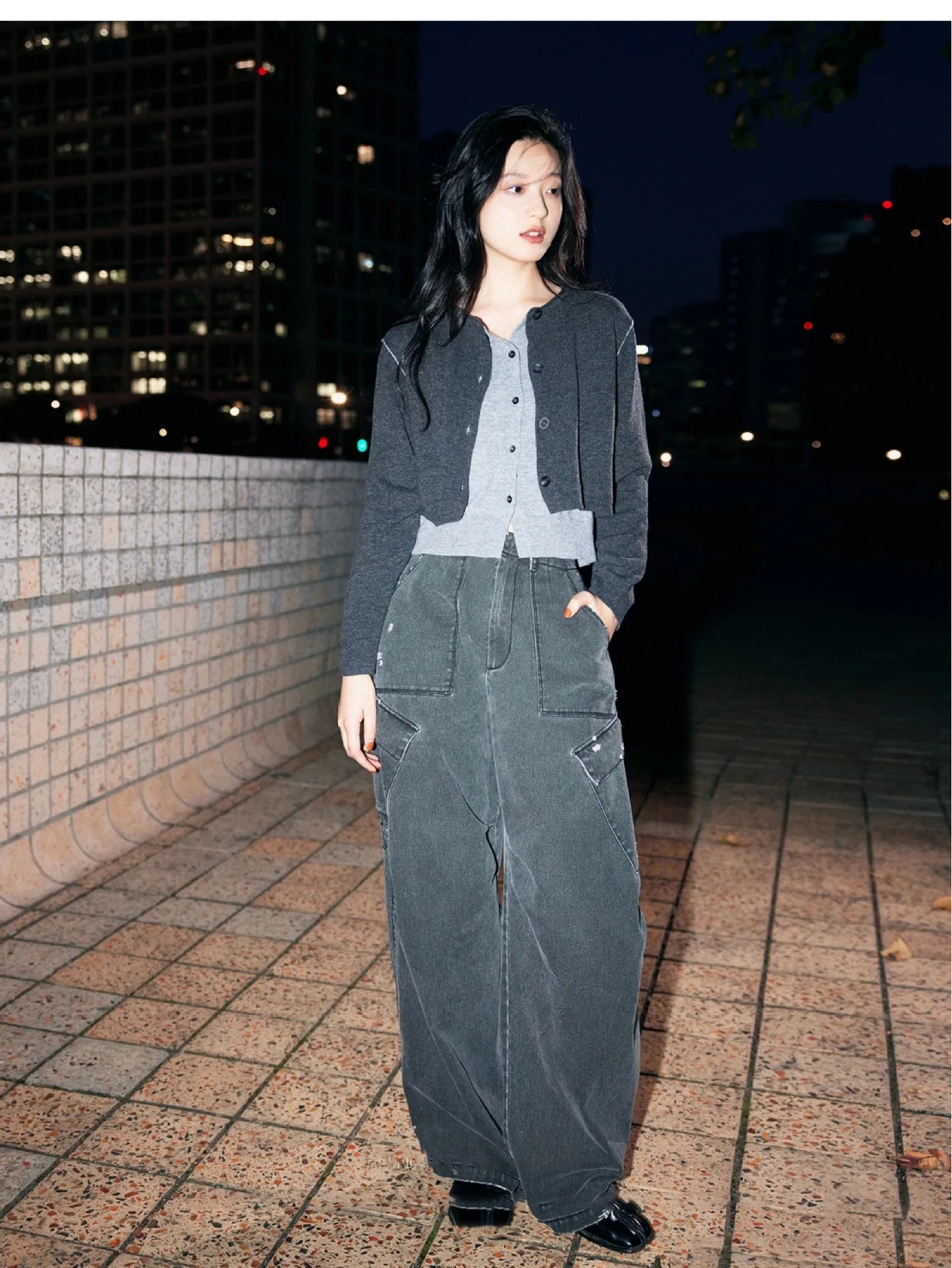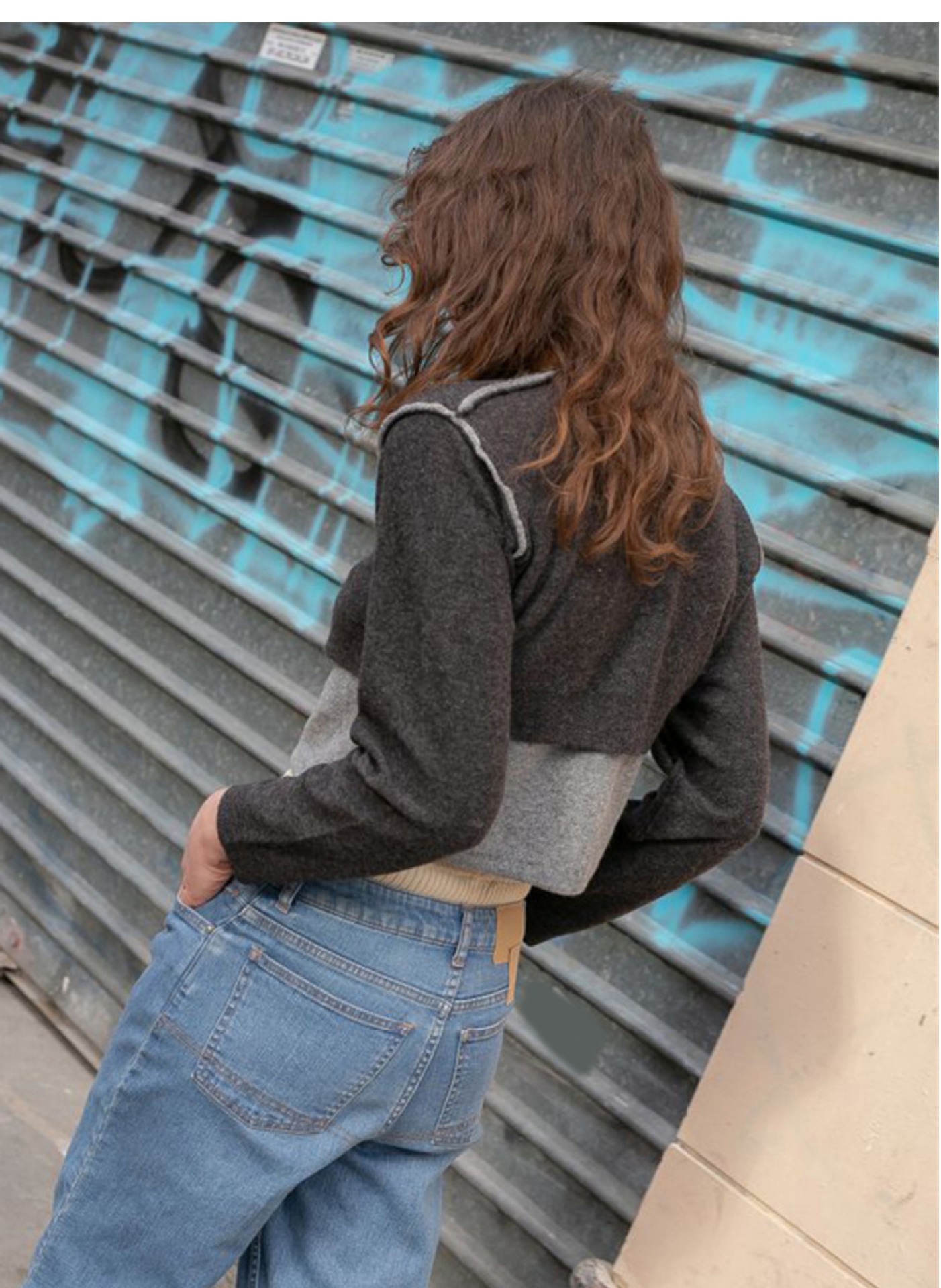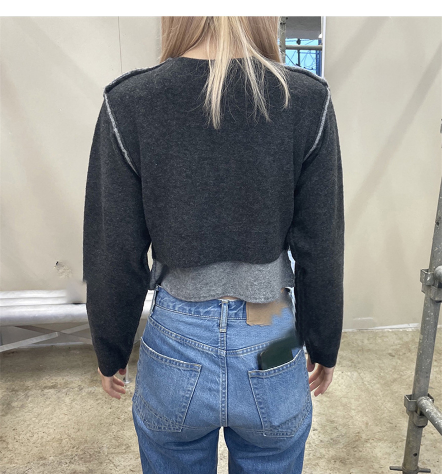Xiaozhong 2024 가을과 겨울 새로운 디자인 센스 페이크 2 피스 니트 카디건 더블 레이어 짧은 스웨터 라운드 넥 탑