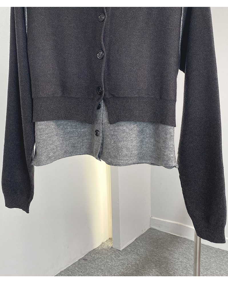Xiaozhong 2024 가을과 겨울 새로운 디자인 센스 페이크 2 피스 니트 카디건 더블 레이어 짧은 스웨터 라운드 넥 탑스토어 가기