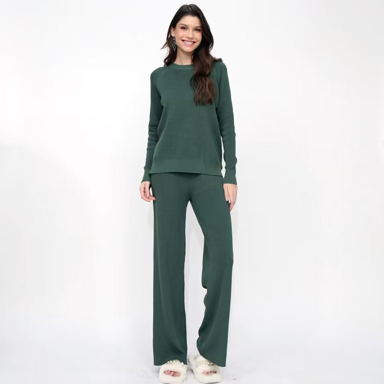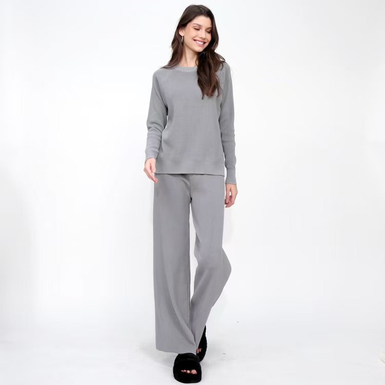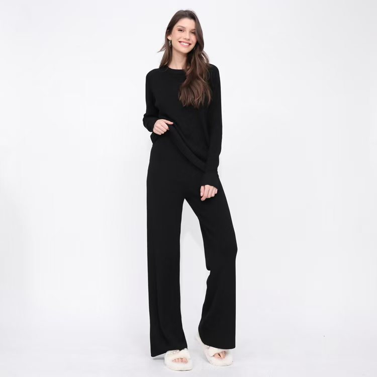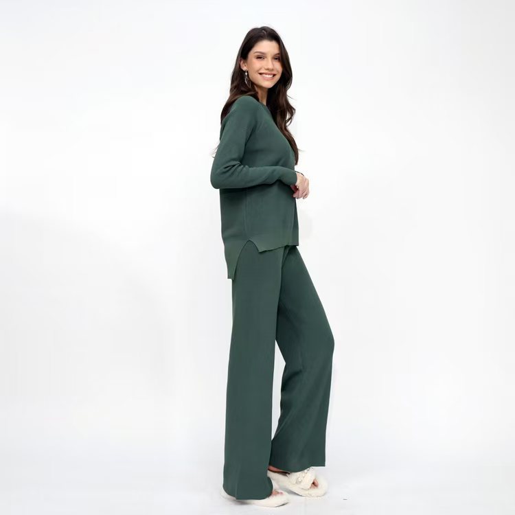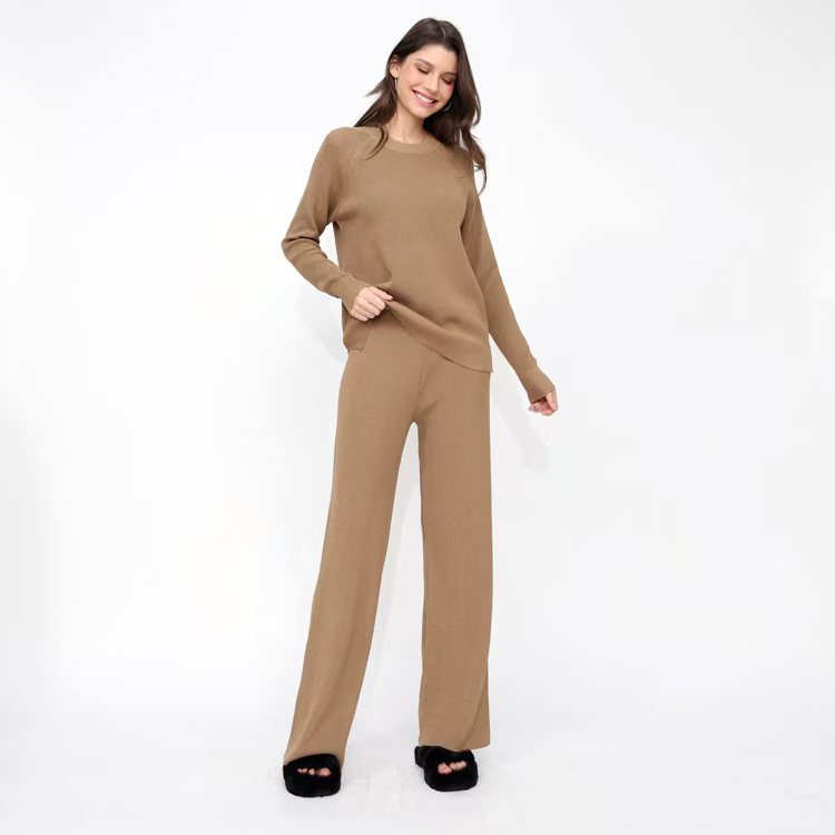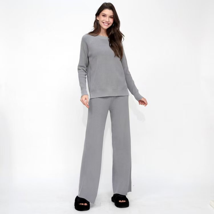 2024 겨울 새로운 두꺼운 스웨터 세트 여성용 느슨한 니트 긴팔 둥근 목 유행 넓은 다리 바지 2 피스 세트