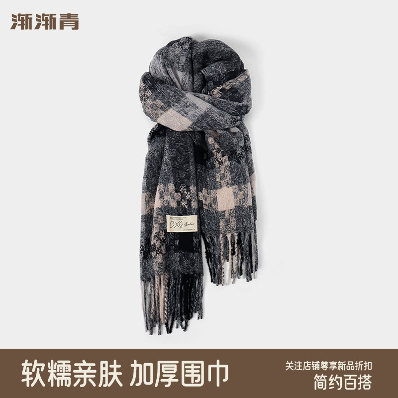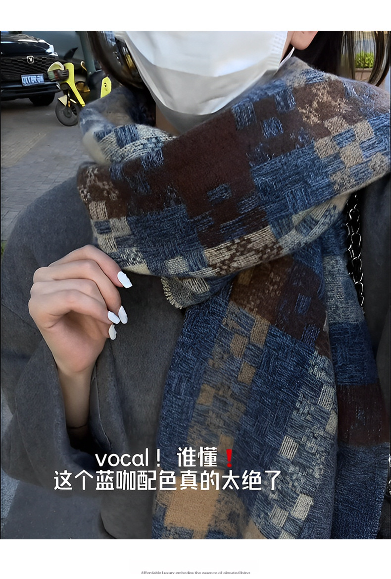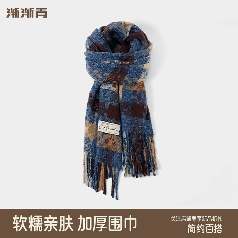 격자 무늬 스카프 여자 겨울 2024 새로운 한국식 분위기 센스 블루 체크 무늬 목도리 목 보호 따뜻한 올 매치 스카프