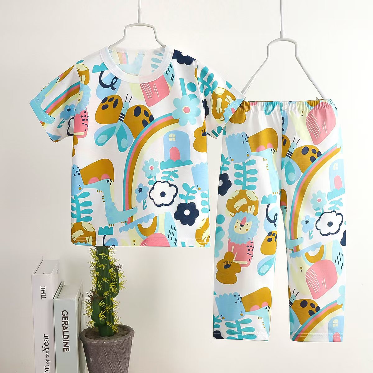 어린이 홈 의류 2025 여름 새로운 한국 만화 귀여운 소년 소녀 짧은 소매 바지 홈 세트 도매