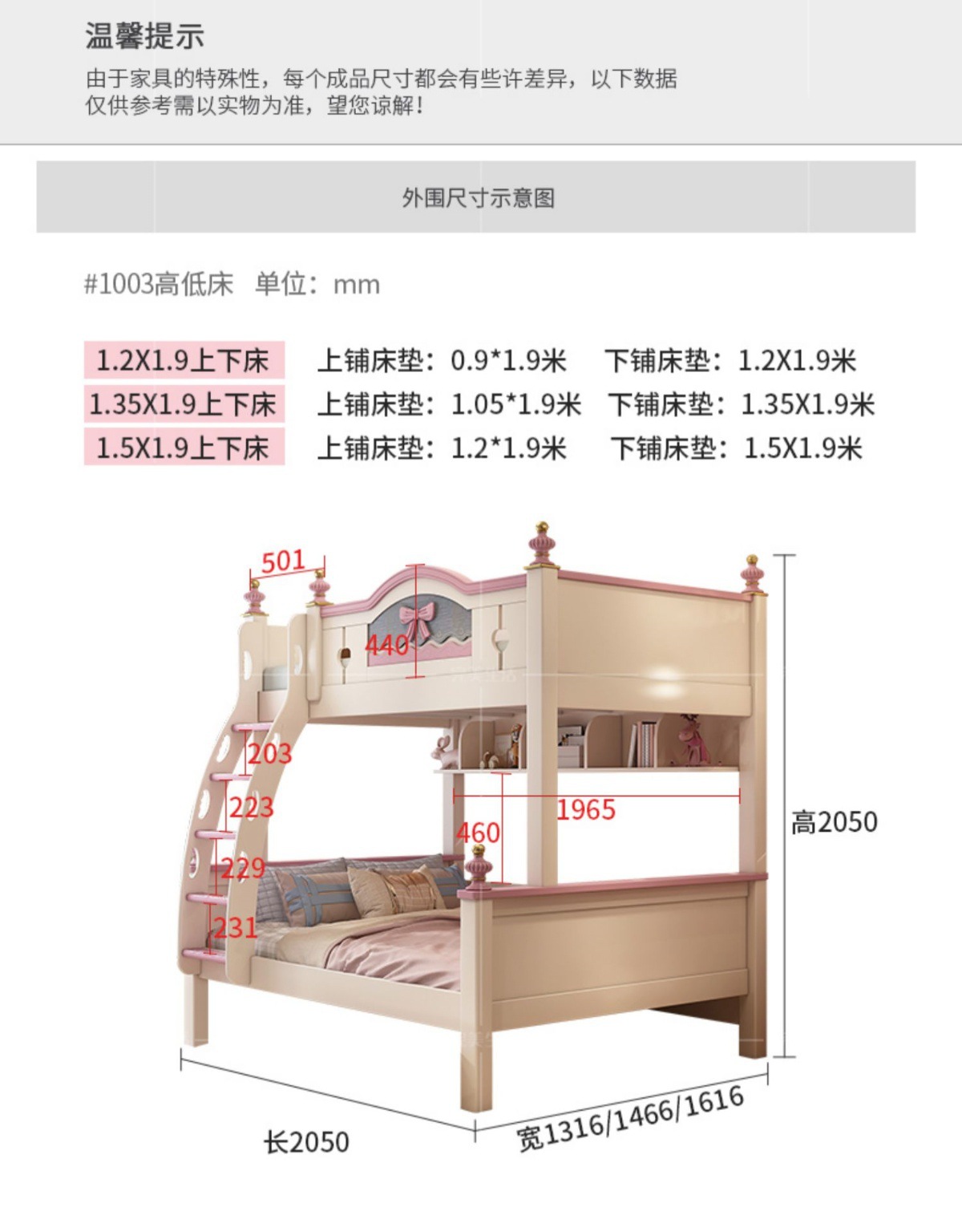 • 높고 낮은 침대에는 상단 및 하단 매트리스가 함께 제공됩니다. 1003