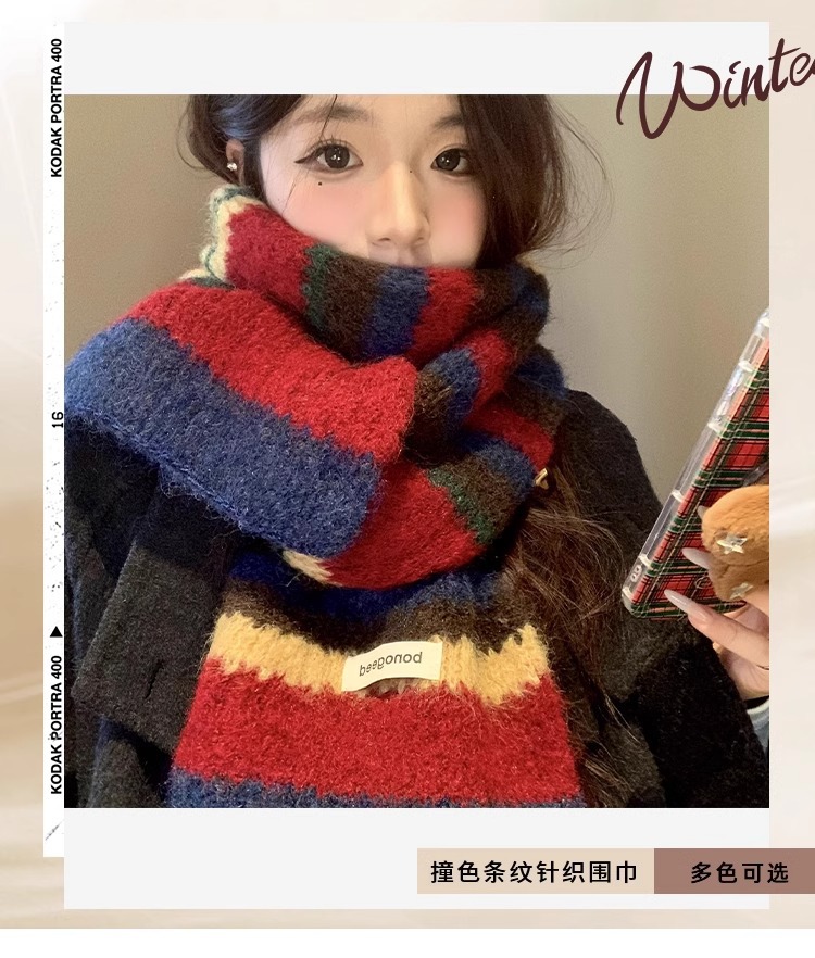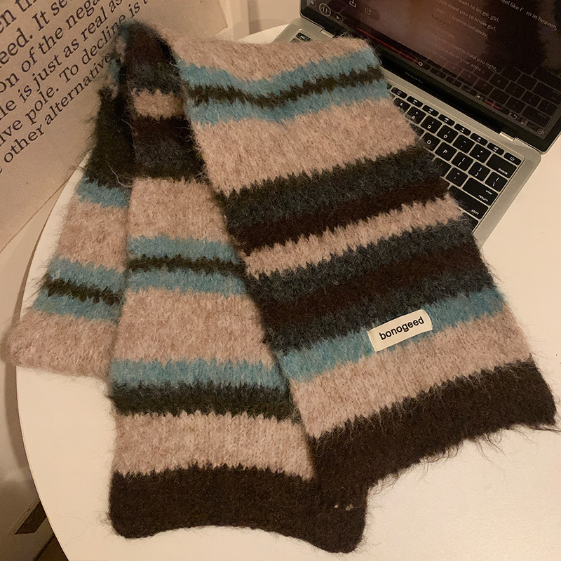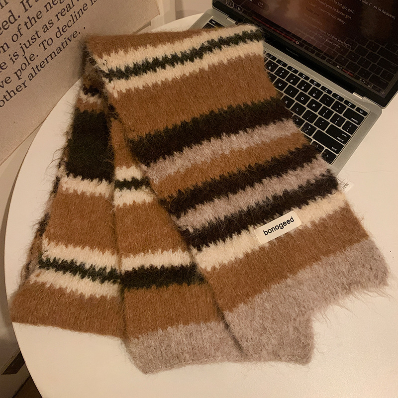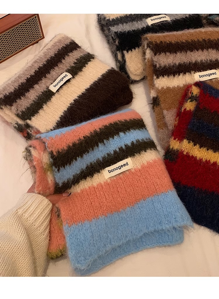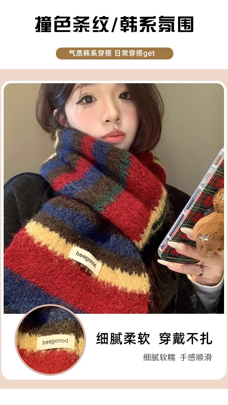 모조 캐시미어 소프트 왁스 스트라이프 니트 스카프 여자 가을 겨울 2024 한국식 분위기 두꺼운 따뜻한 올 매치 스카프