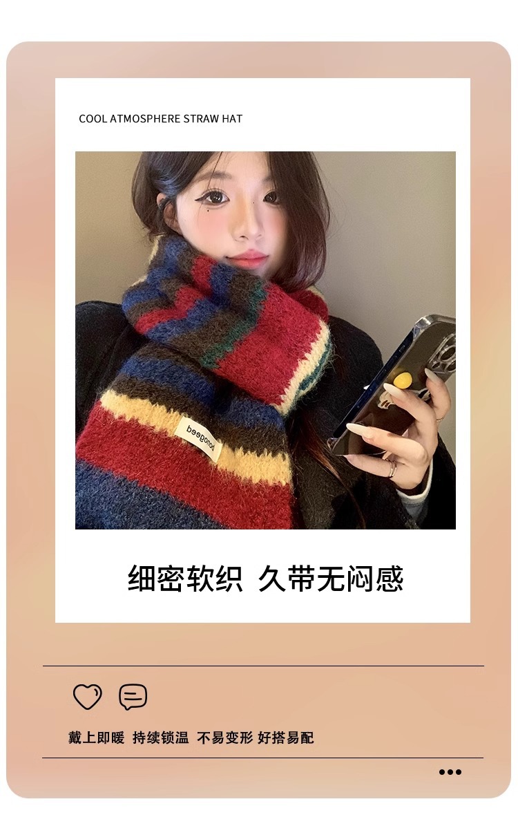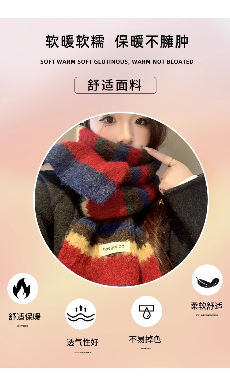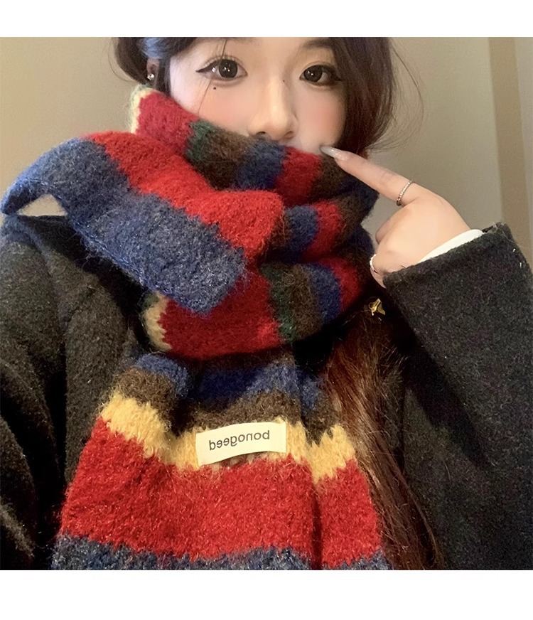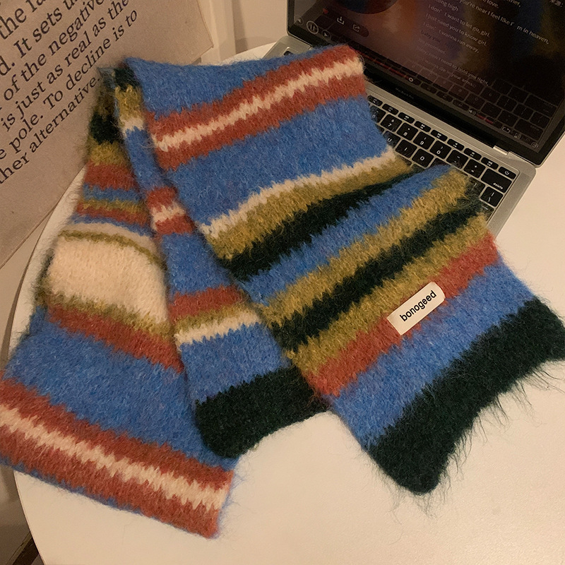 모조 캐시미어 소프트 왁스 스트라이프 니트 스카프 여자 가을 겨울 2024 한국식 분위기 두꺼운 따뜻한 올 매치 스카프