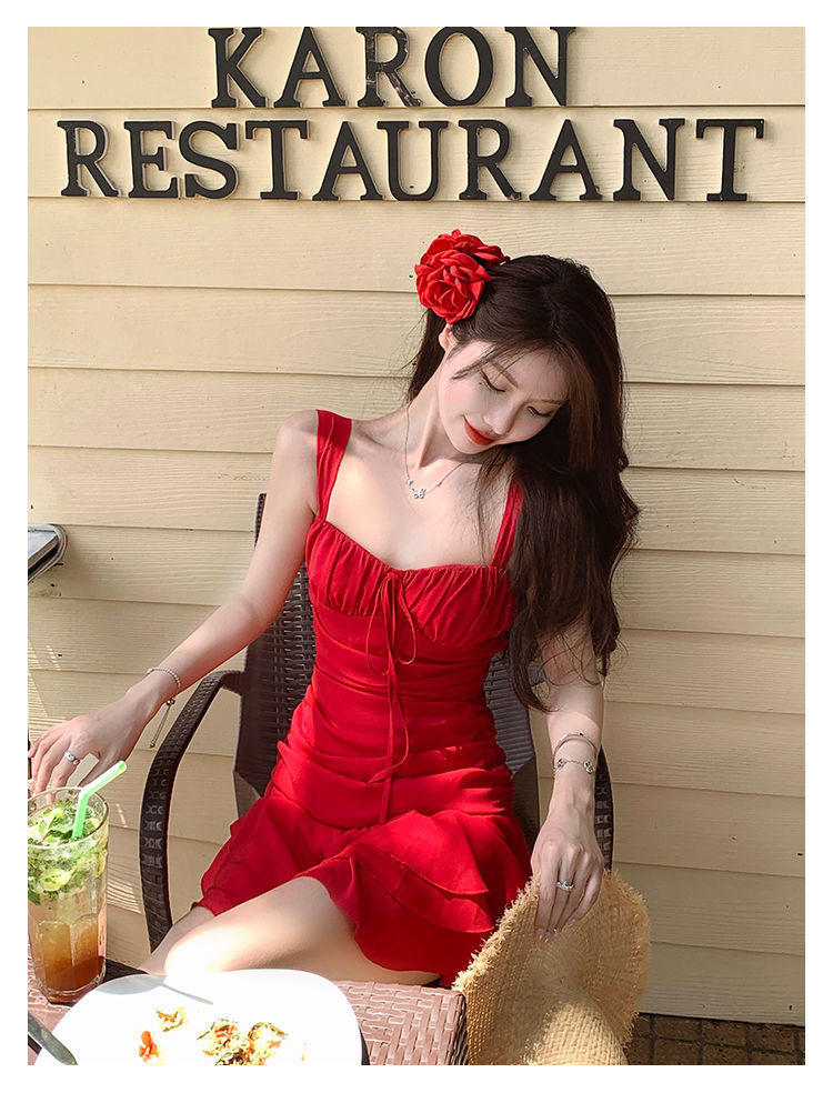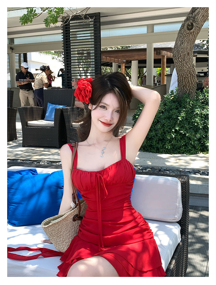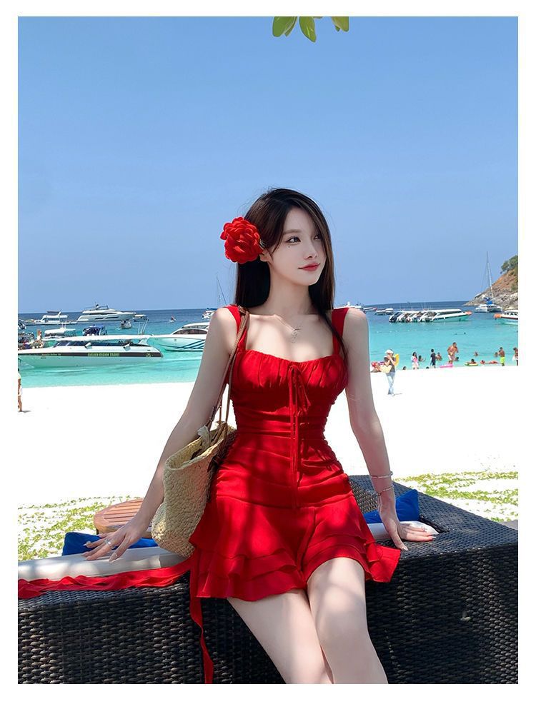 밝은 여름 2024 새로운 수영복 여성 여름 흰색 해변 휴가 작은 빨간 원피스 원피스 온천 수영복