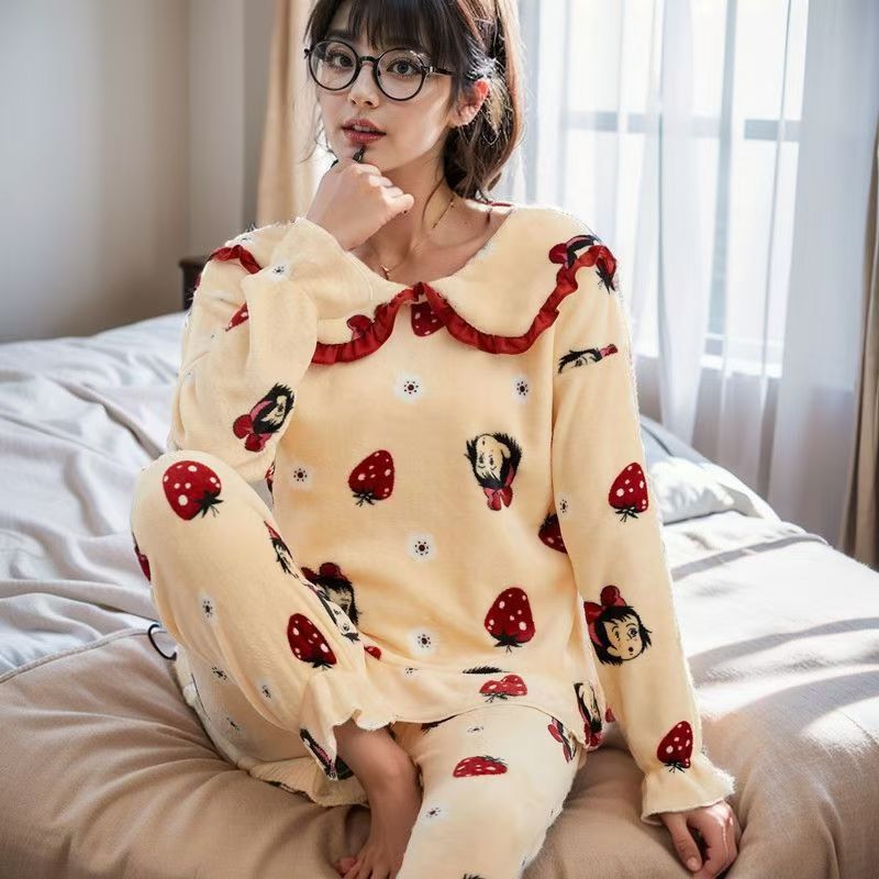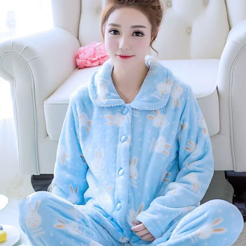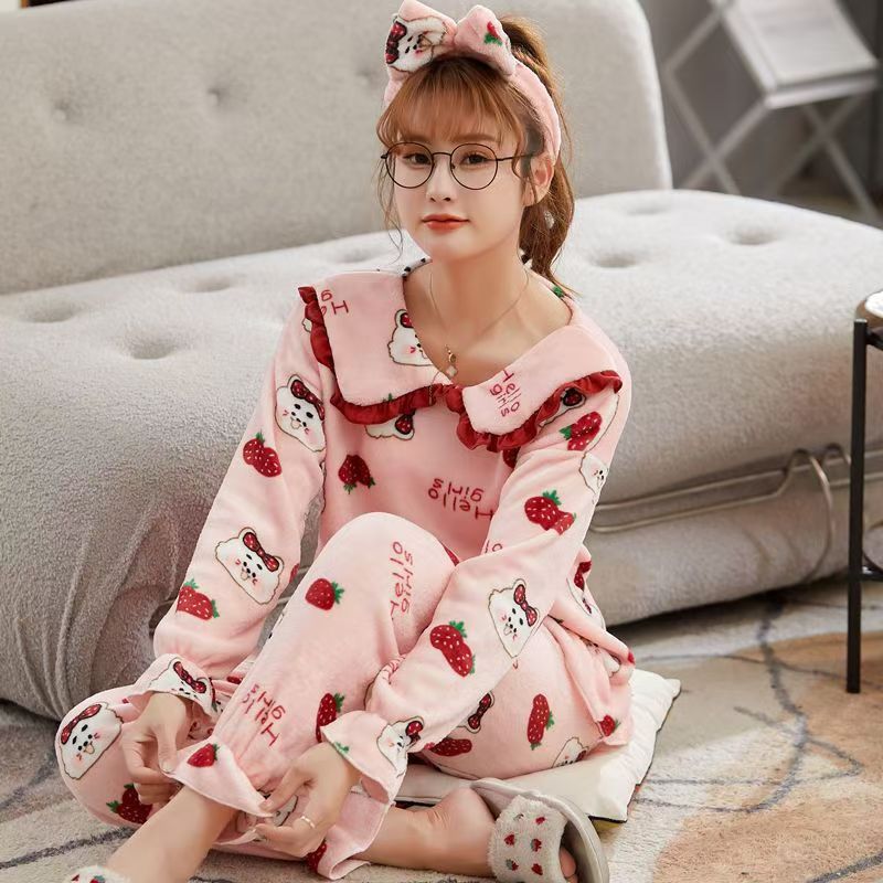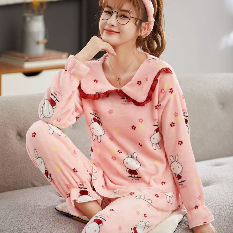 가을과 겨울 플란넬 파자마 여성의 기모 따뜻한 잠옷 여성의 겨울 긴 소매 산호 양털 여성용 홈 의류 세트