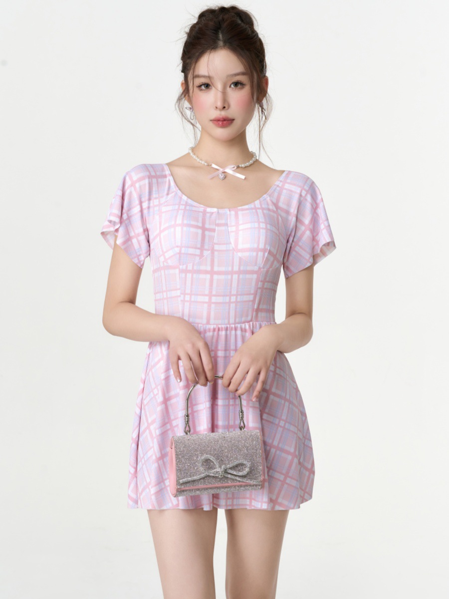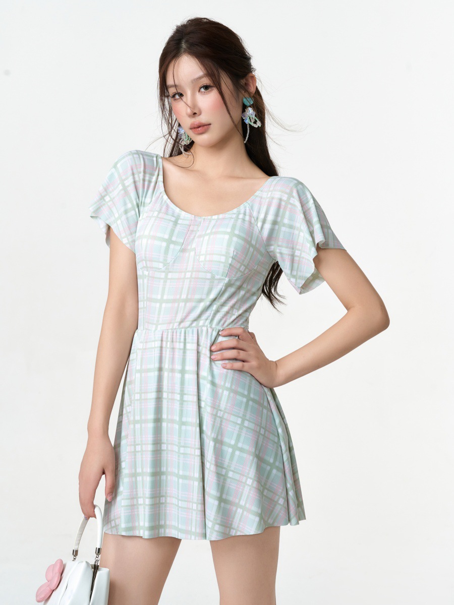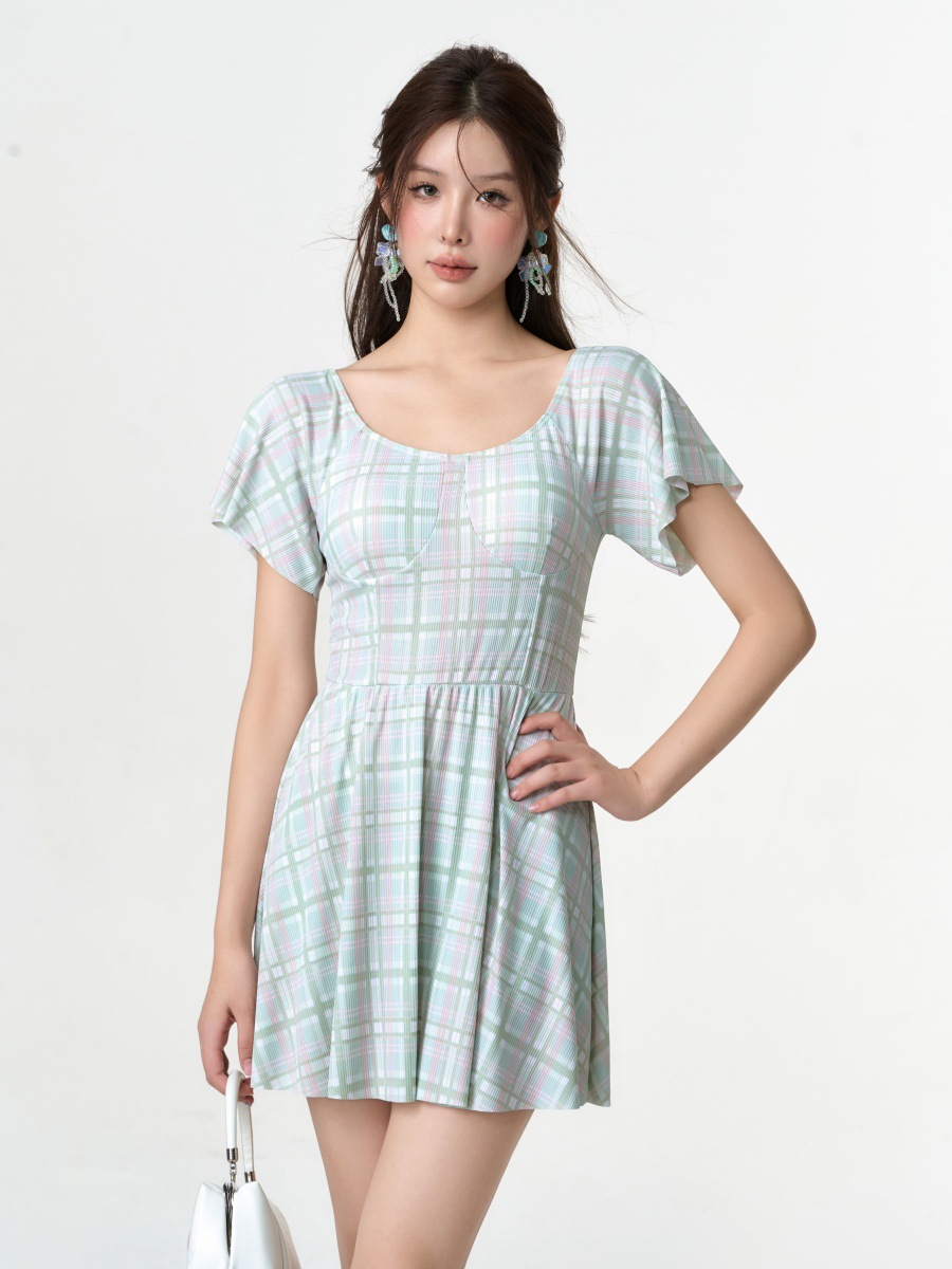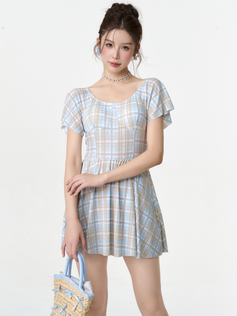 공장 직접 새로운 격자 무늬 원피스 수영복 프랑스 여성의 허리 슬리밍 고기 커버 원피스 격자 무늬 수영복 도매스토어 가기