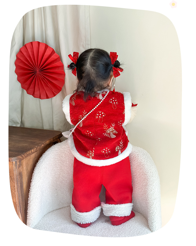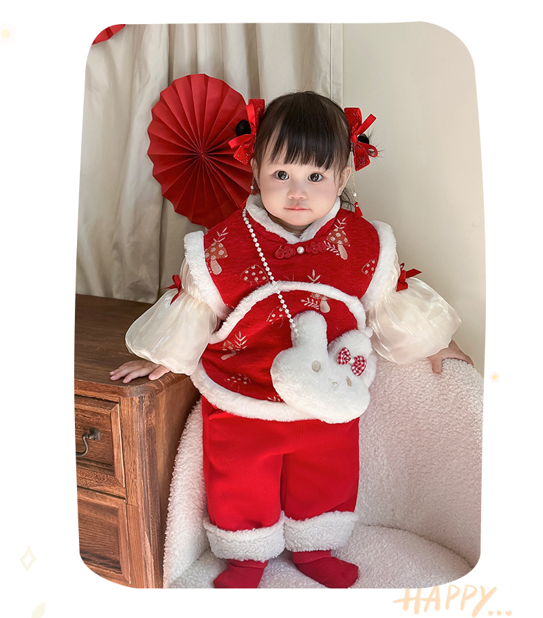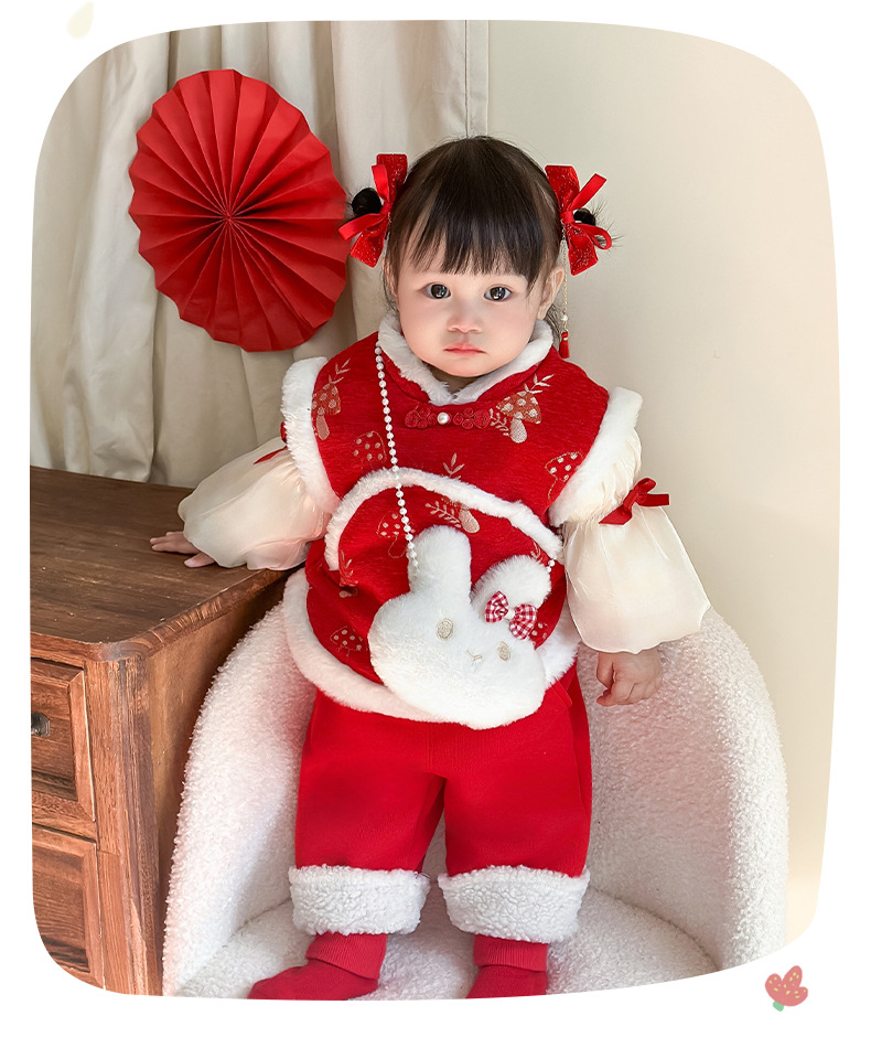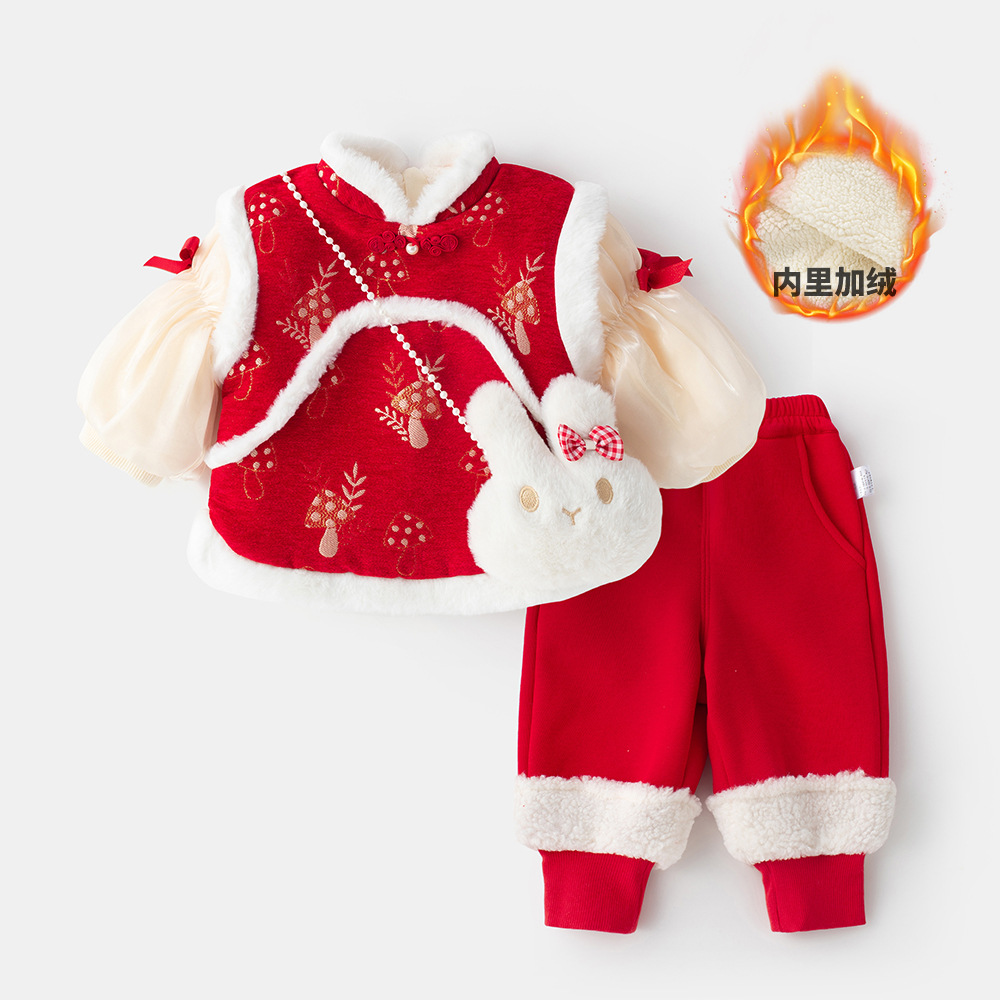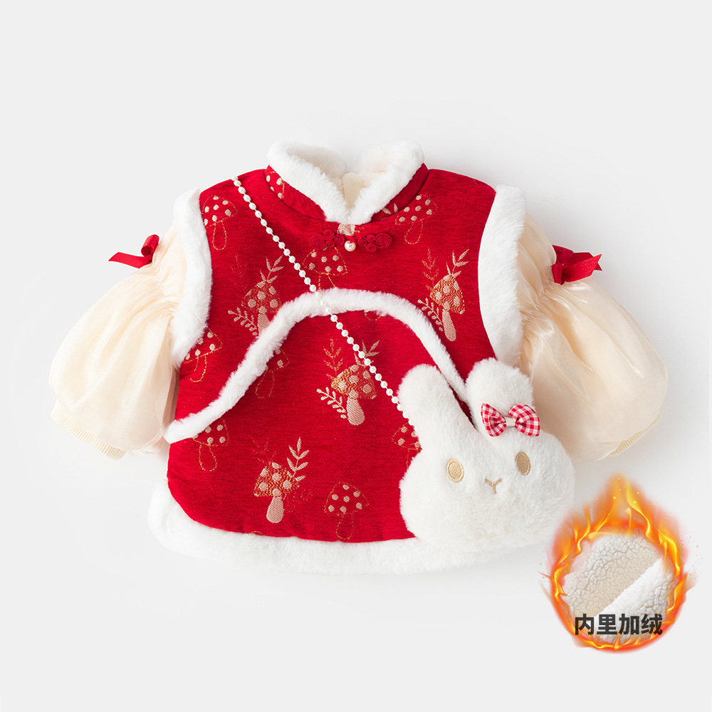 2024 년 아기 소녀 아기 기모 외국식 토끼 탑 세트 3971 가을과 겨울 소녀 따뜻한 외부 착용 투피스 세트