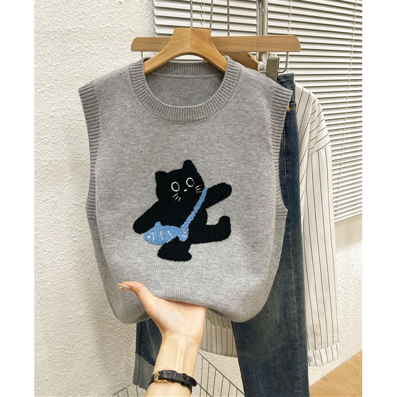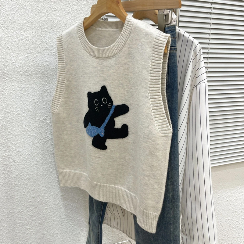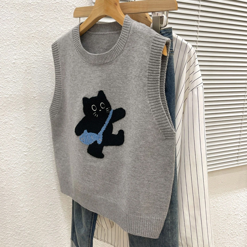 라운드 넥 만화 새끼 고양이 니트 조끼 스웨터 2025 가을, 겨울 새로운 한국 스타일 여성 스웨터 탑스토어 가기