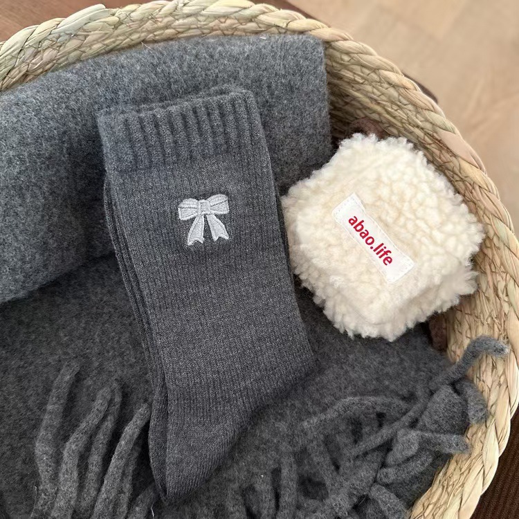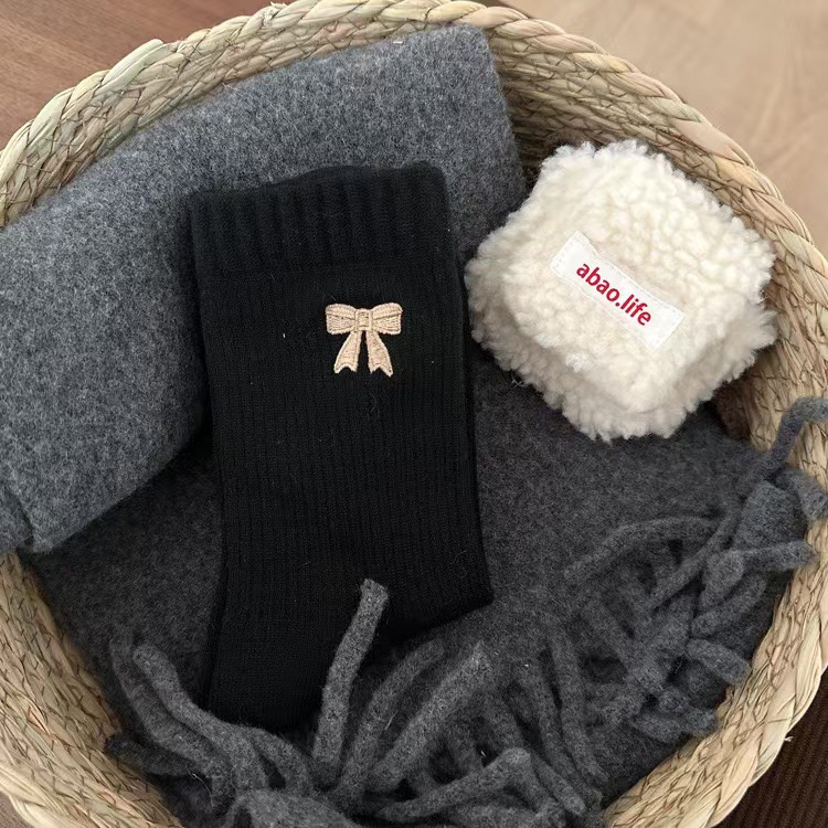 Bowknot 양말 여성 가을 겨울 한국 스타일 Ins 따뜻한 벨벳 빈티지 미드 튜브 양말 다크 브라운 스타일 여성용 미드 튜브 양말