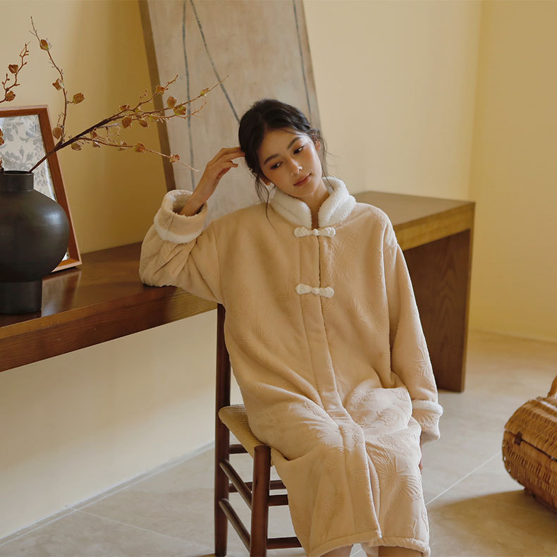 가을과 겨울 기모 두꺼운 복고풍 우아한 나비 자카드 복합 벨벳 버클 칼라 중화 민국 스타일 잠옷 세트스토어 가기