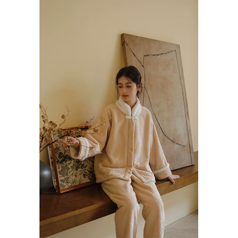 가을과 겨울 기모 두꺼운 복고풍 우아한 나비 자카드 복합 벨벳 버클 칼라 중화 민국 스타일 잠옷 세트