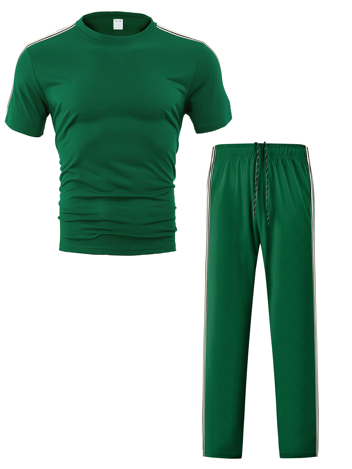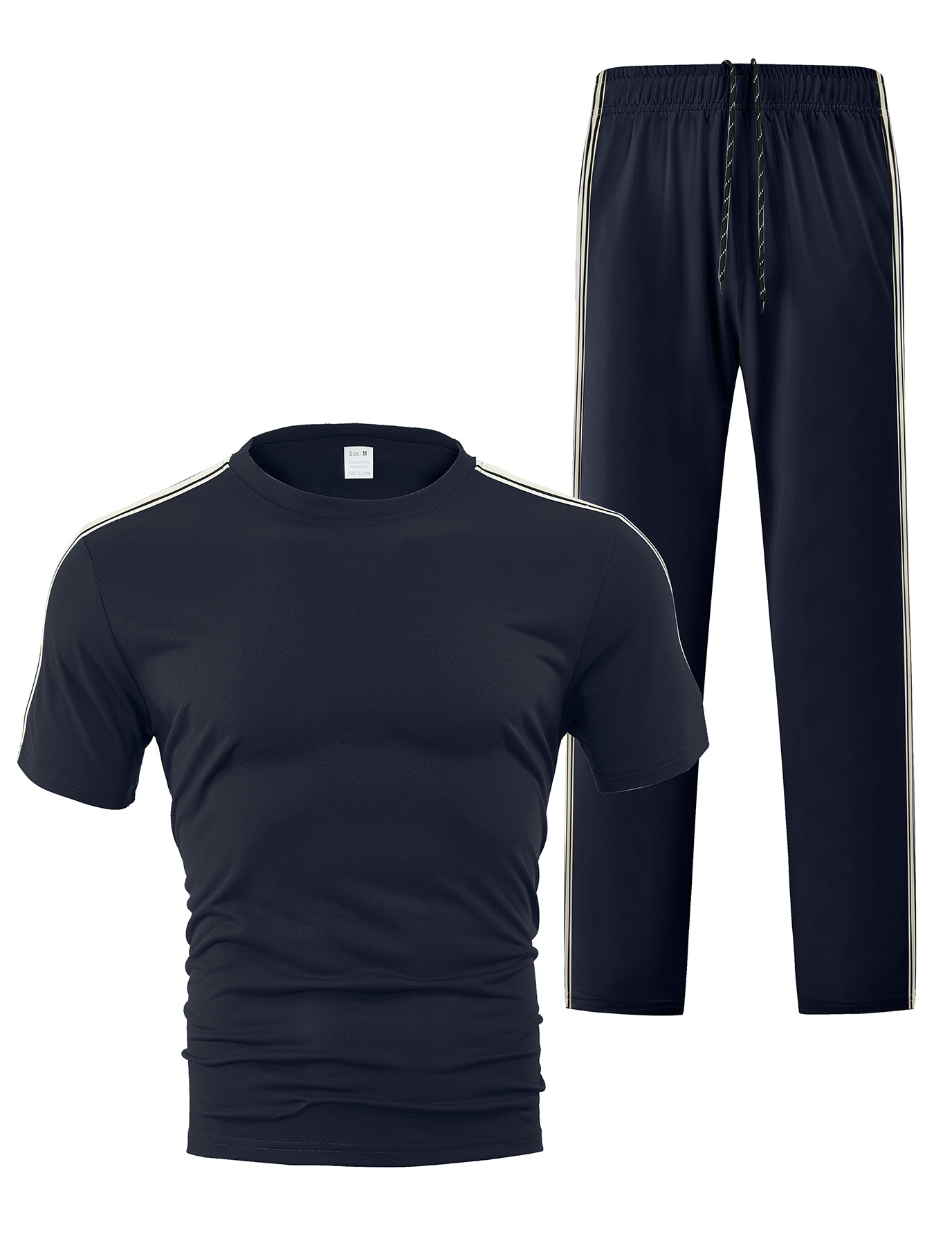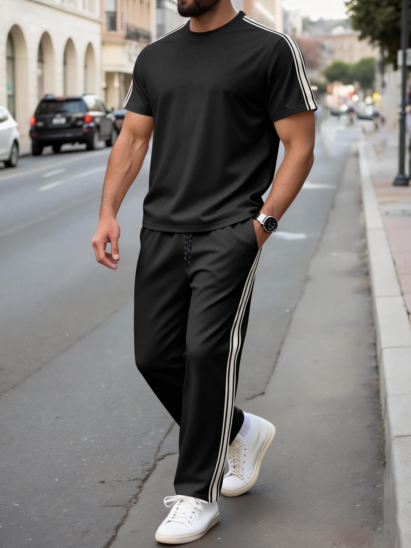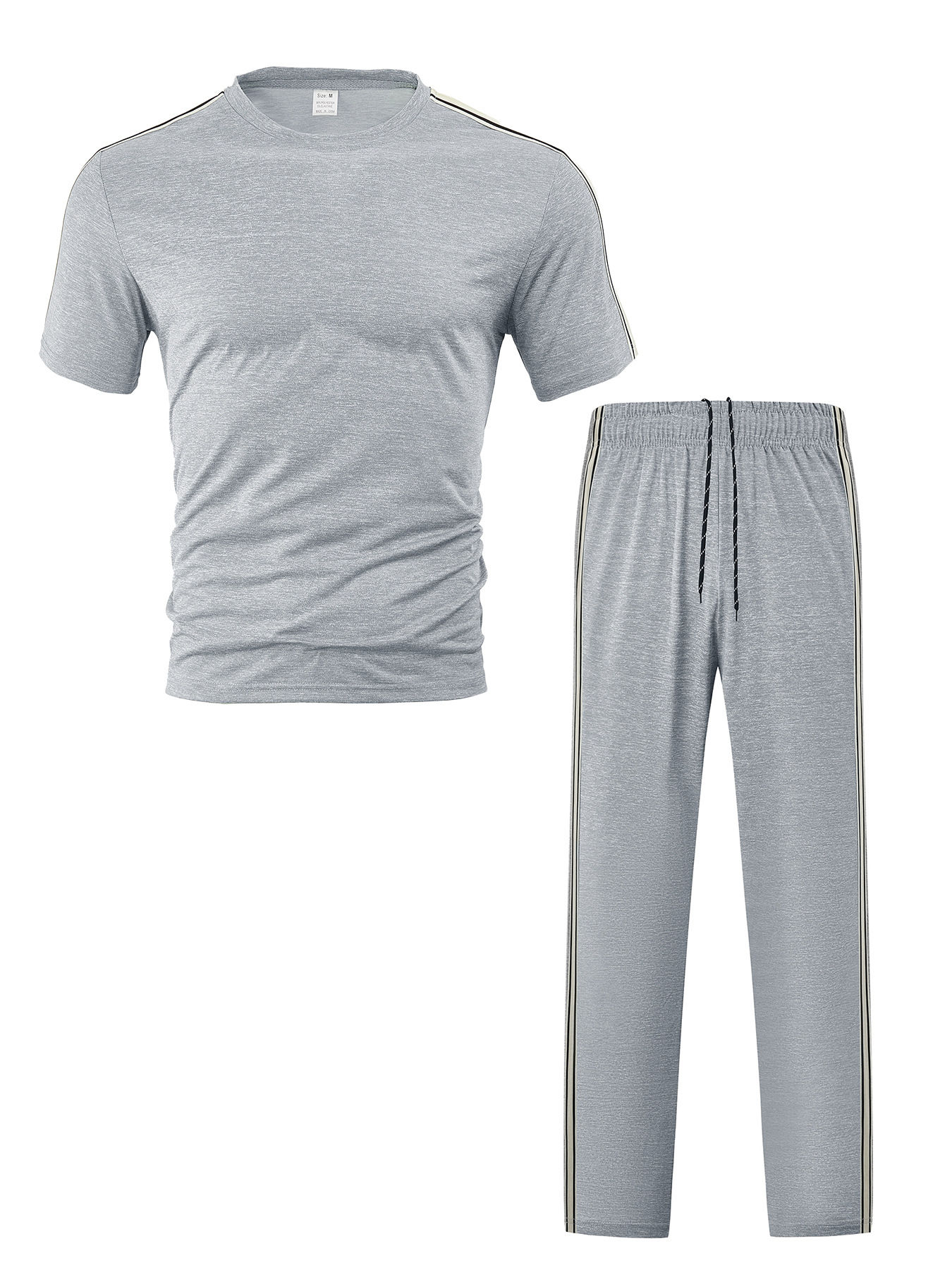 아마존 유럽 및 미국 해외배송 여름 신상 남성 캐주얼 세트, 스트라이프 패턴의 다용도 반팔 긴바지 스포츠 세트
