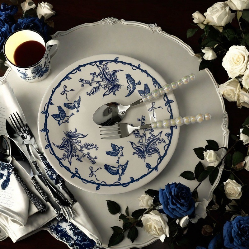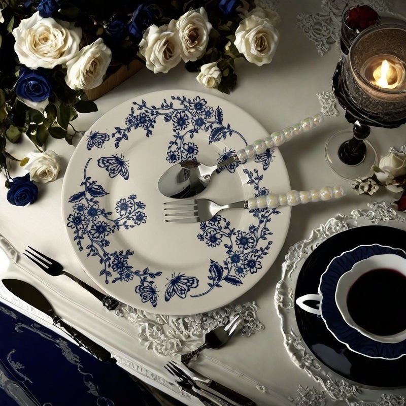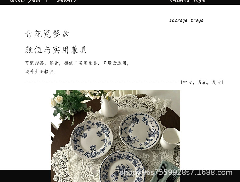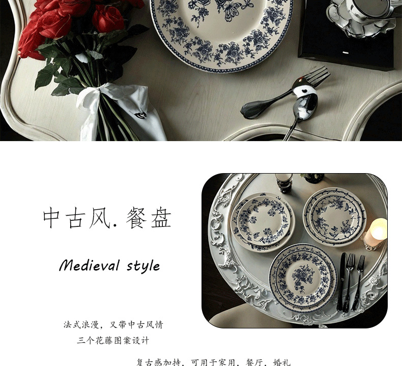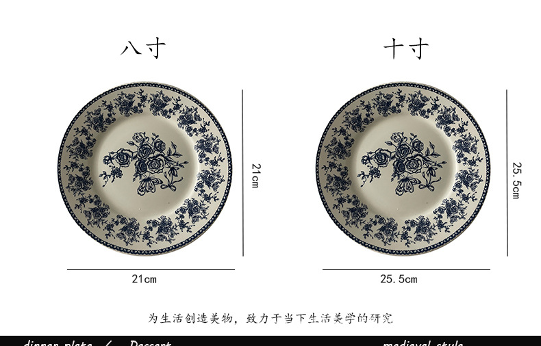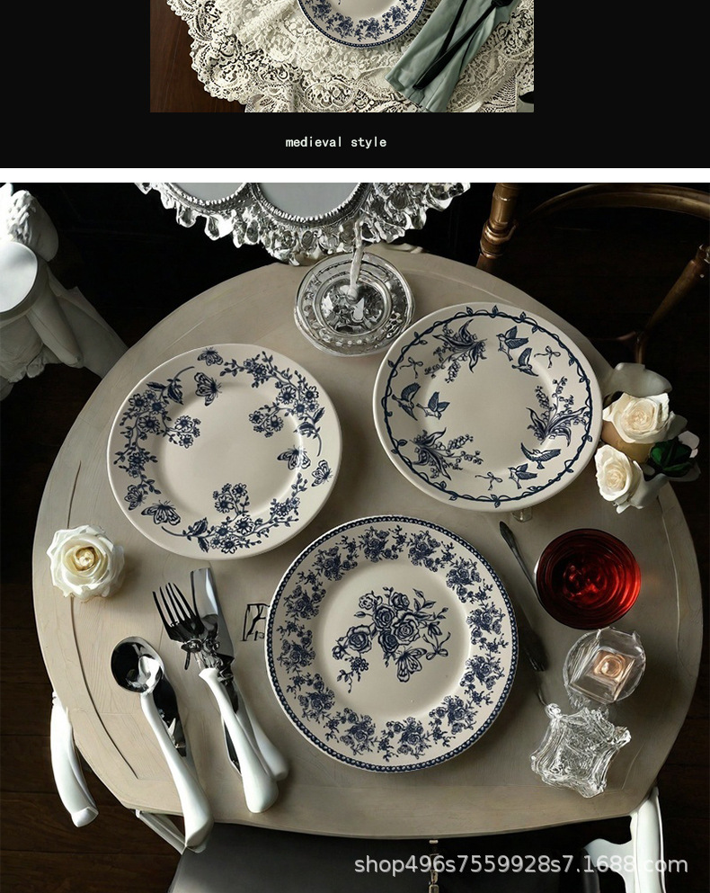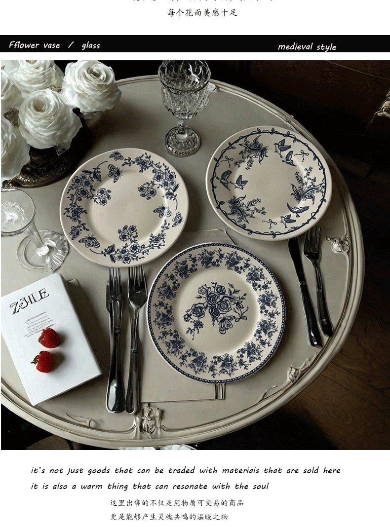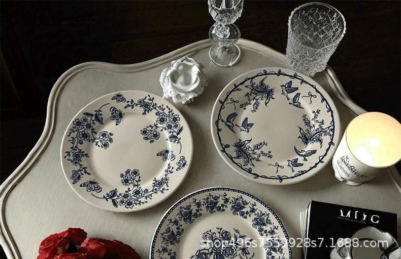 중세 스타일 덩굴 꽃 파란색과 흰색 세라믹 접시 디너 접시 스테이크 접시 디저트 스낵 도매 트레이 식기스토어 가기