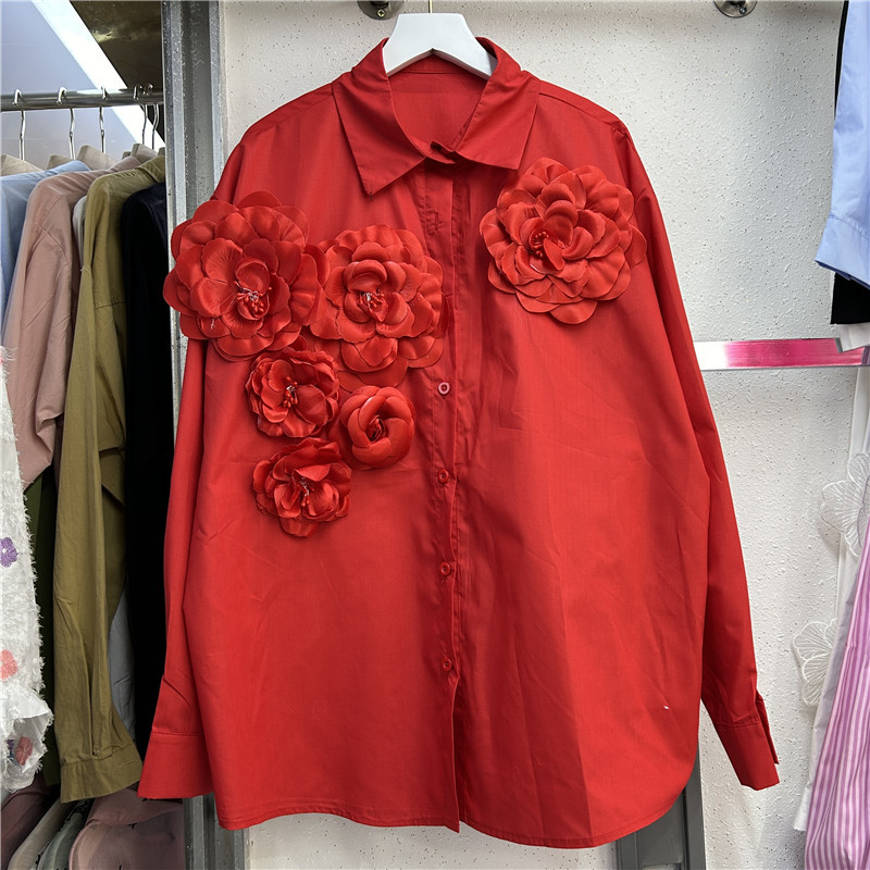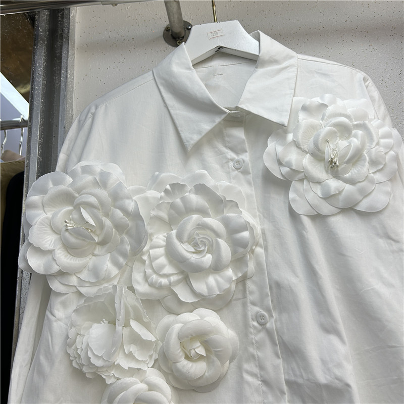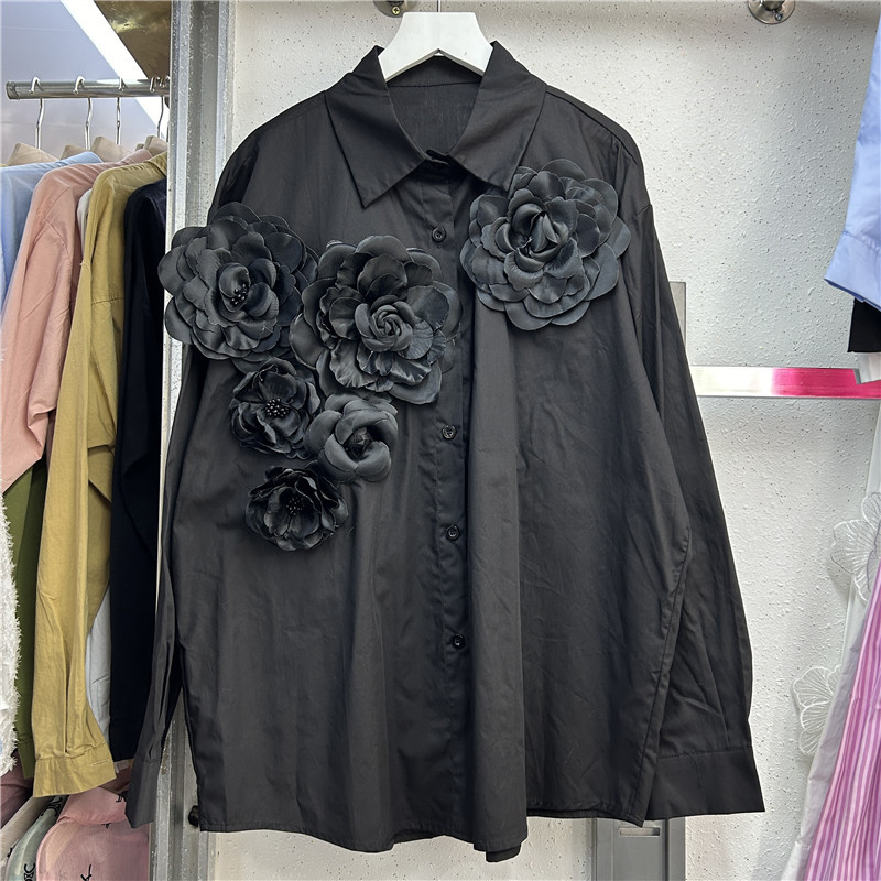틈새 디자인 센스 틈새 중공업 3 차원 꽃 셔츠 최고 여성의 가을 및 겨울 새로운 올 매치 폴로 칼라 셔츠