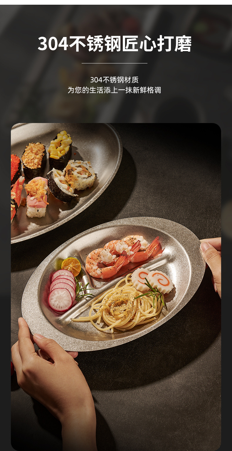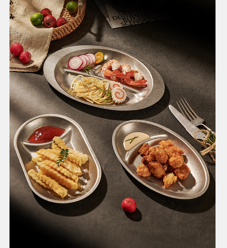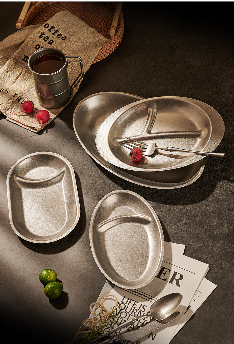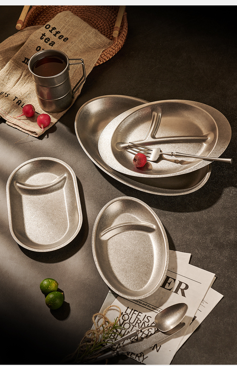 304 스테인리스 레트로 스타일 가정용 분할 타원형 접시 라이트 럭셔리 무광 스타일 야외 식사 접시 바베큐 접시 맞춤 제작스토어 가기