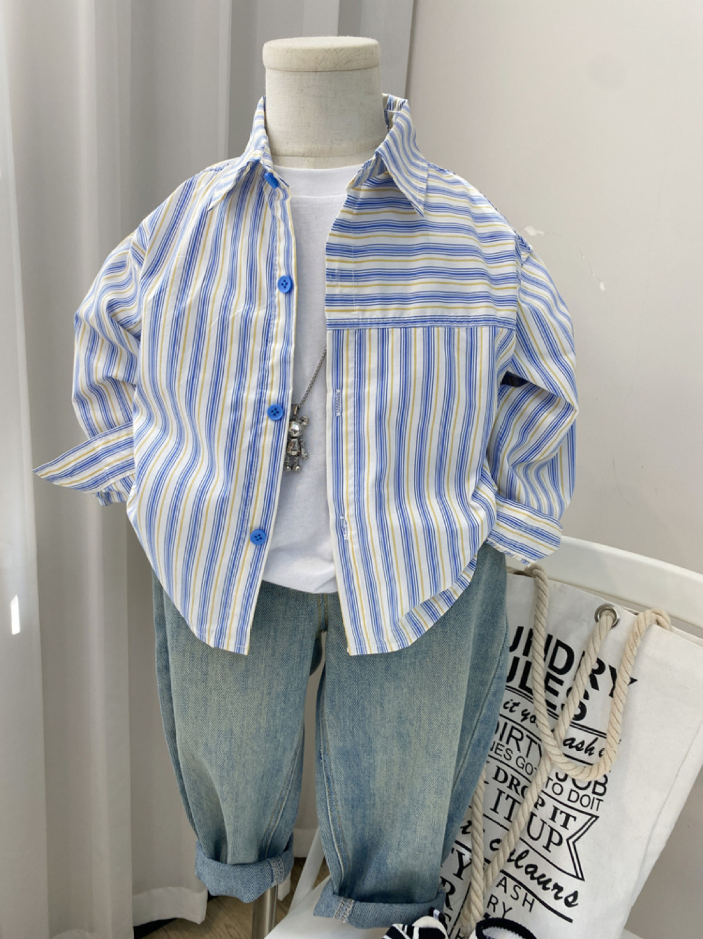 어린이 셔츠 가을 소년 잘 생긴 수직 줄무늬 자수 옷깃 셔츠 어린이 셔츠 봄과 가을 도매스토어 가기