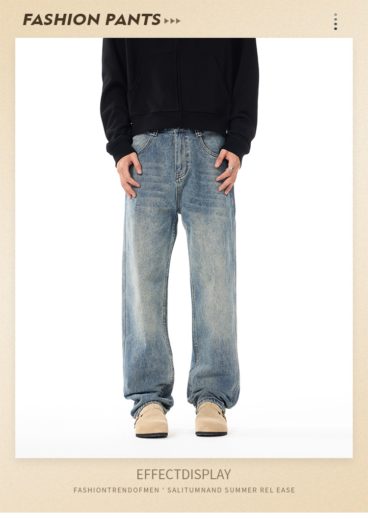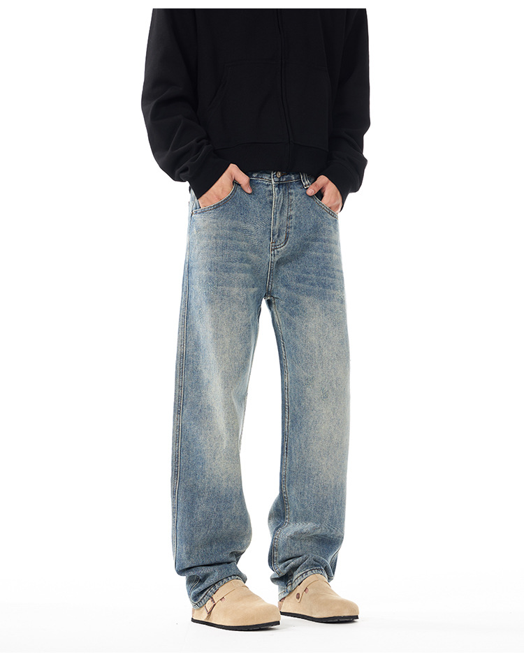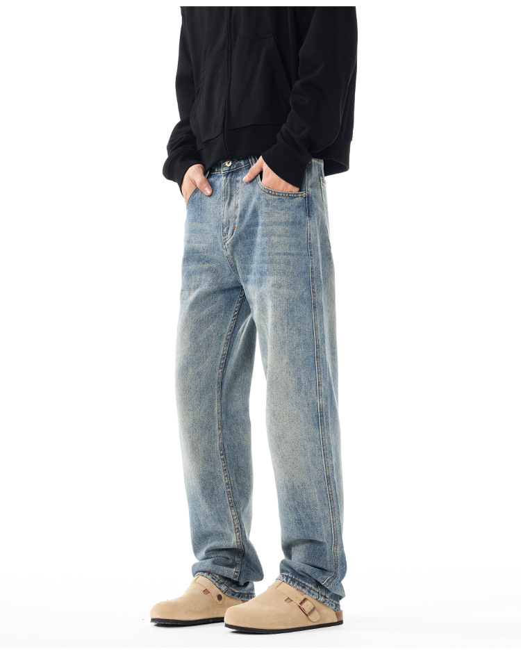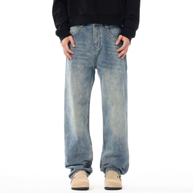 Muqiu 남성복 2024 가을/겨울 새 플러스 사이즈 씻은 레트로 청바지 남성용 느슨한 스트레이트 캐주얼 바지스토어 가기