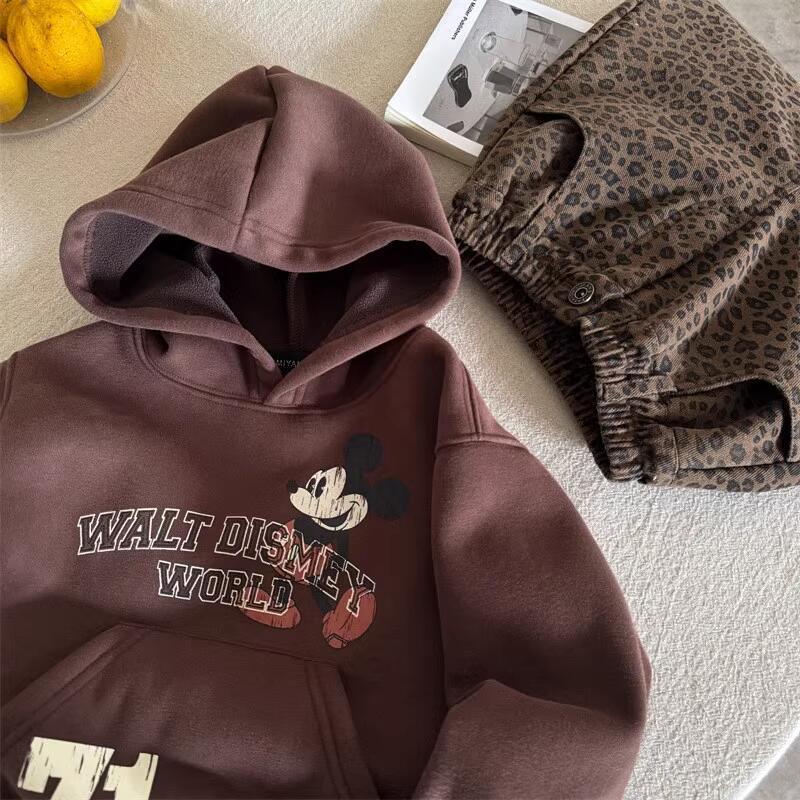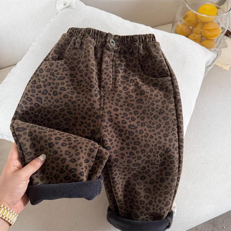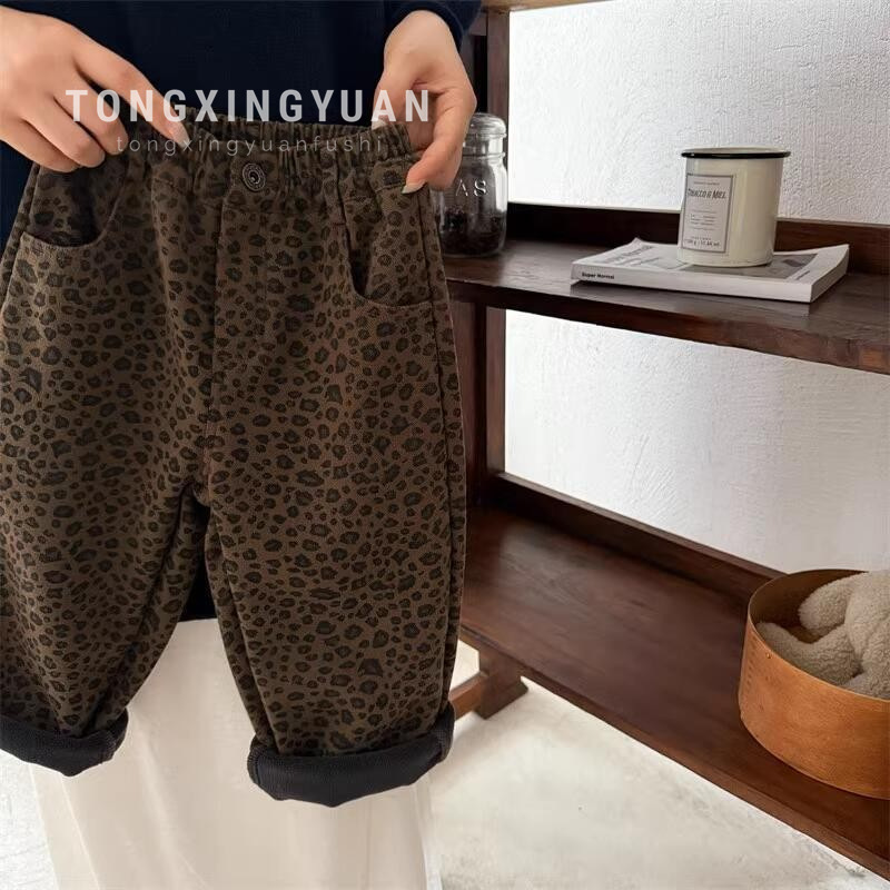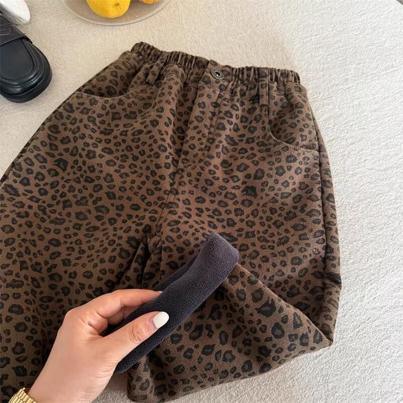 어린이 바지 2024 가을과 겨울 새로운 소년 소녀 레오파드 무늬 두꺼운 캐주얼 바지 아기 올 매치 스트레이트 팬츠 도매스토어 가기