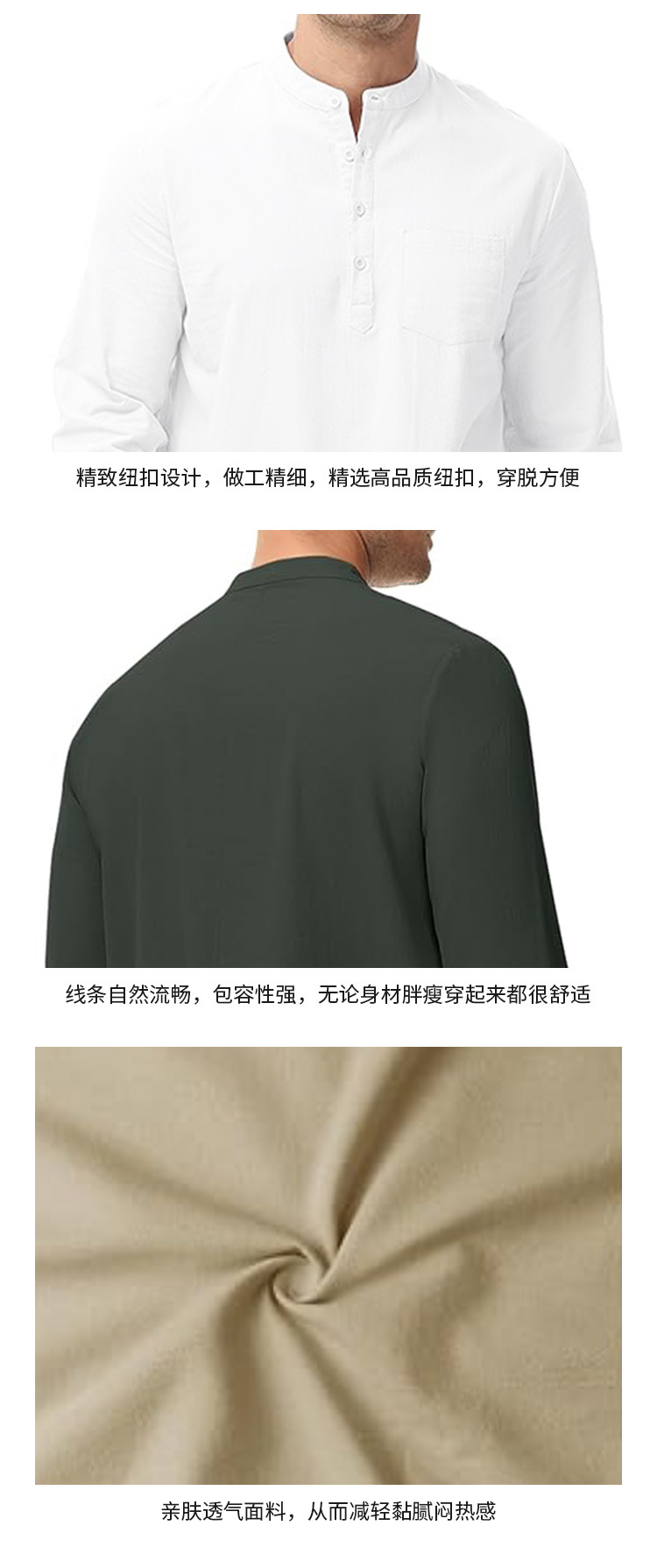 남성용 민족 의상 로브, 크로스보더 면 소재 긴팔 토브, 옆트임 버튼 로브, 헨리 캐주얼 셔츠