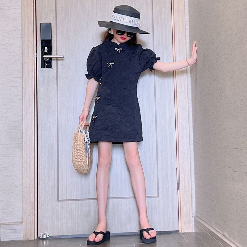 트렌디한 패션 긴 원피스 한국 스타일 2024 여성 중 · 대형 어린이 소녀 원피스 여름 원피스 레트로 반팔 뉴 청삼스토어 가기