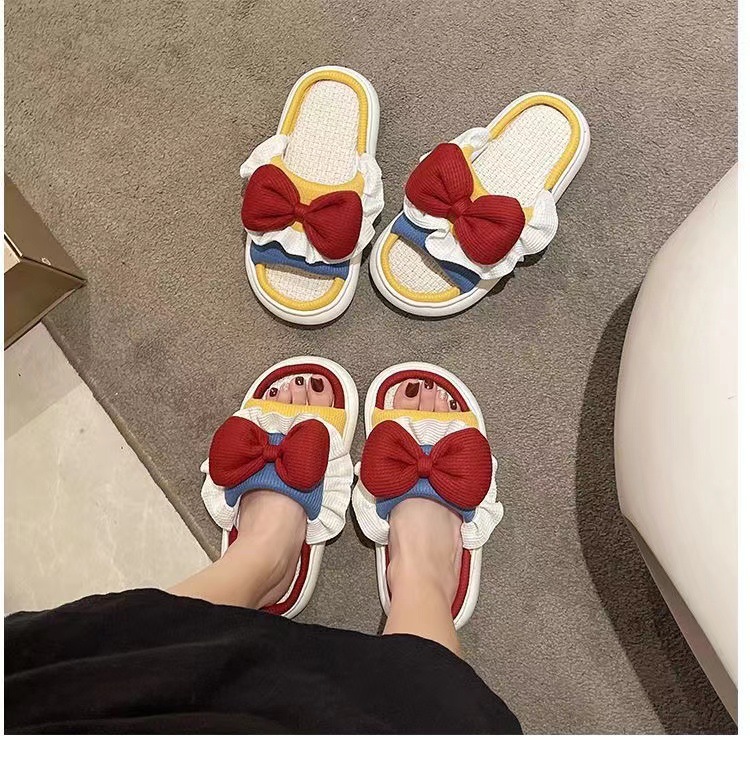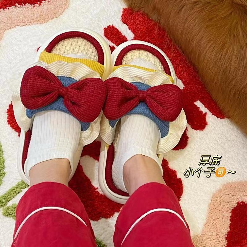 슬리퍼 여성용 아웃웨어 공주 스타일 활 신발 슬리퍼 봄과 여름 얇은 두꺼운 기숙사 미끄럼 방지 리넨 사계절 슬리퍼