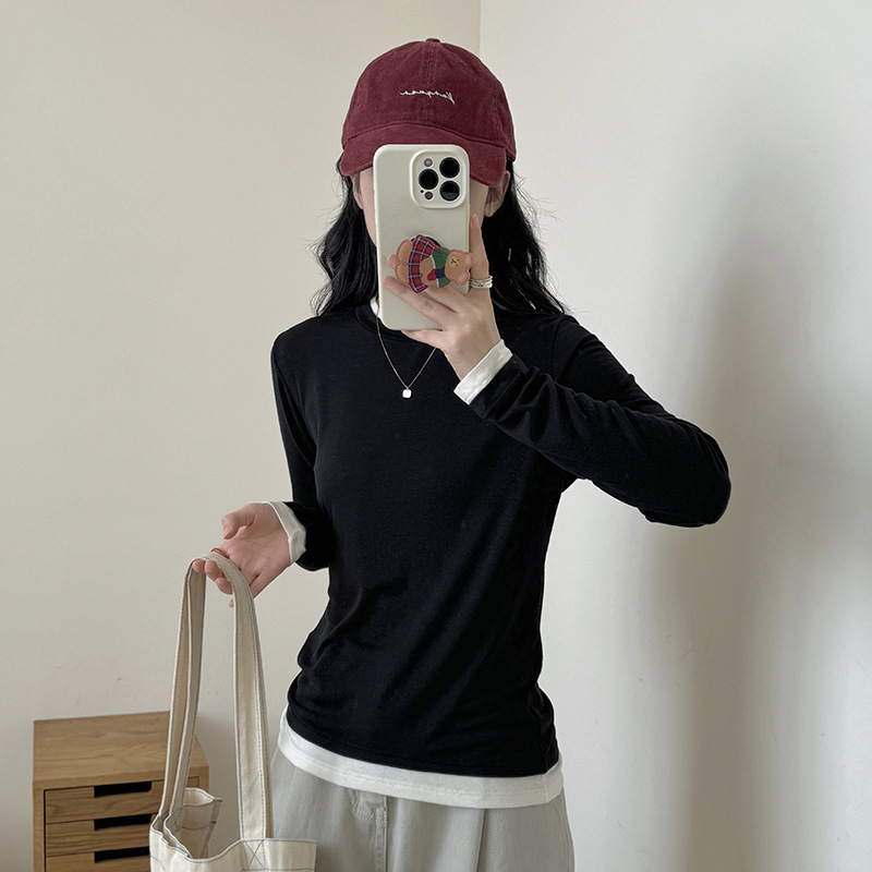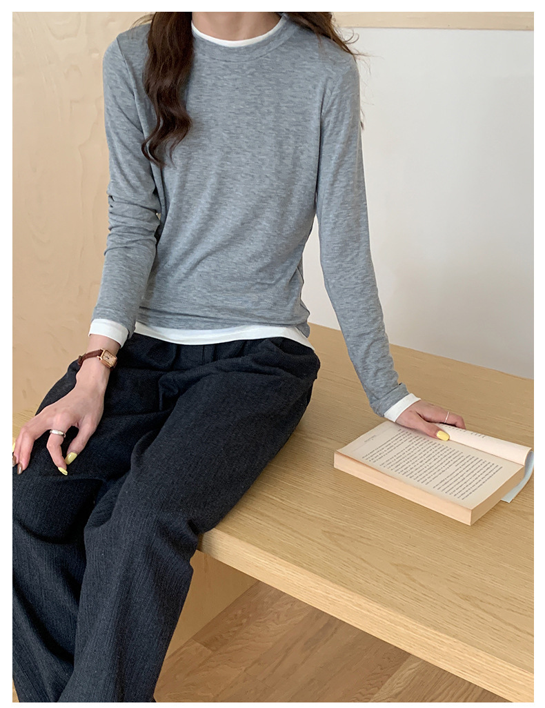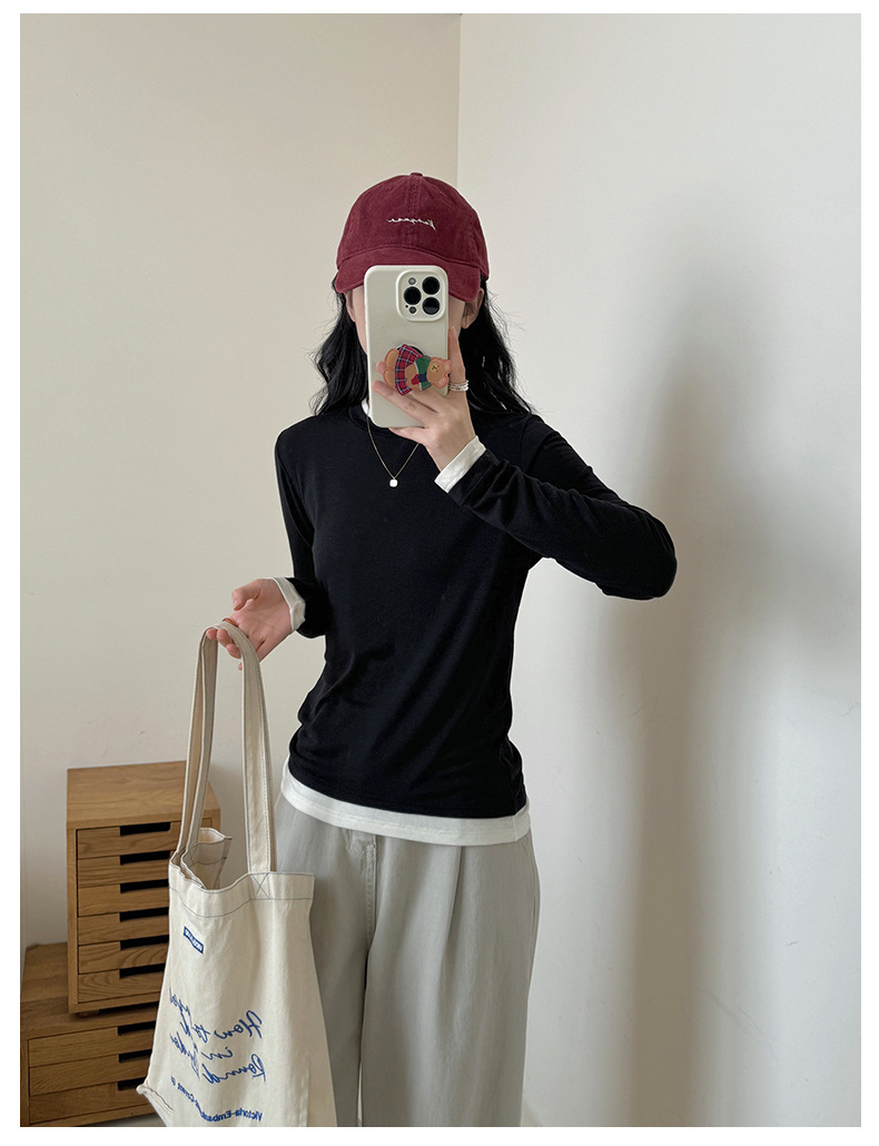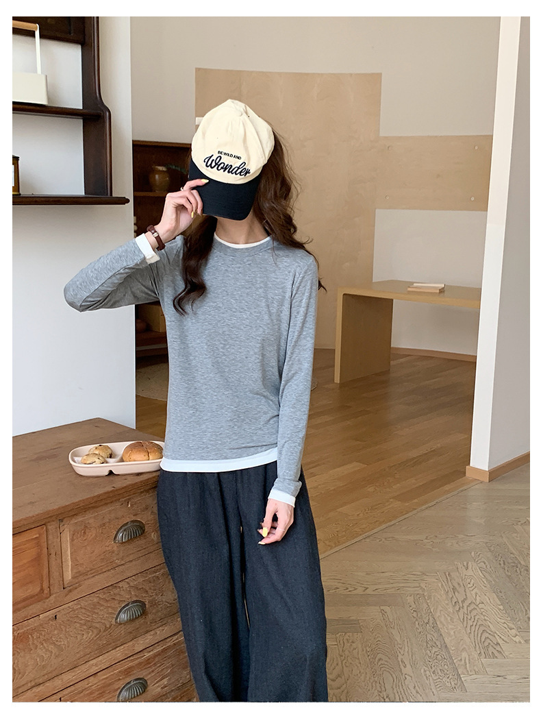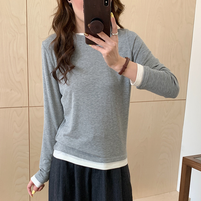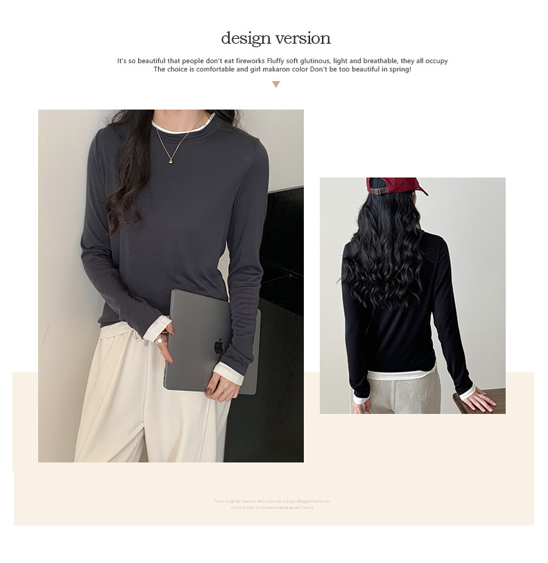 Ai Chunshi 가을과 겨울 Tencel Acetic Base 셔츠 여성의 새로운 스택 가짜 2 피스 크루 넥 니트 셔츠 간단한 인테리어스토어 가기