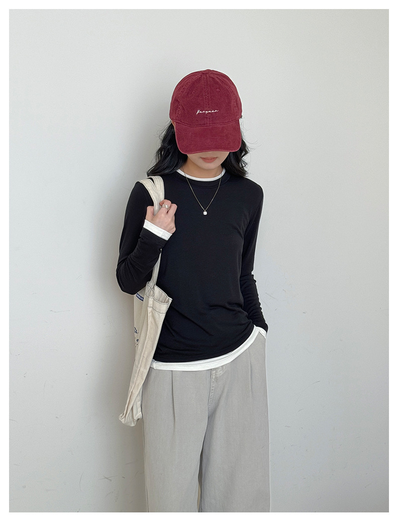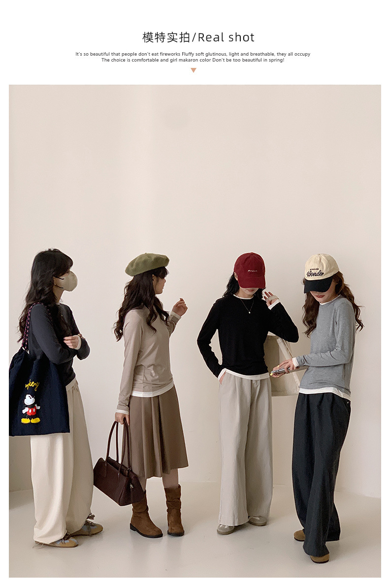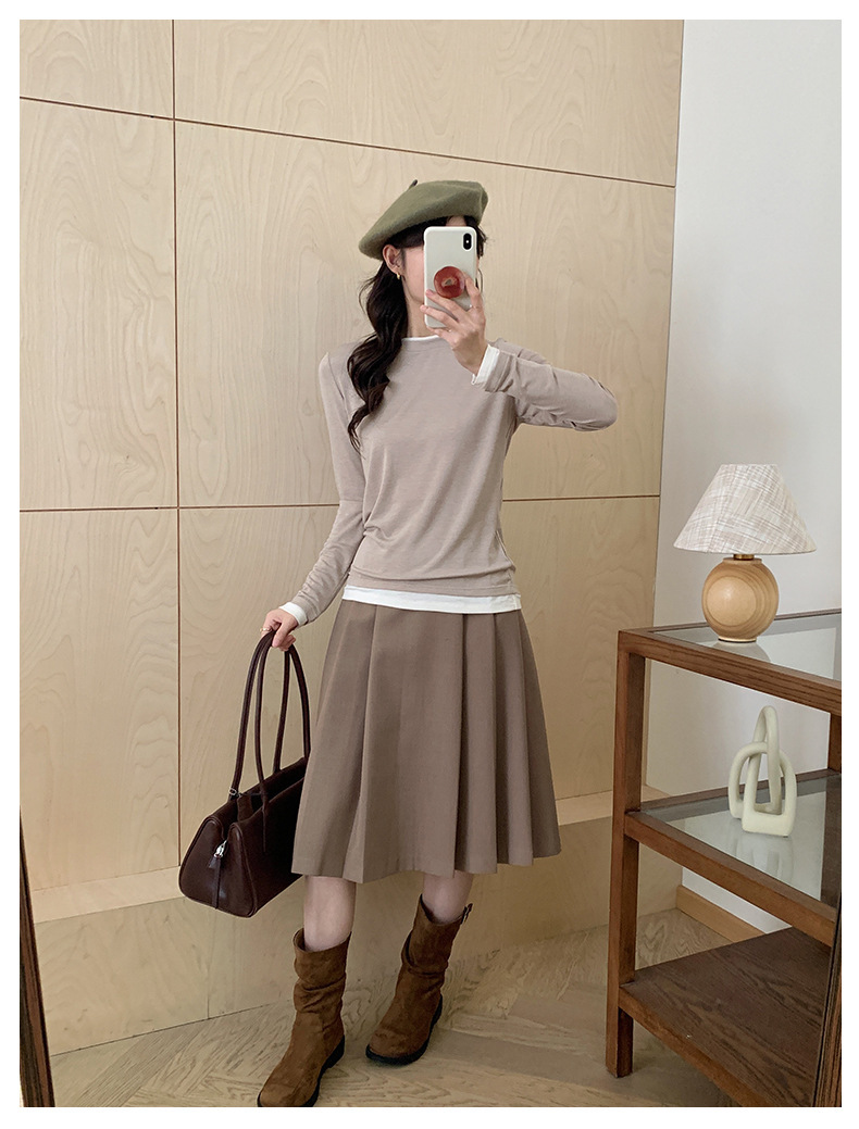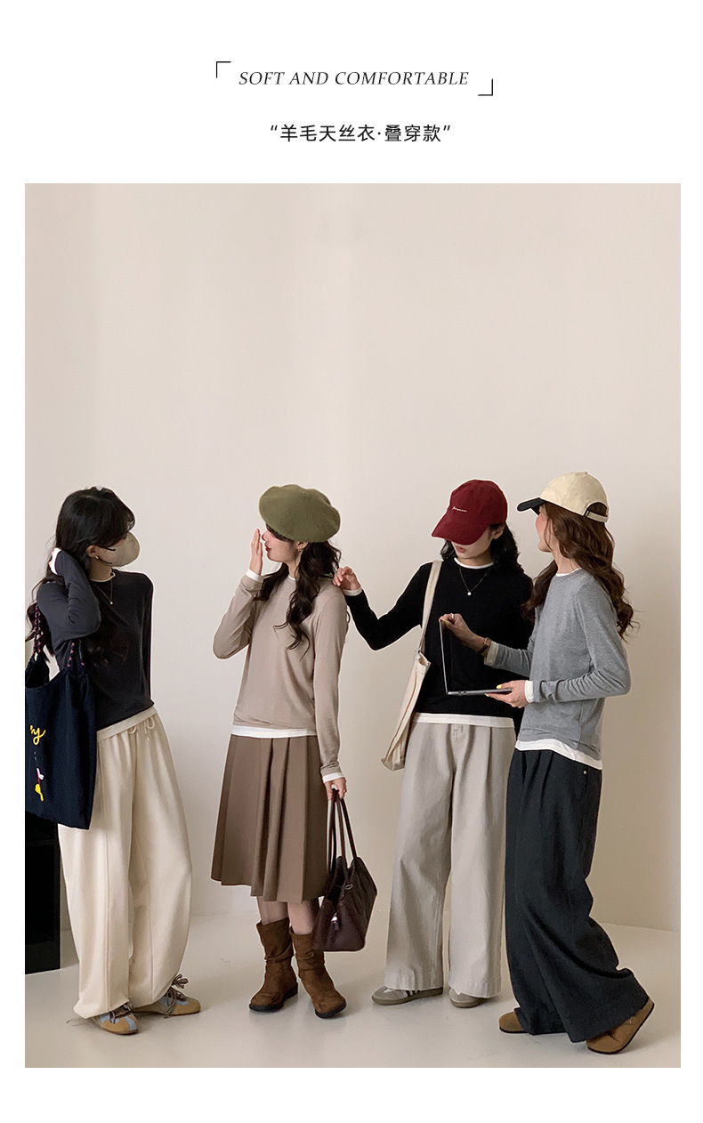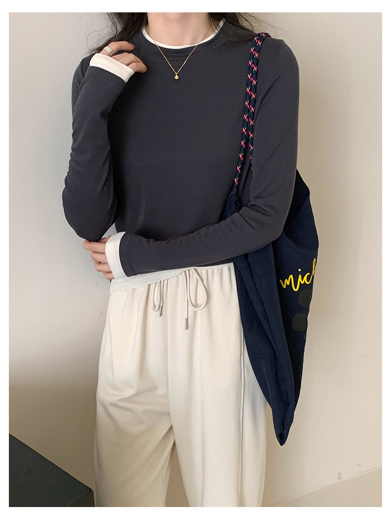 Ai Chunshi 가을과 겨울 Tencel Acetic Base 셔츠 여성의 새로운 스택 가짜 2 피스 크루 넥 니트 셔츠 간단한 인테리어스토어 가기