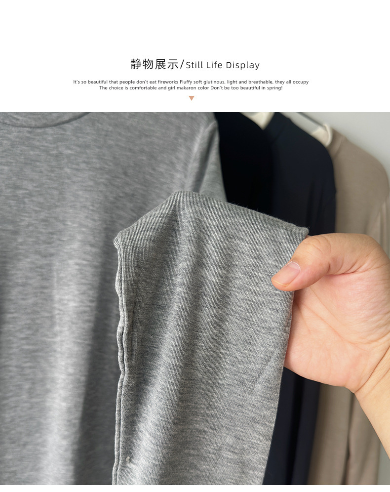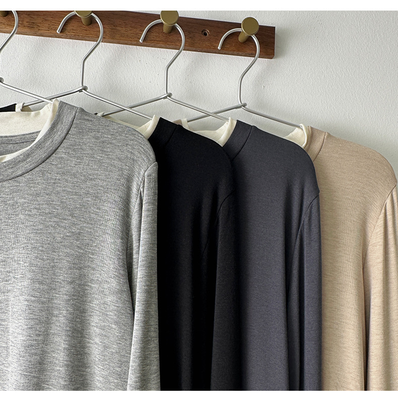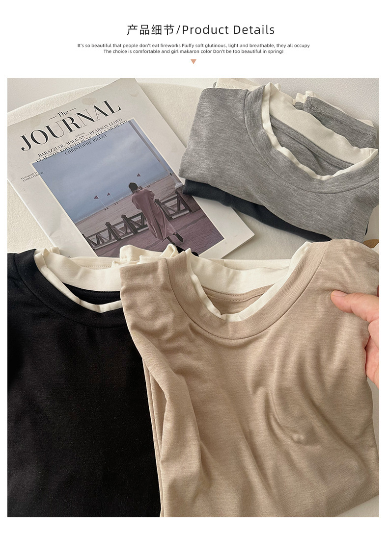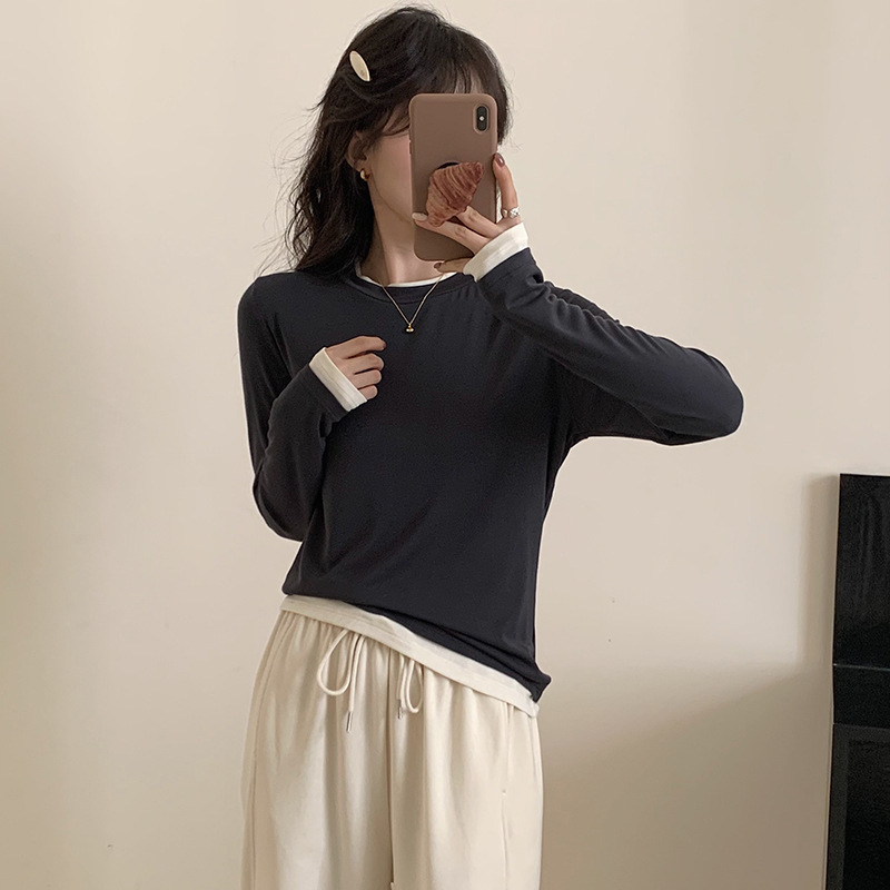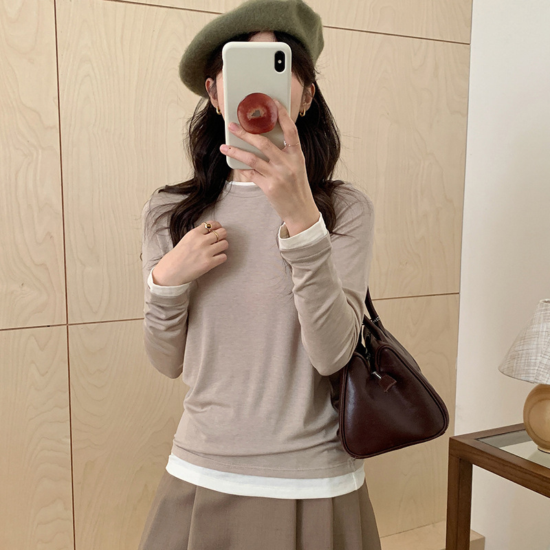 Ai Chunshi 가을과 겨울 Tencel Acetic Base 셔츠 여성의 새로운 스택 가짜 2 피스 크루 넥 니트 셔츠 간단한 인테리어