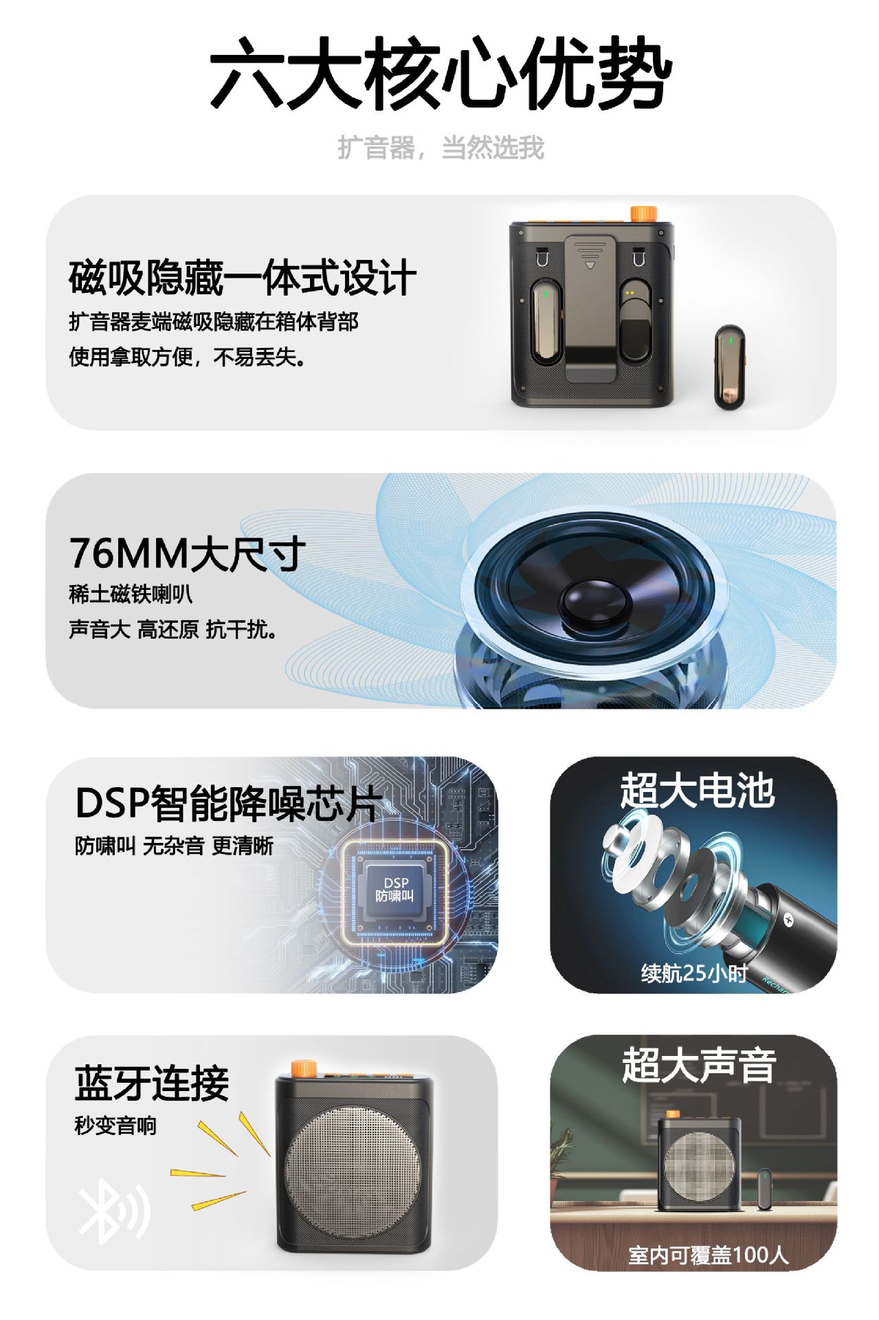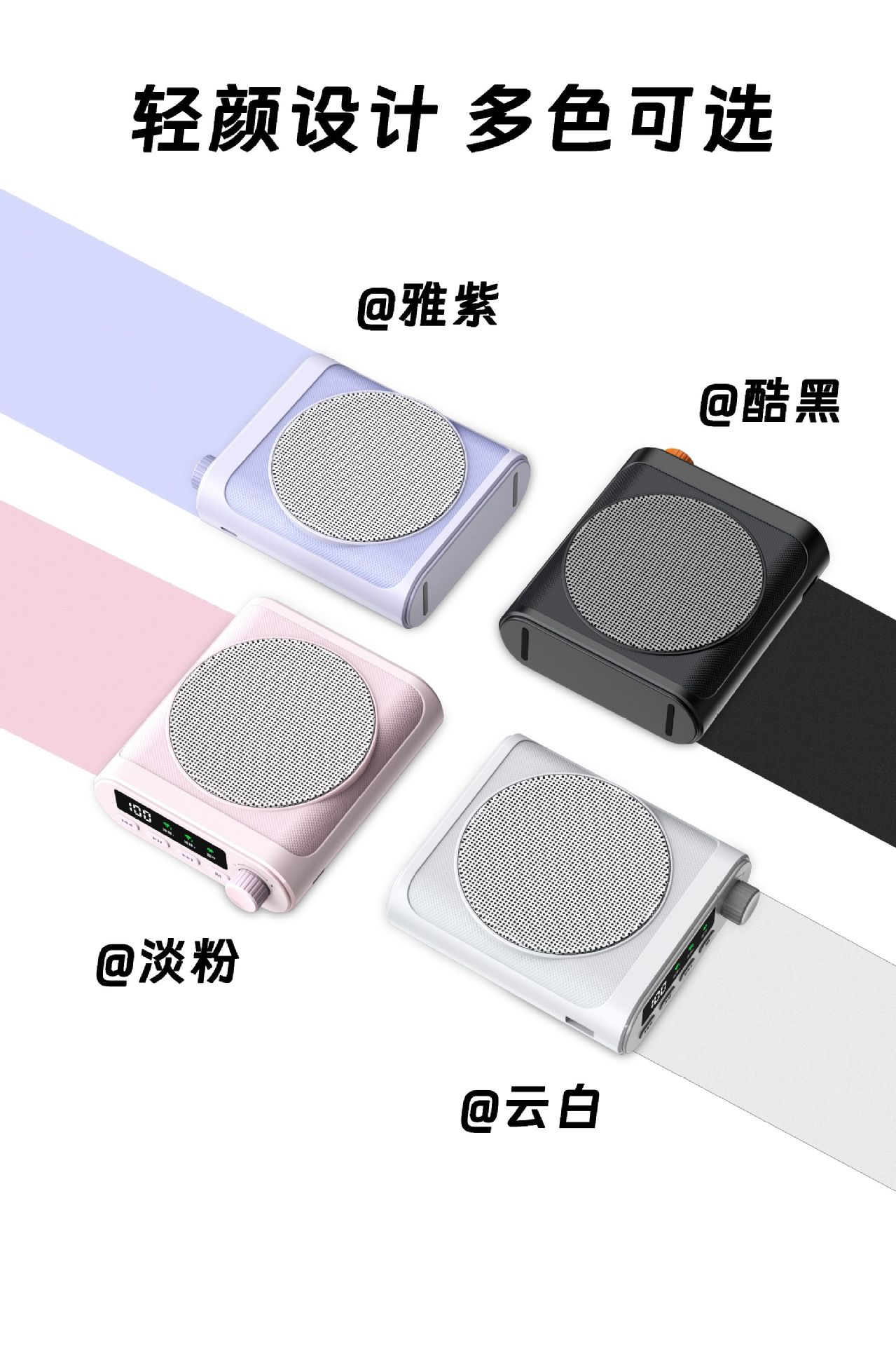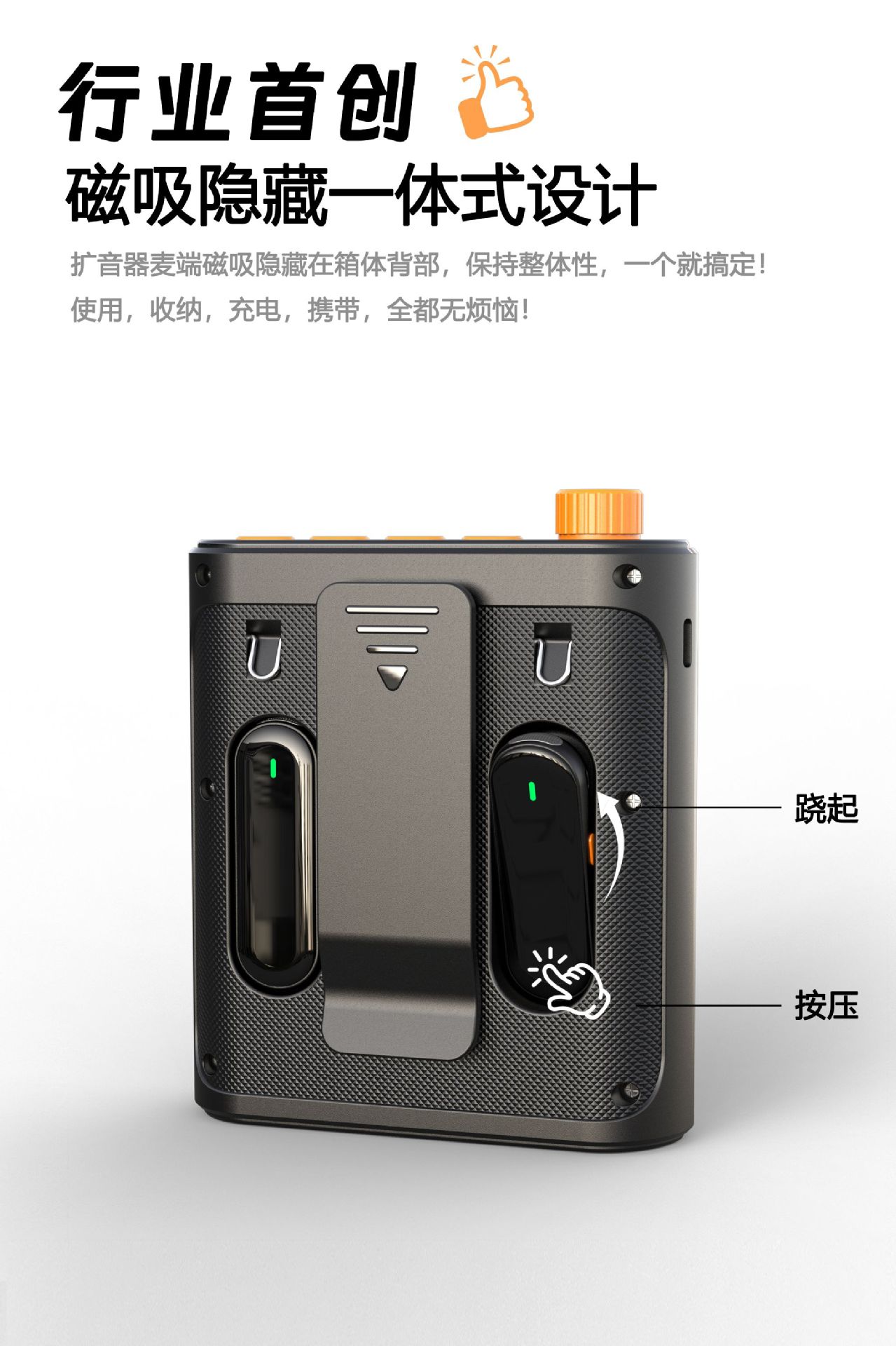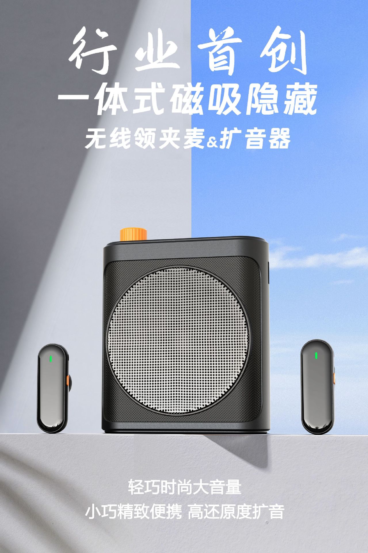 第四步,领夹麦处于没电状态可放回扩音器背面即可自动充电,充电过程中亮红灯,满电后熄灭