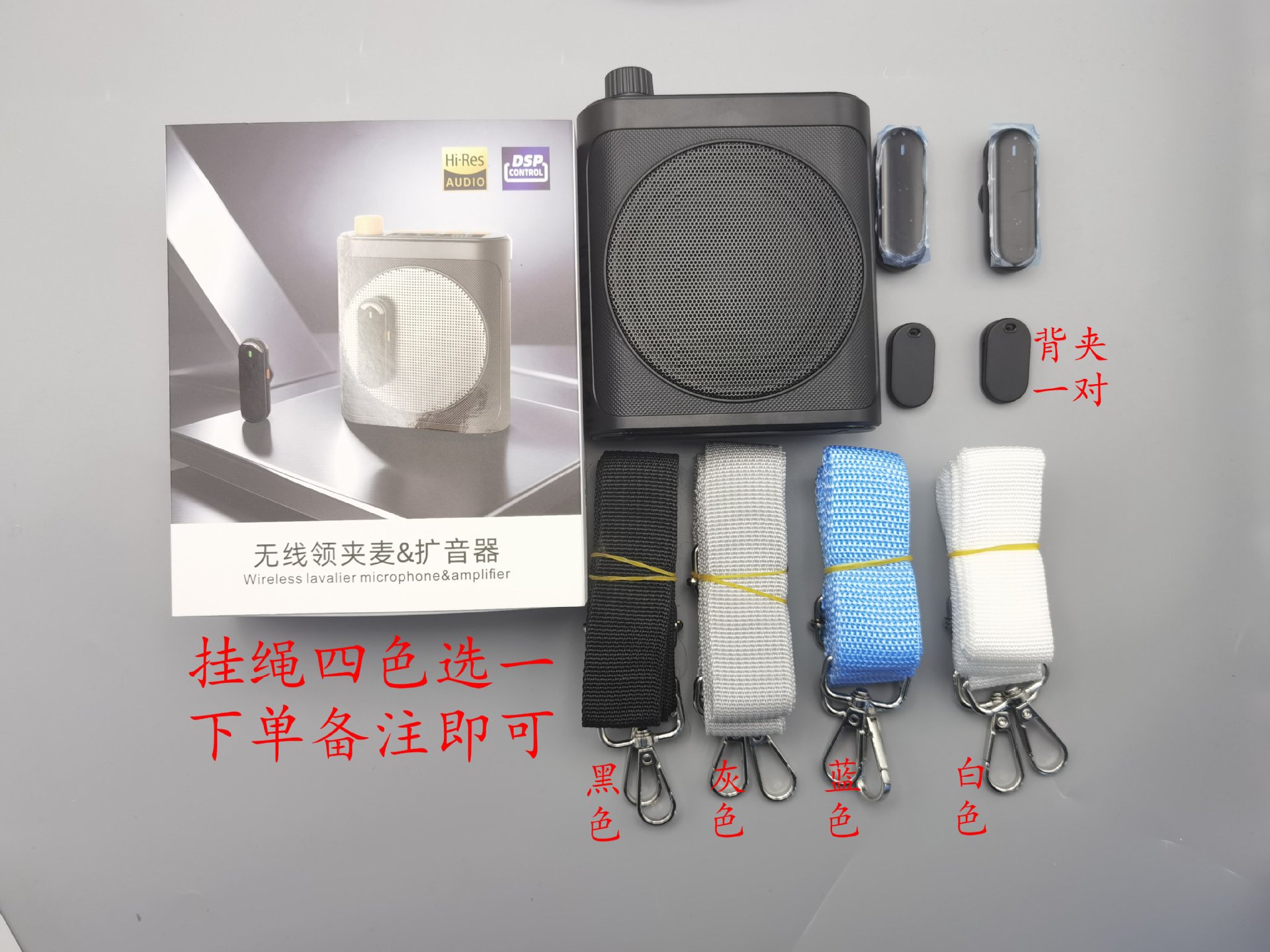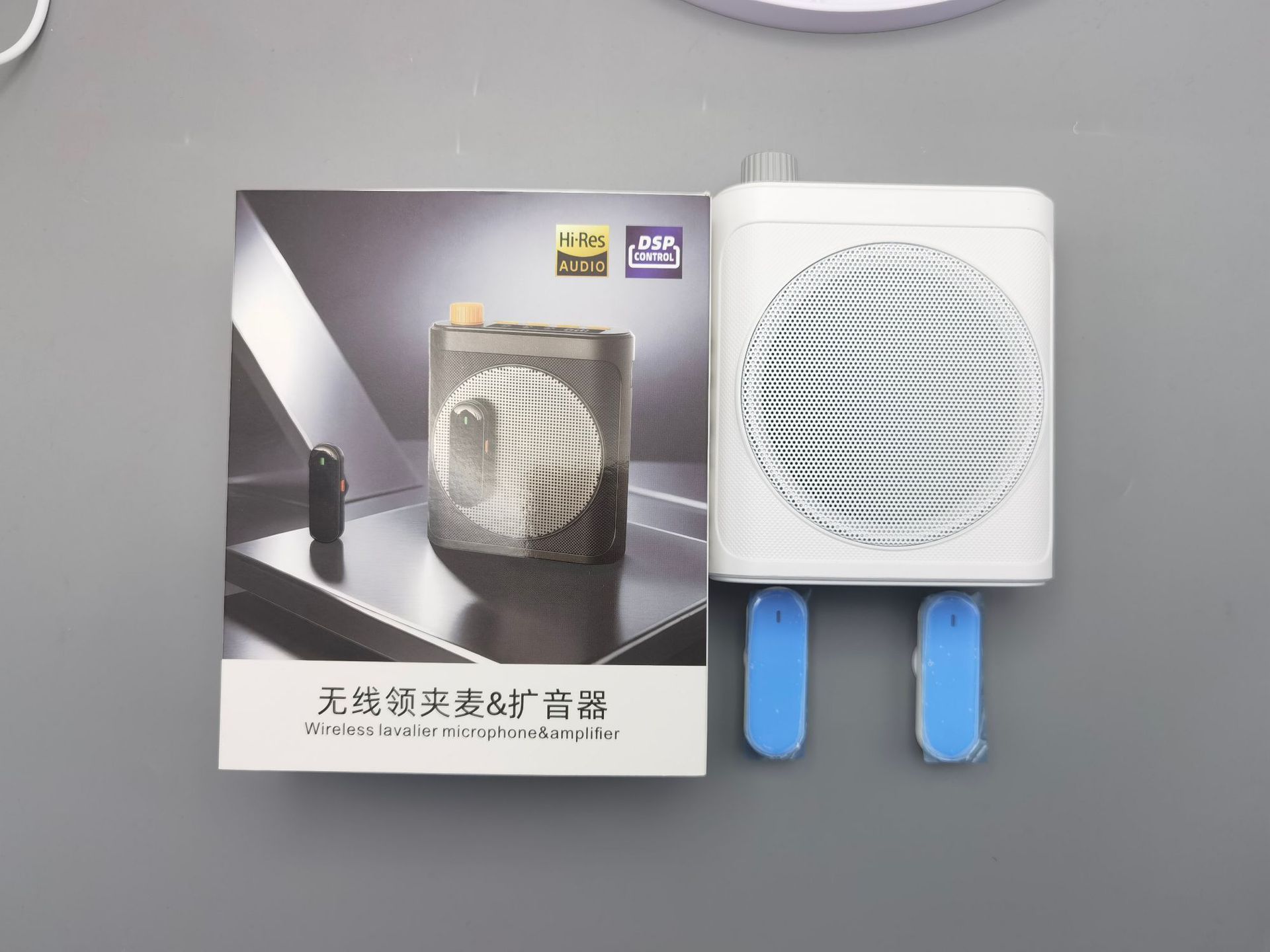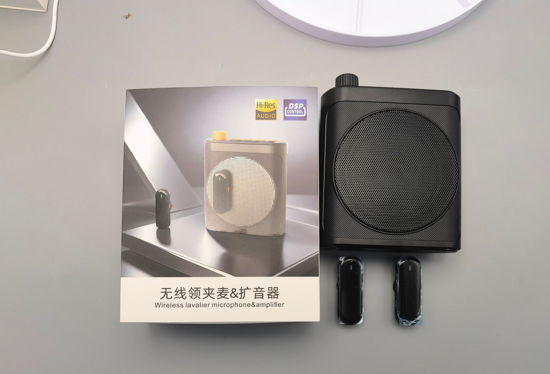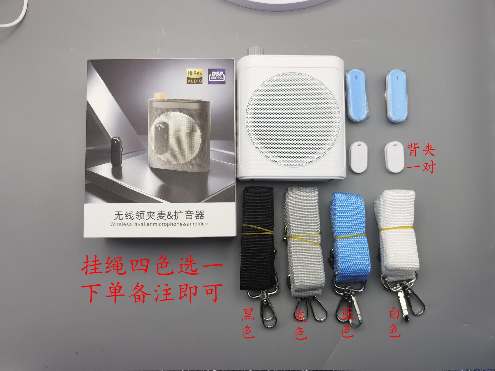 第二步,拿出扩音器背面的领夹麦,自动配对成功,灯亮绿色,扩音器面板连接1亮绿色,即可对领夹麦讲话使用
