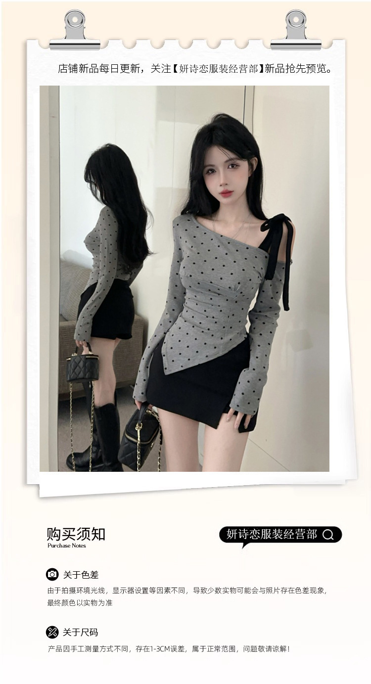 순수한 향신료 소녀 디자인 센스 그레이 웨이브 도트 숄더 티셔츠 여성의 가을 불규칙한 베이스 세련된 긴팔 어깨 탑스토어 가기