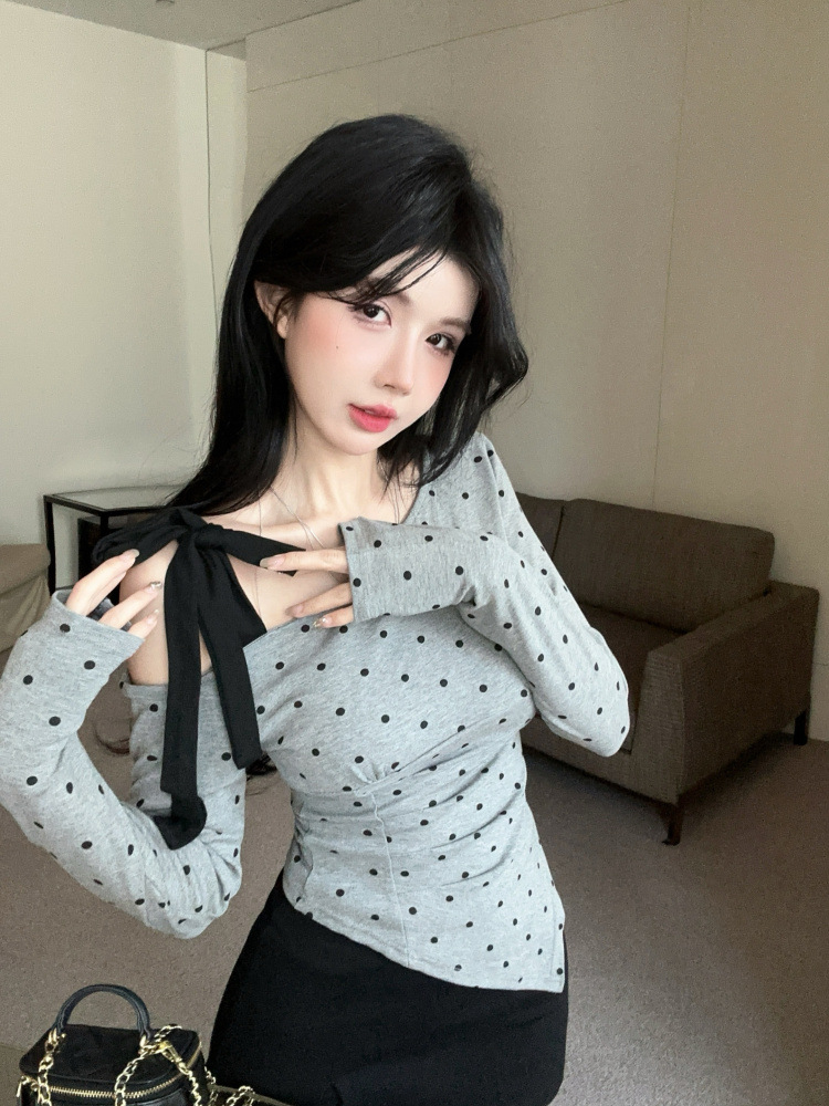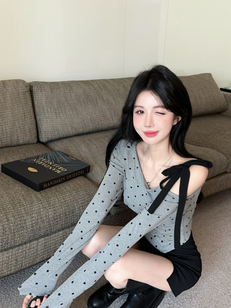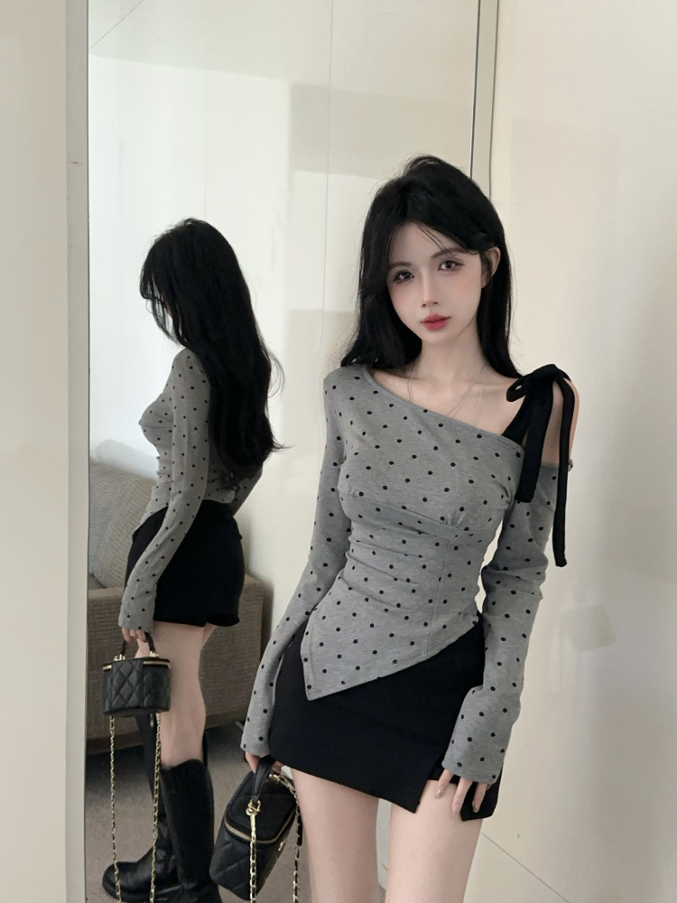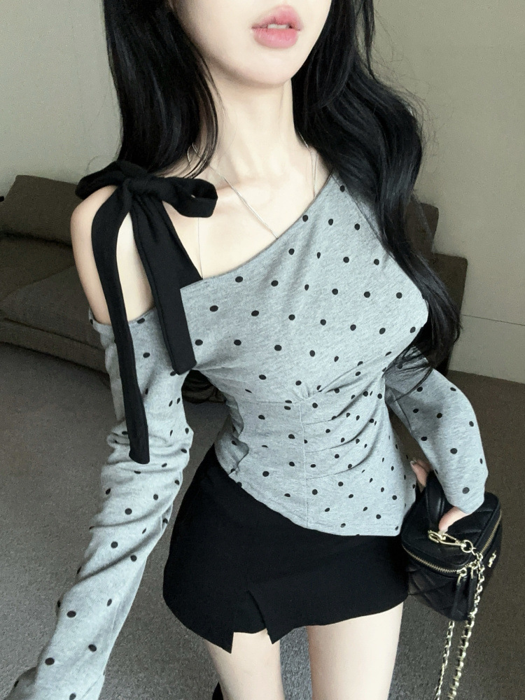순수한 향신료 소녀 디자인 센스 그레이 웨이브 도트 숄더 티셔츠 여성의 가을 불규칙한 베이스 세련된 긴팔 어깨 탑