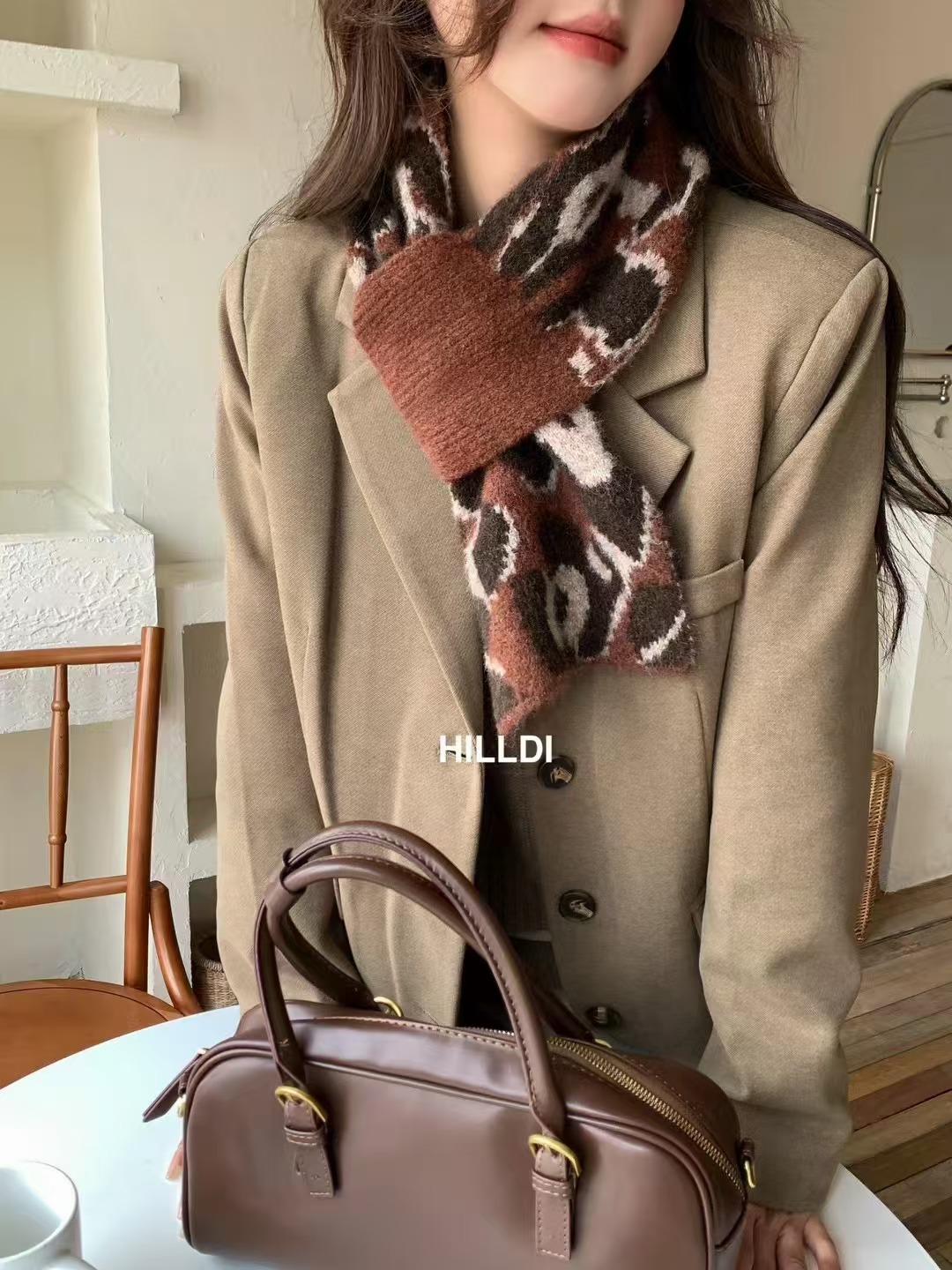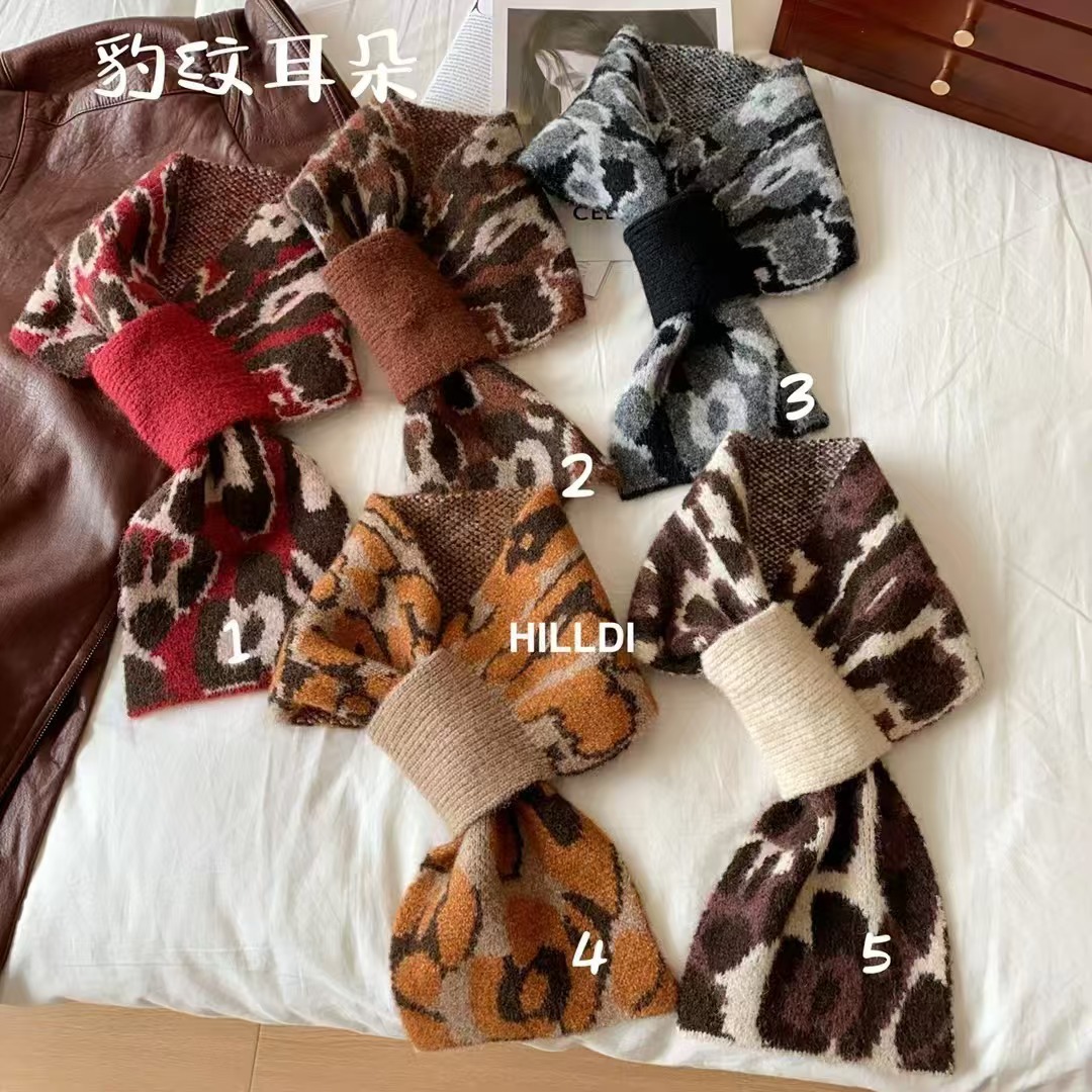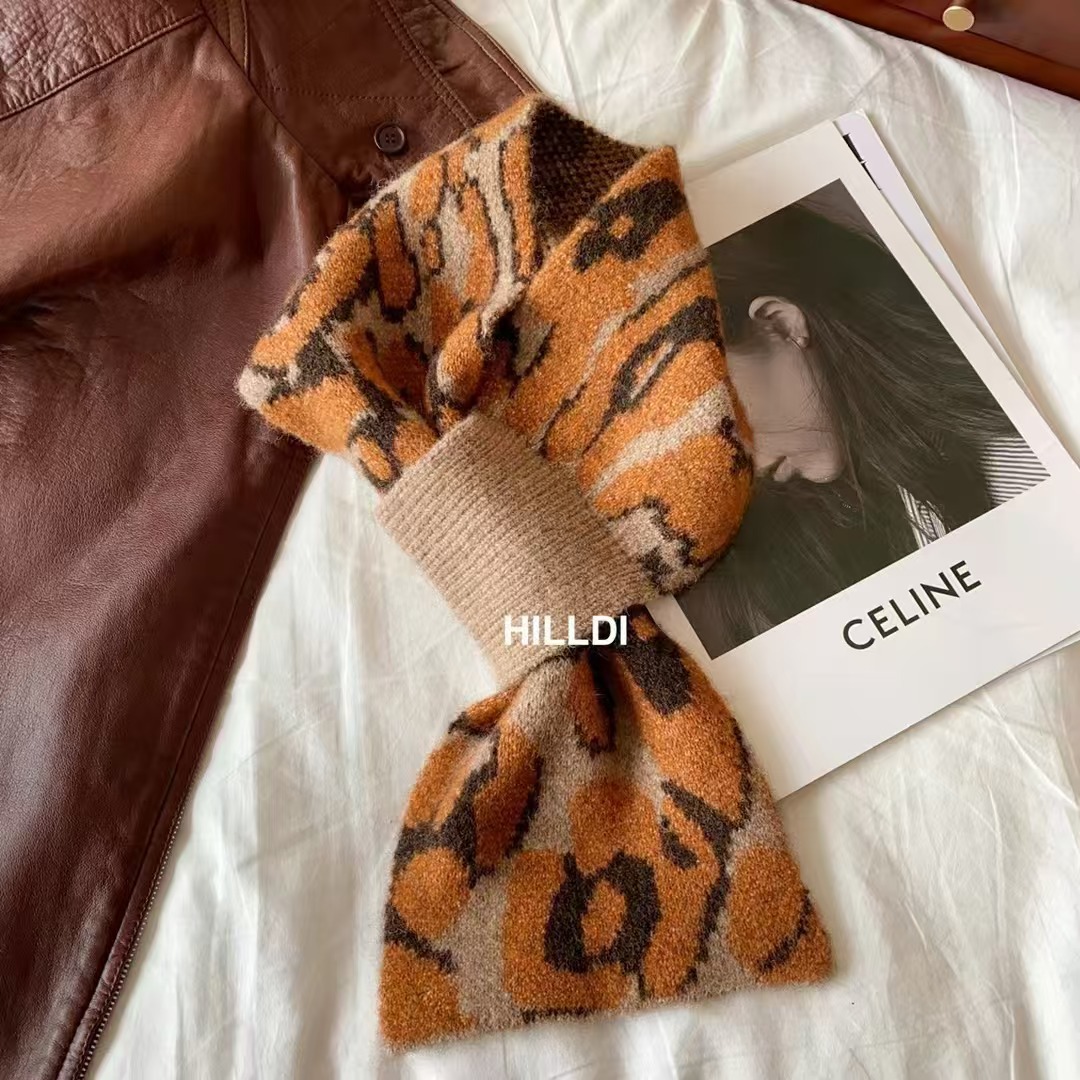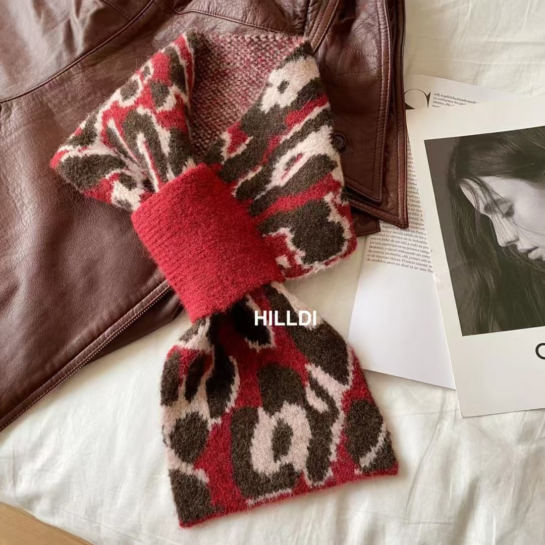 크로스 레오파드 무늬 작은 스카프 여자 2024 한국식 겨울 디자인 센스 따뜻한 양모 니트 스카프 학생 올매치스토어 가기