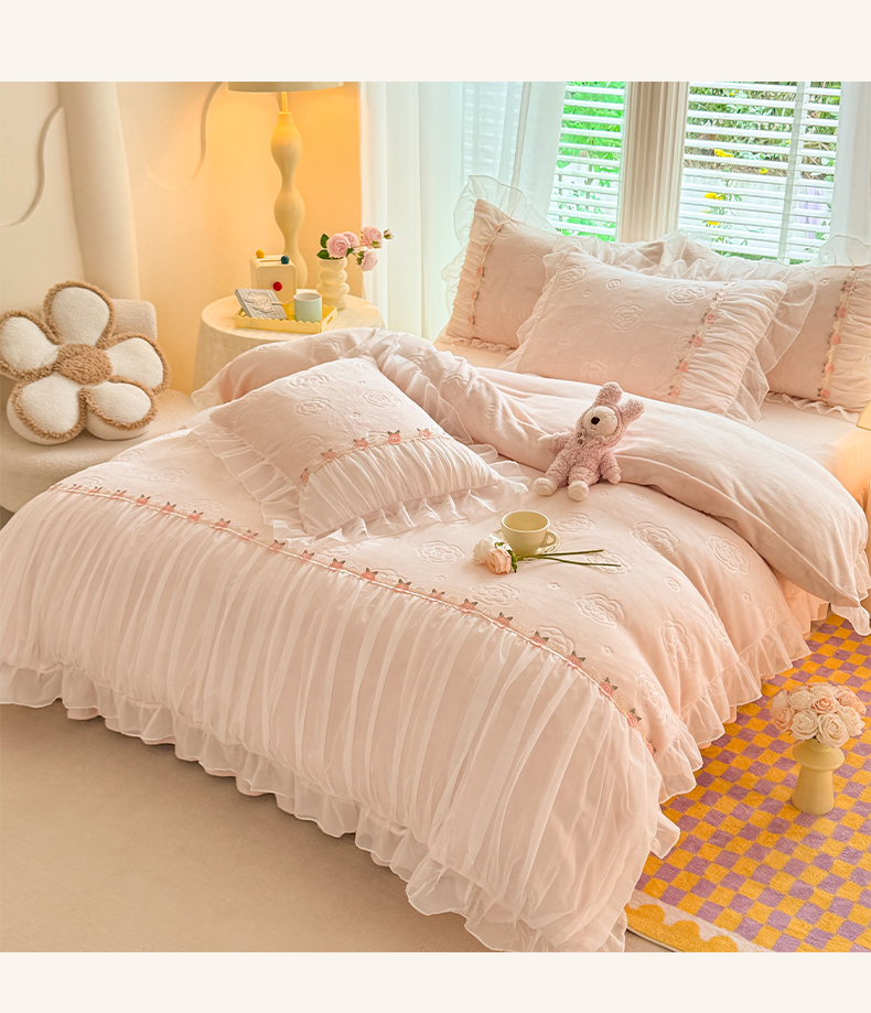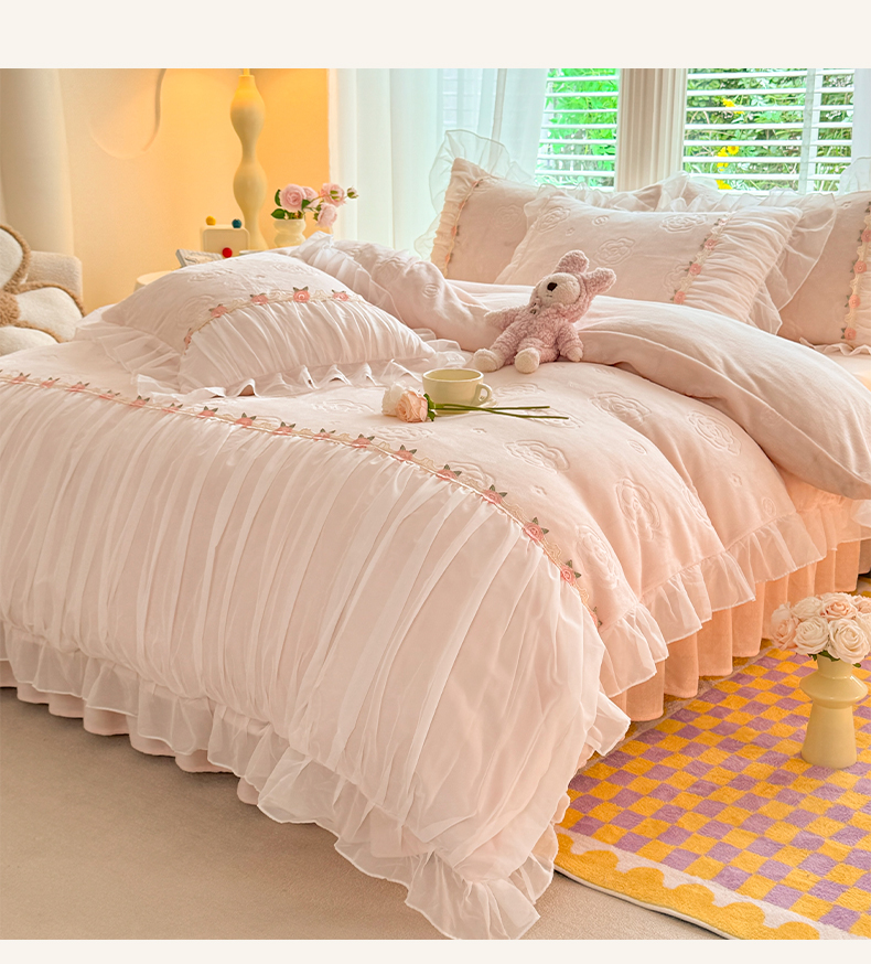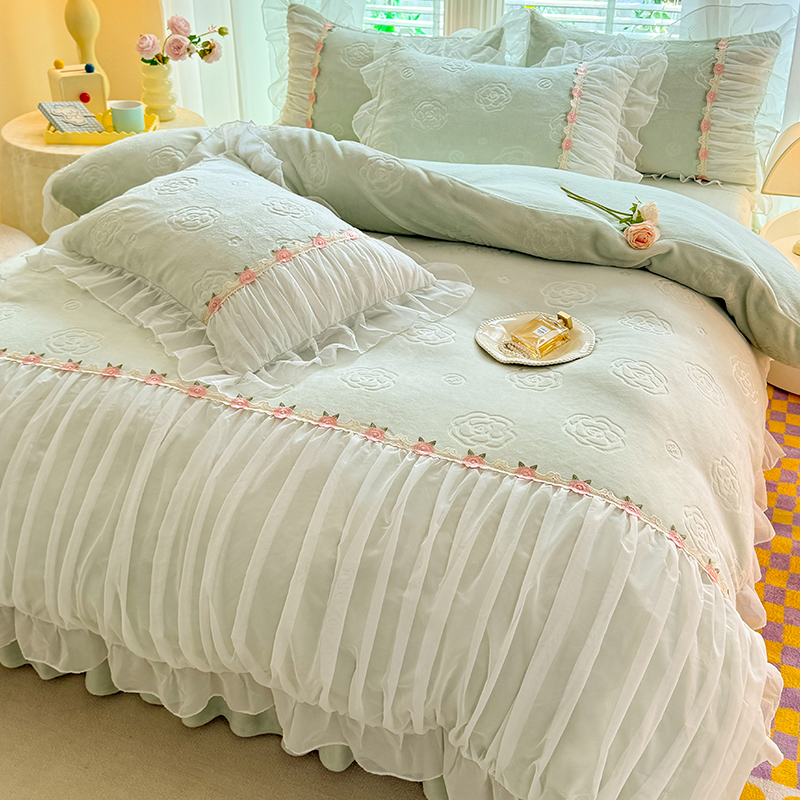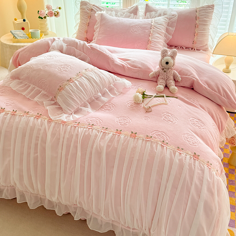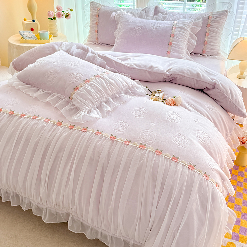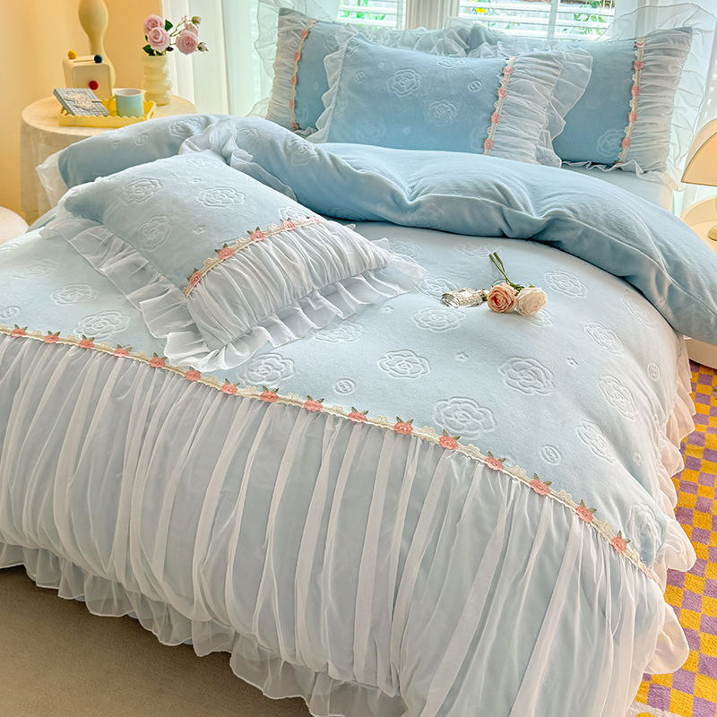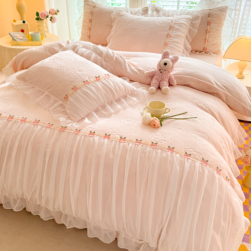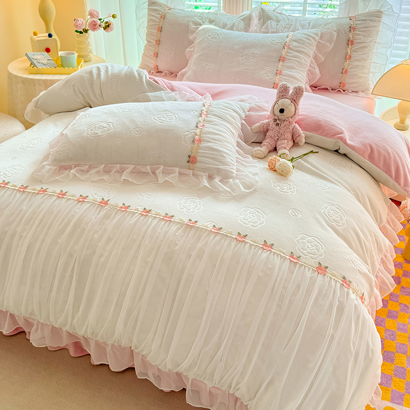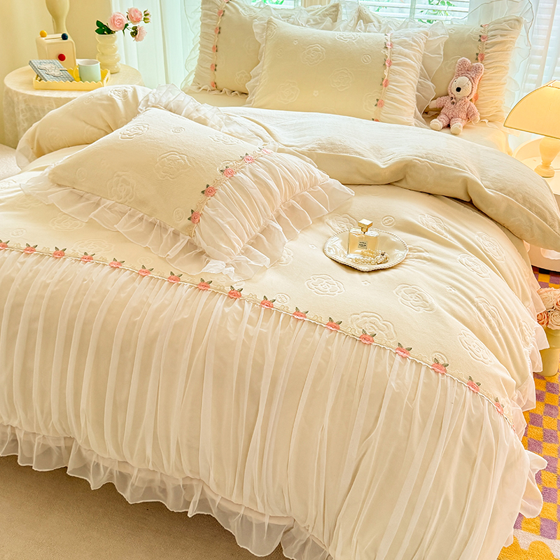 공주 스타일의 양면 우유 벨벳 4 종 침구 겨울 두꺼운 플랜지 산호 벨벳 퀼트 커버 침대 시트