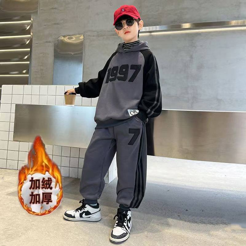 가을과 겨울 어린이 기모 두꺼운 스포츠 세트 중 큰 어린이 패션 유행 후드 스웨트 셔츠 바지 캐주얼 투피스 세트