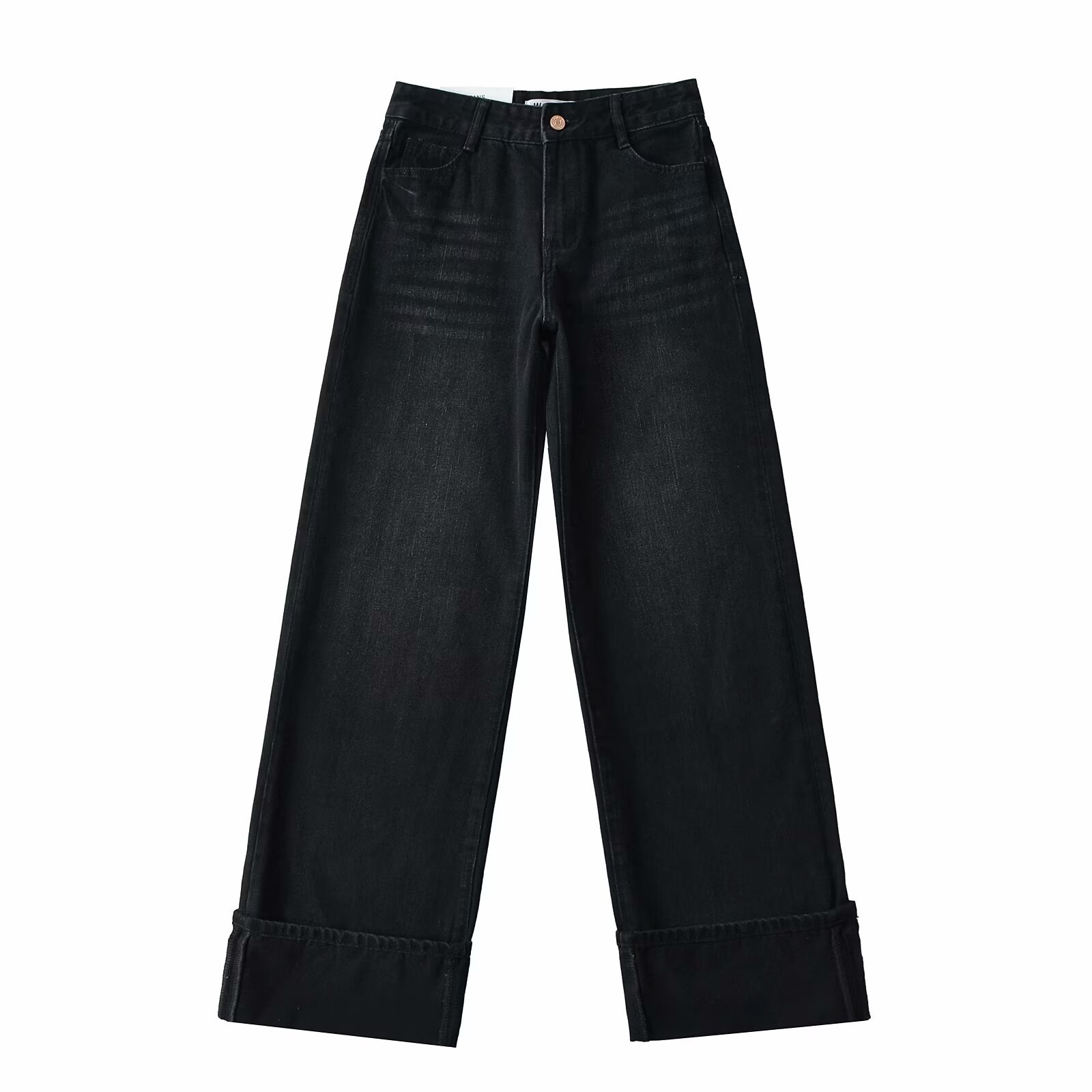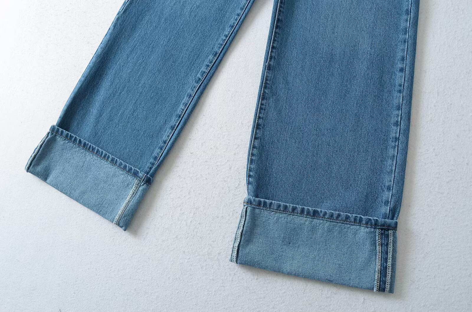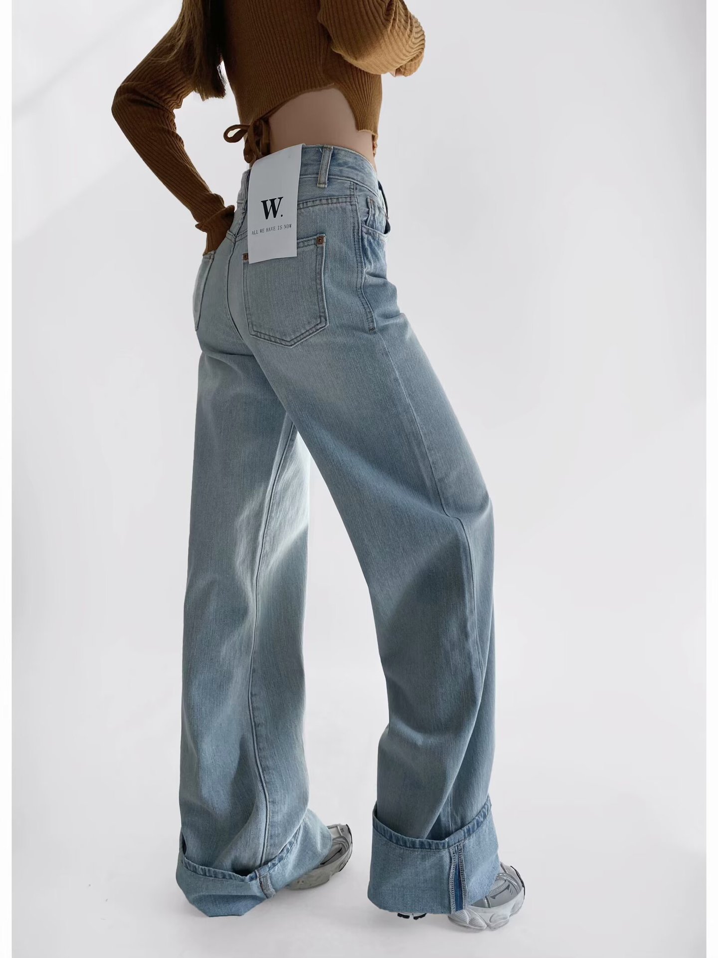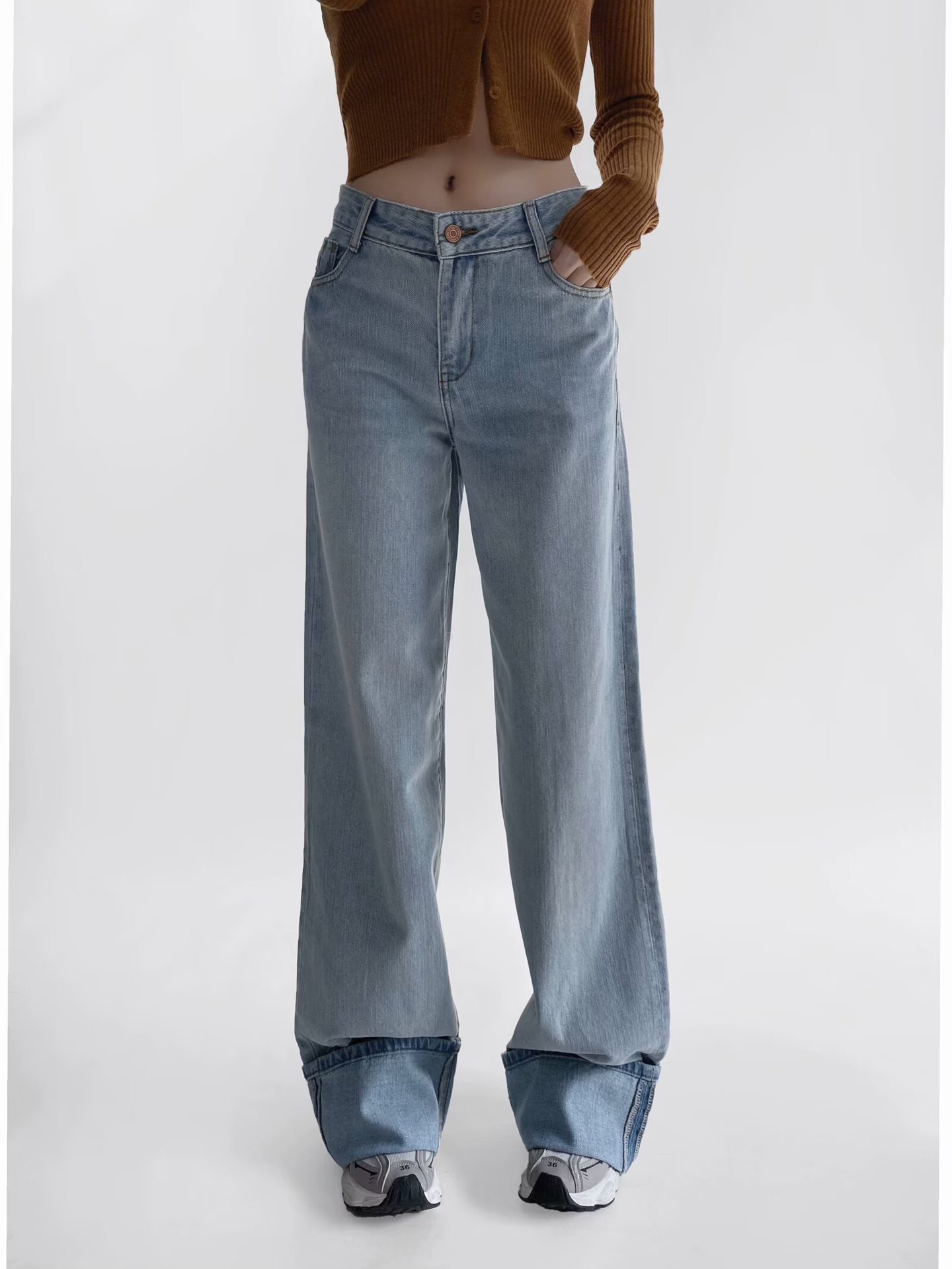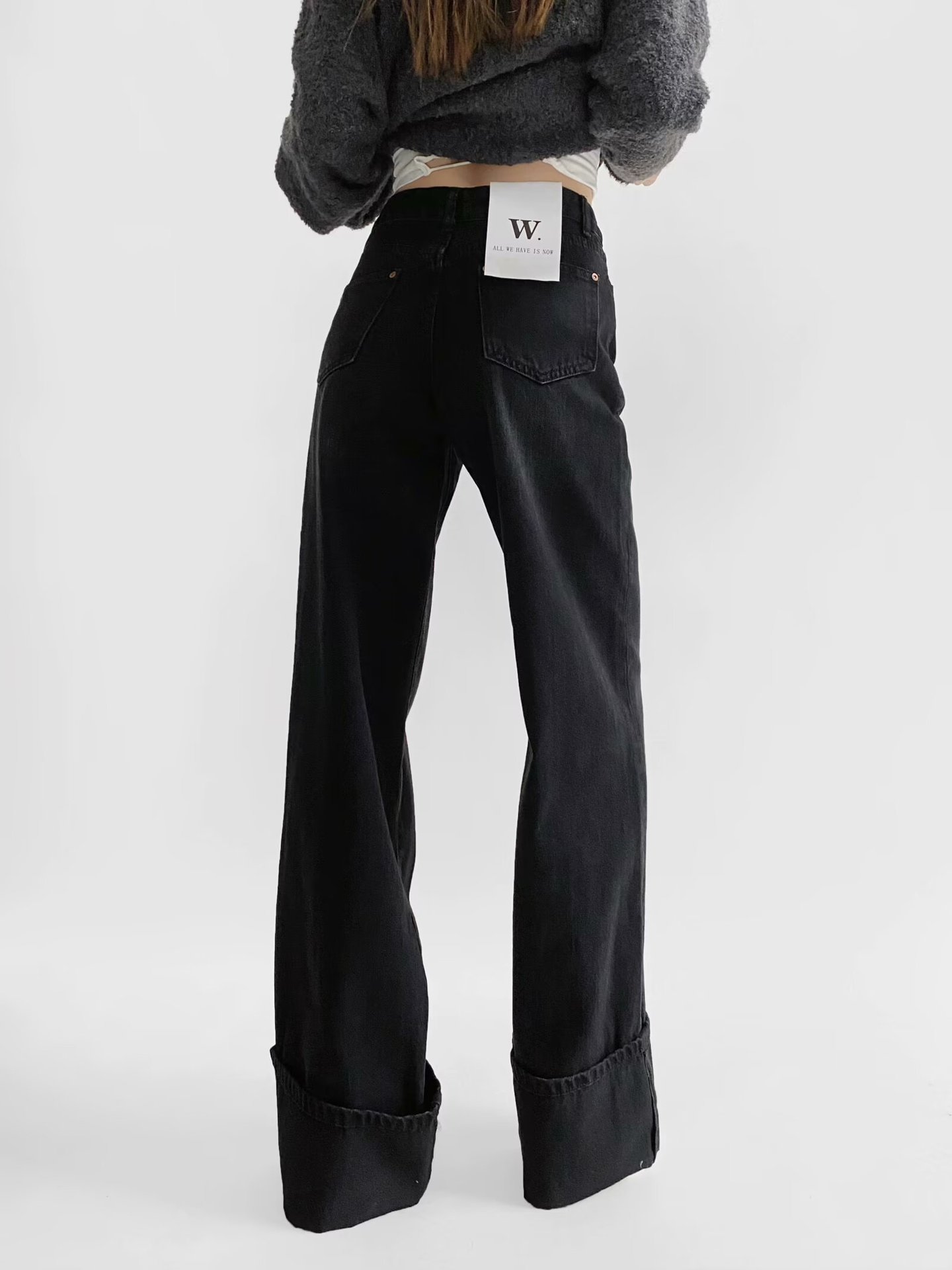 유럽과 미국 스타일의 높은 허리 느슨한 캐주얼 단색 스트레이트 다리 바지 넓은 가장자리 컬링 엑스트라 롱 레트로 스타일 청바지 올매치스토어 가기