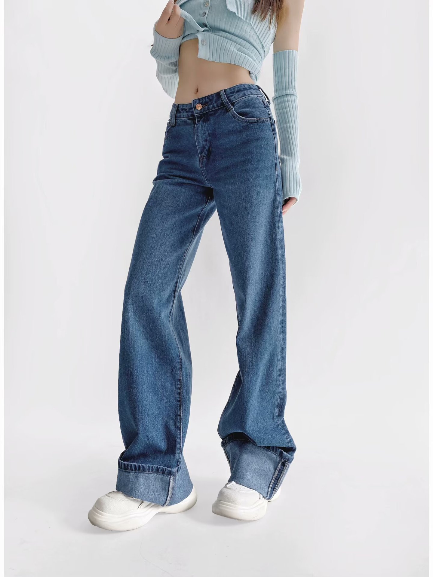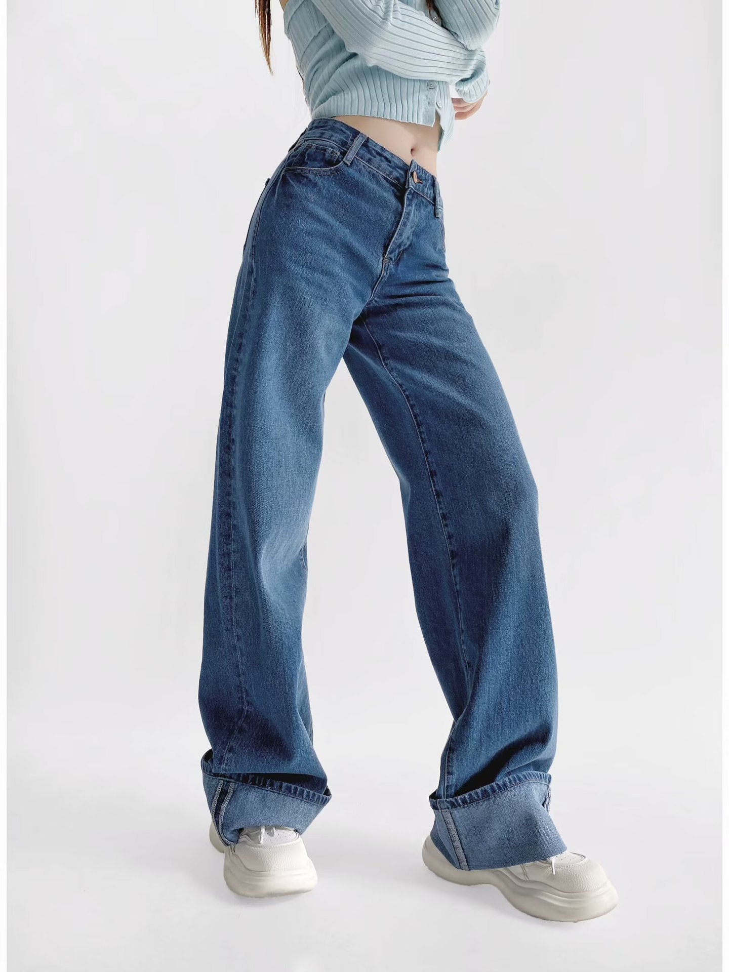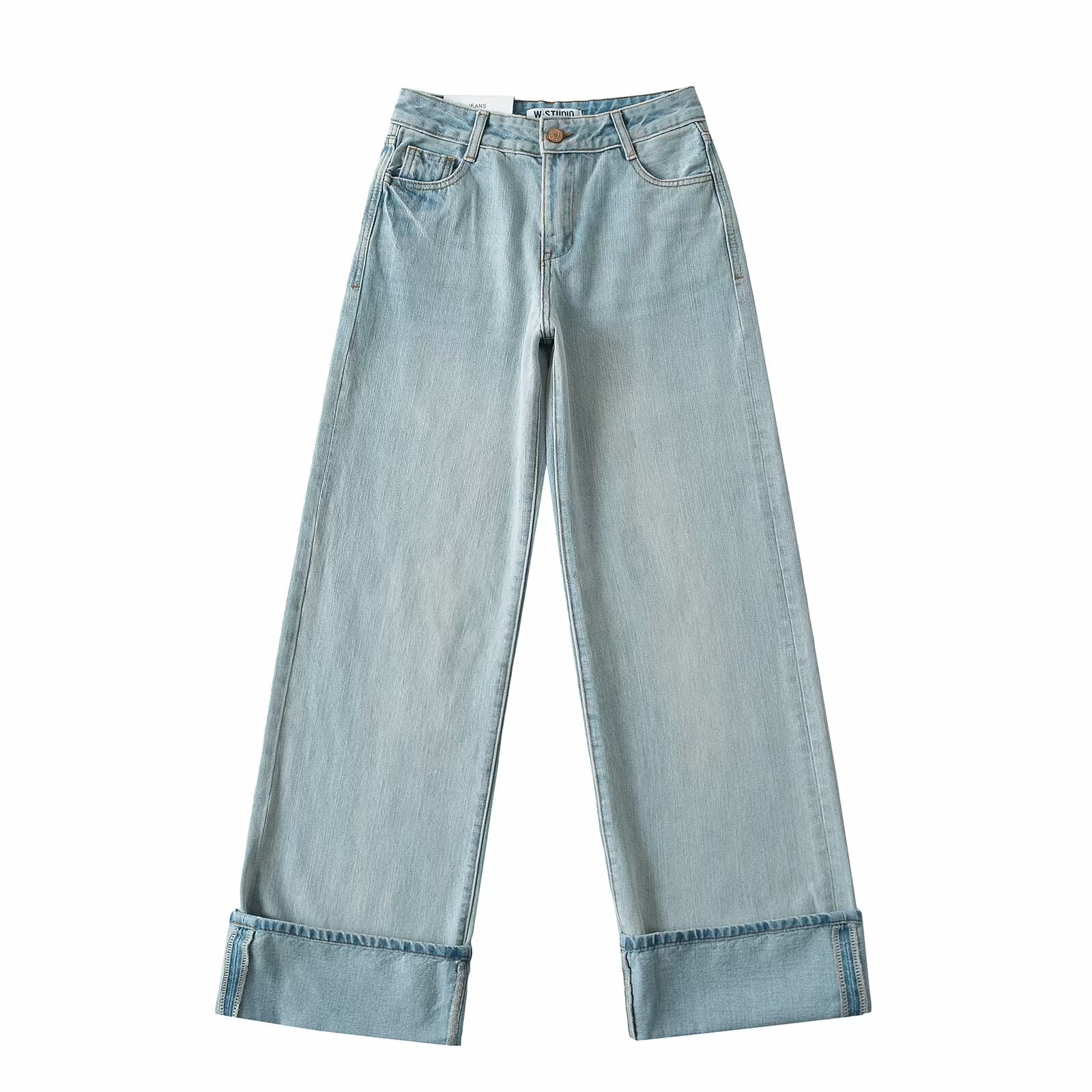 유럽과 미국 스타일의 높은 허리 느슨한 캐주얼 단색 스트레이트 다리 바지 넓은 가장자리 컬링 엑스트라 롱 레트로 스타일 청바지 올매치