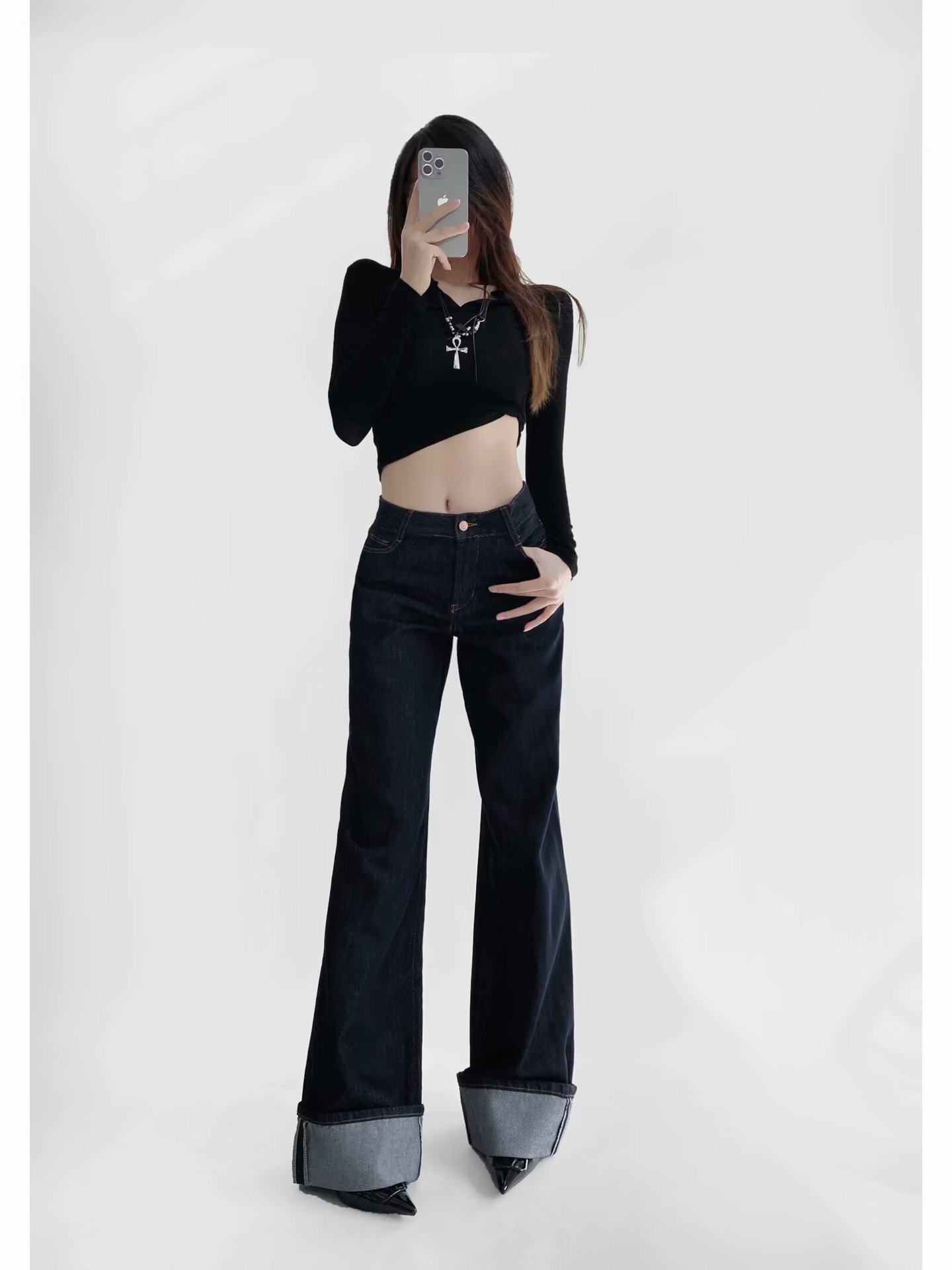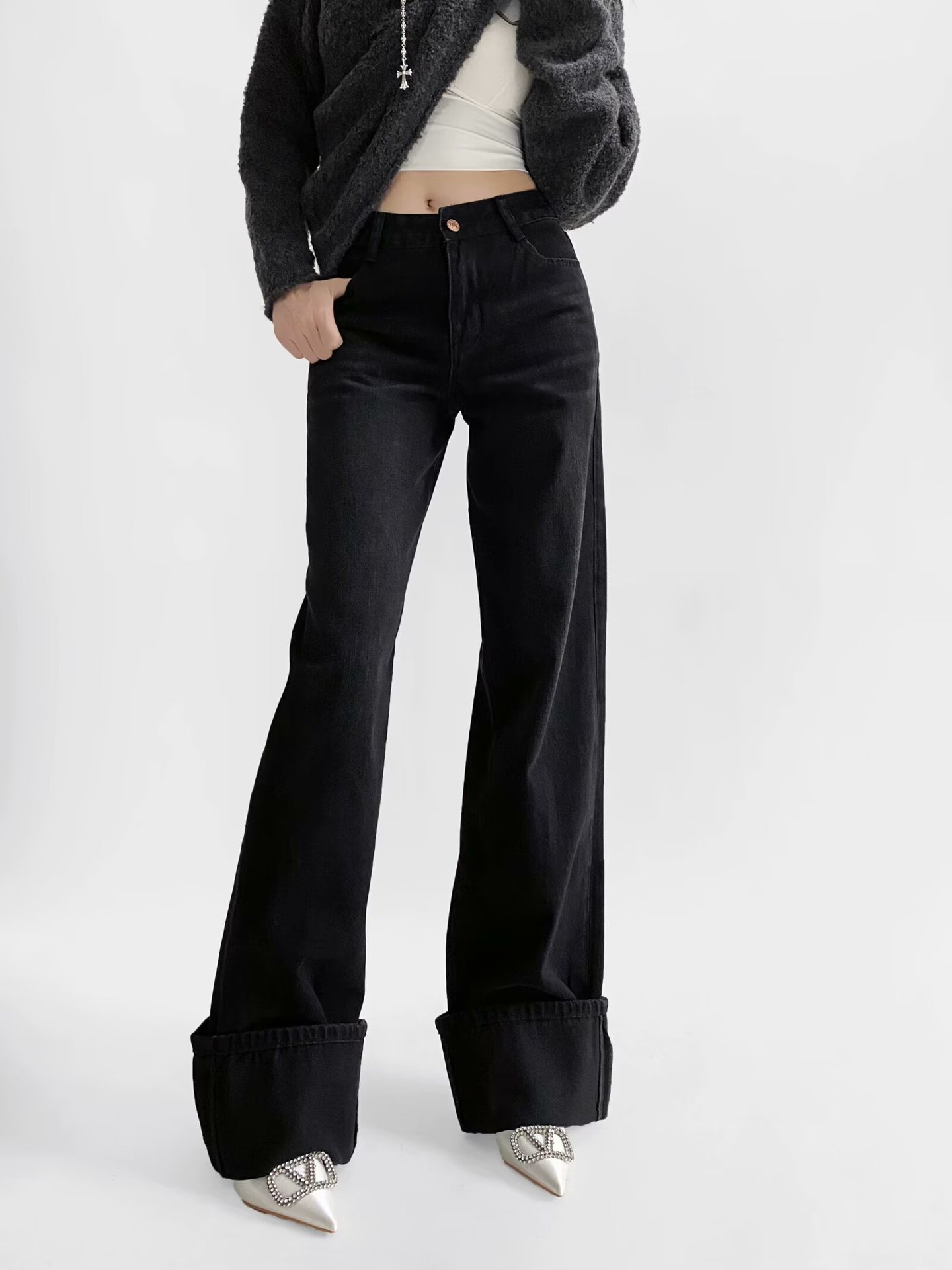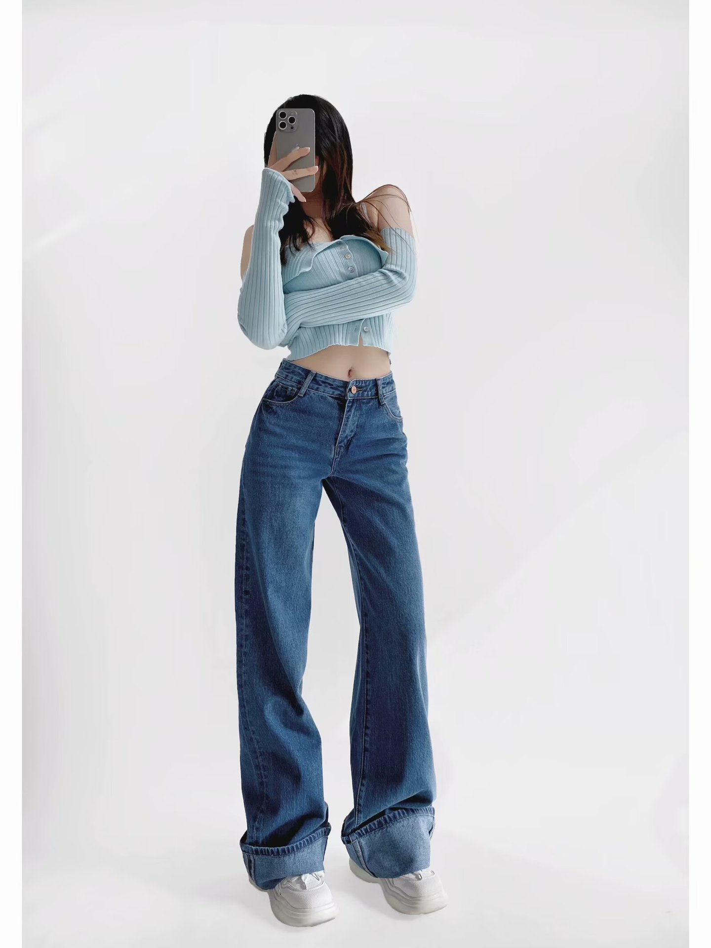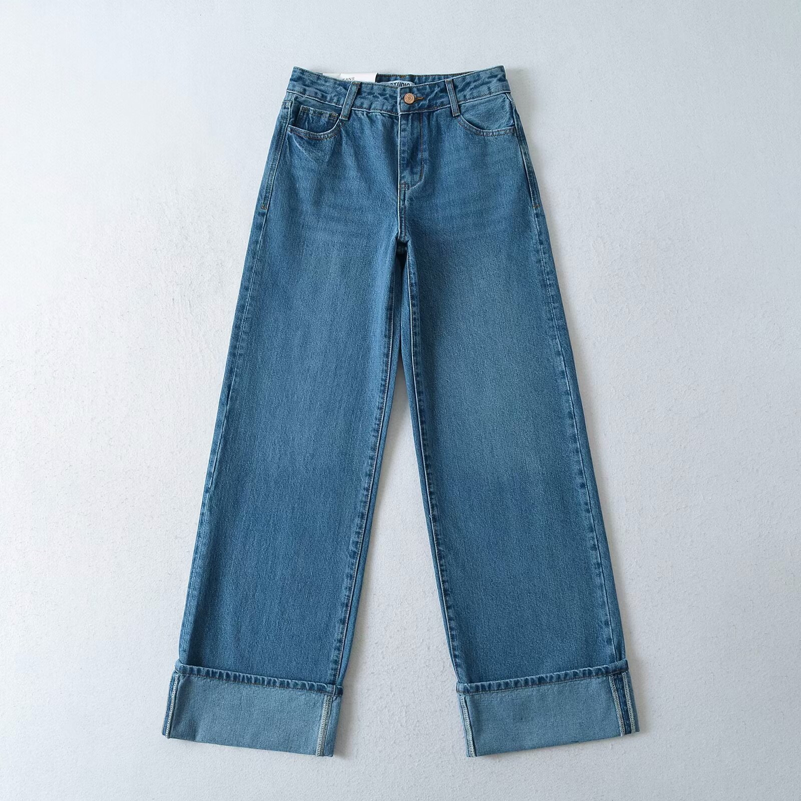 유럽과 미국 스타일의 높은 허리 느슨한 캐주얼 단색 스트레이트 다리 바지 넓은 가장자리 컬링 엑스트라 롱 레트로 스타일 청바지 올매치