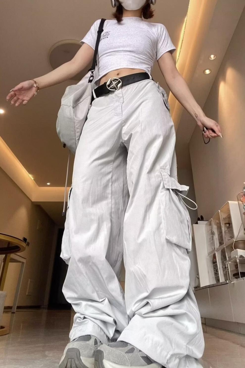 여름 얇은 미국 스타일 느슨한 히팝 바지 오프 화이트 빠른 건조 낙하산 병, 여성을위한 캐주얼 스포츠 작업복 충전