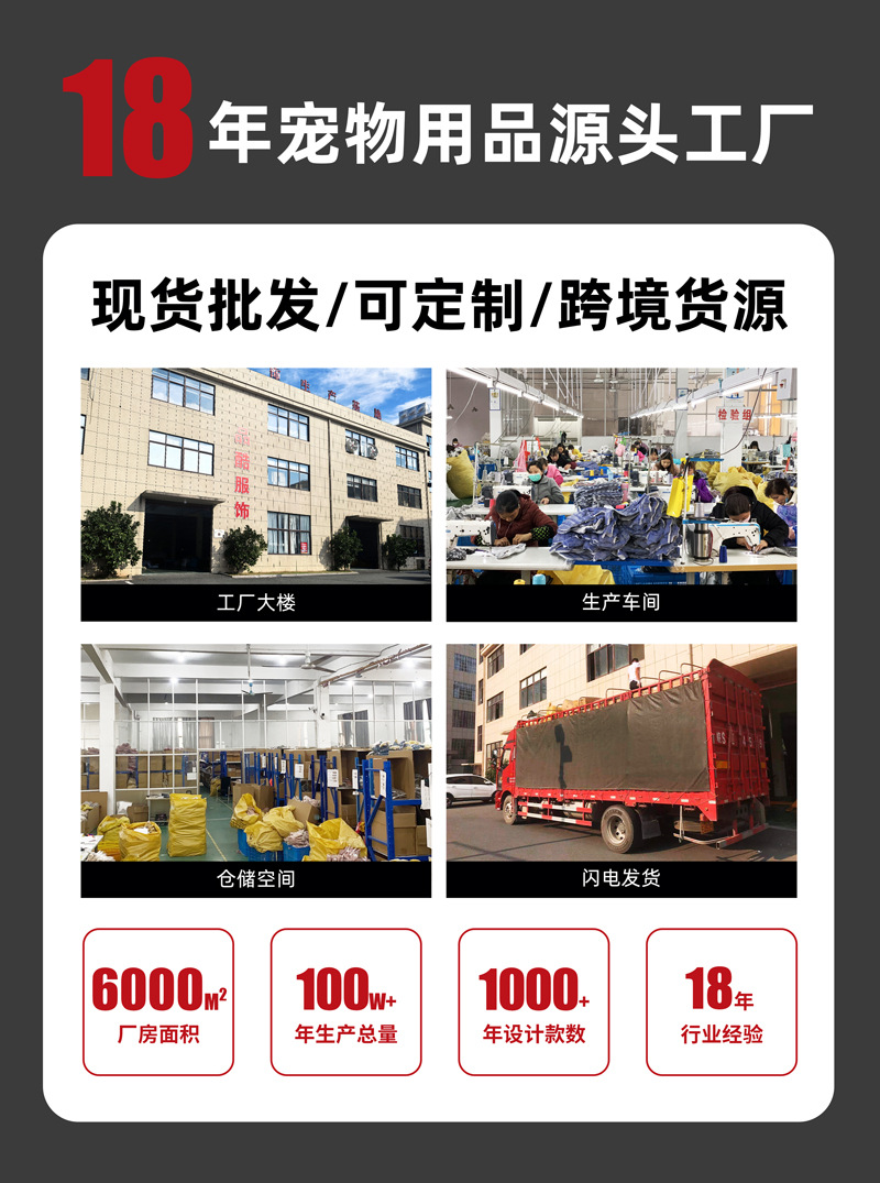 我们提供多种类型的宠物服装,宠物雨衣、冲锋衣、卫衣、裙子、T恤、马甲、毛衣、康复服、安抚衣、救生衣、节日cosplay服装、宠物配饰等及定制款式。