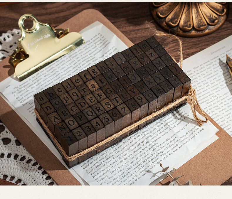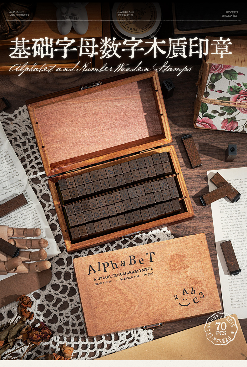 70 개의 복고풍 영숫자 나무 상자 물개 세트 상자 상단 및 하단 문자 일반 바디 잔디 국경 간 손 계정 씰스토어 가기