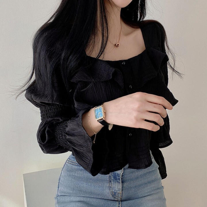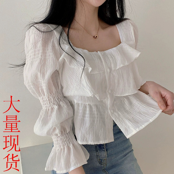 2024 년 초 가을 새로운 한국 스타일 프랑스 스타일 칼라 쉬폰 셔츠 달콤한 뿔 소매 우아한 셔츠 짧은 상단