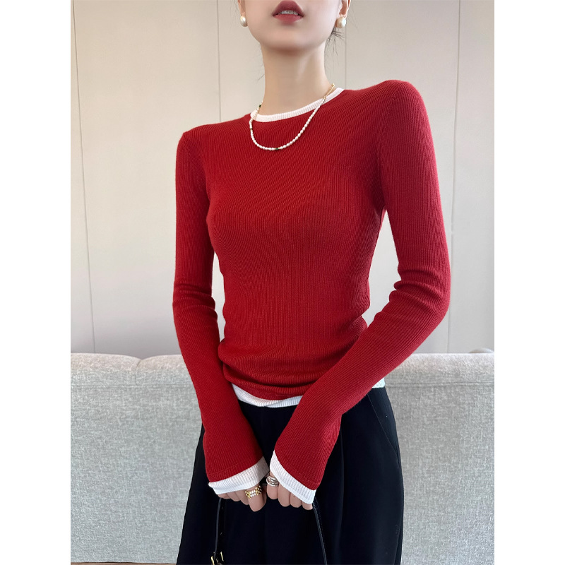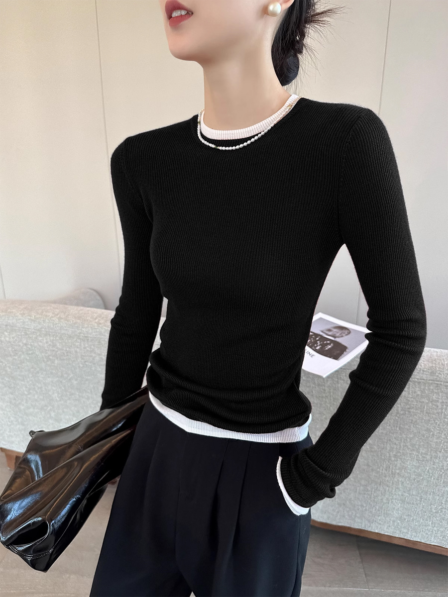 블랙 콘트라스트 컬러 크루 넥 긴팔 니트웨어 여성용 겨울 2024 새로운 세련된 간단한 우아한베이스 스웨터스토어 가기