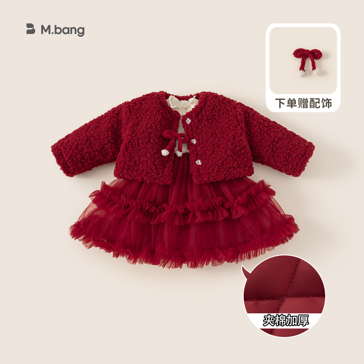 Bangxuan 소녀의 새로운 겨울 새해 인사 모피 코트 메쉬 공주 드레스 딸 스타일 두꺼운 빨간 드레스스토어 가기