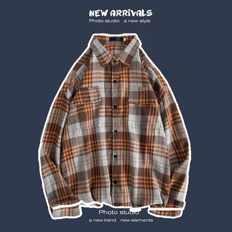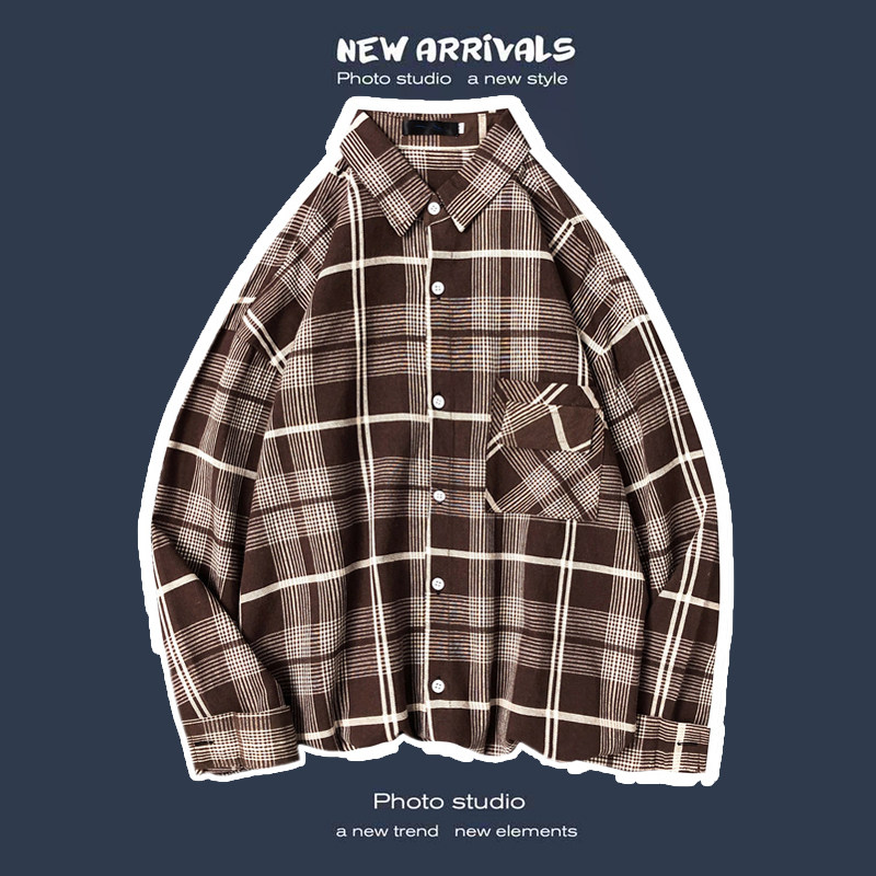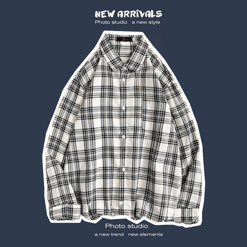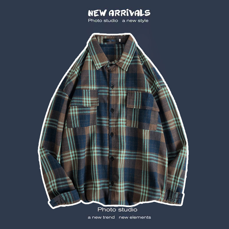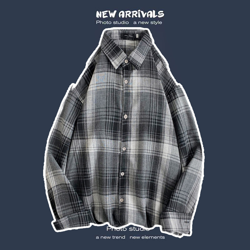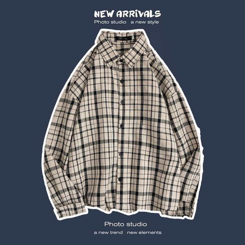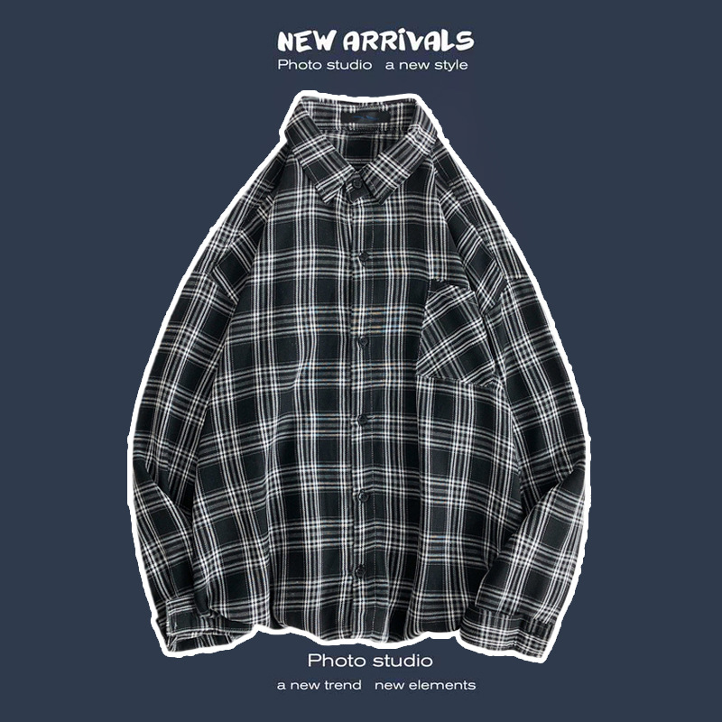 봄과 가을 셔츠 남자 유행 캐주얼 느슨한 긴팔 셔츠 홍콩 스타일 올 매치 커플의 빈티지 격자 자켓